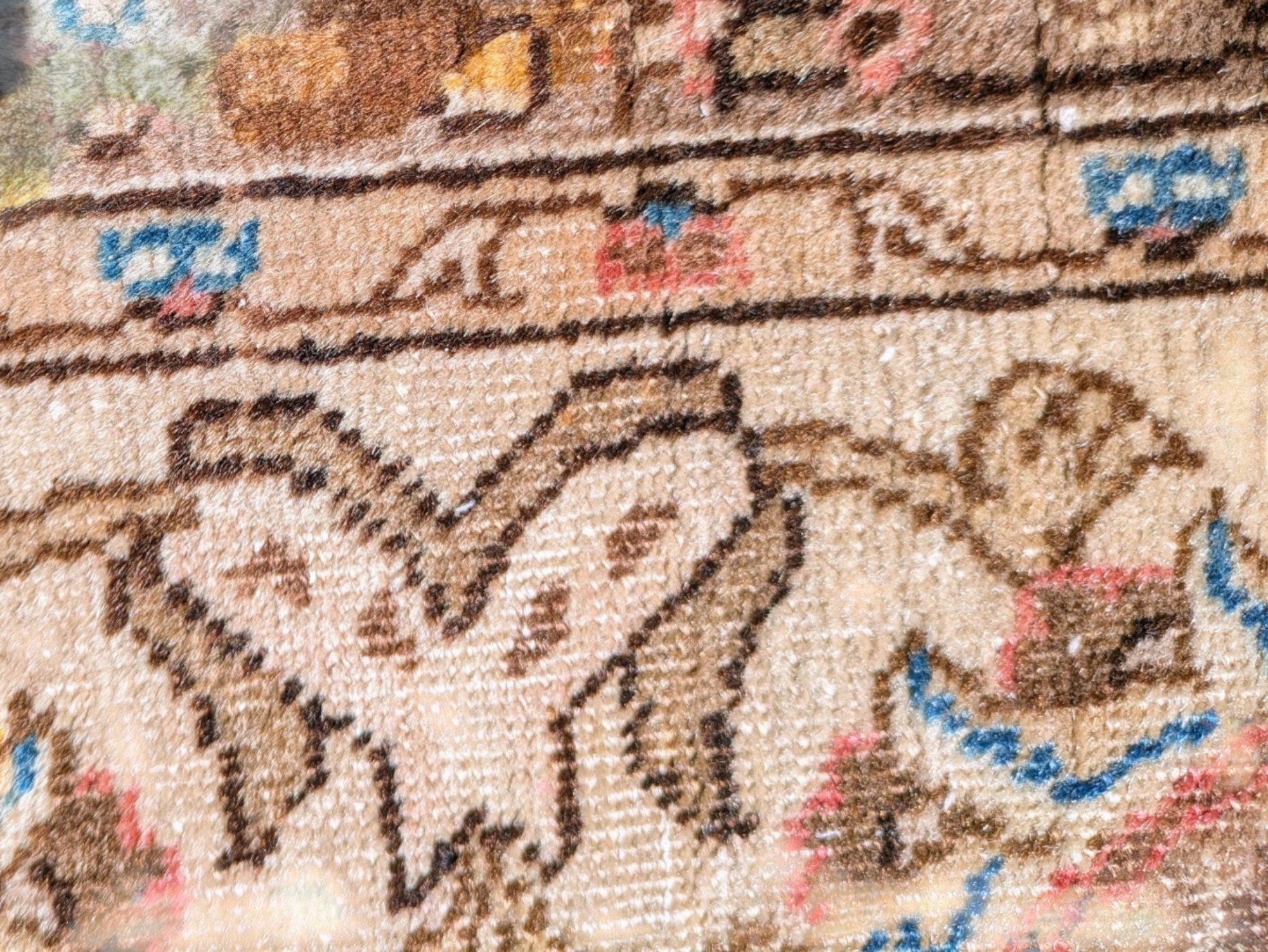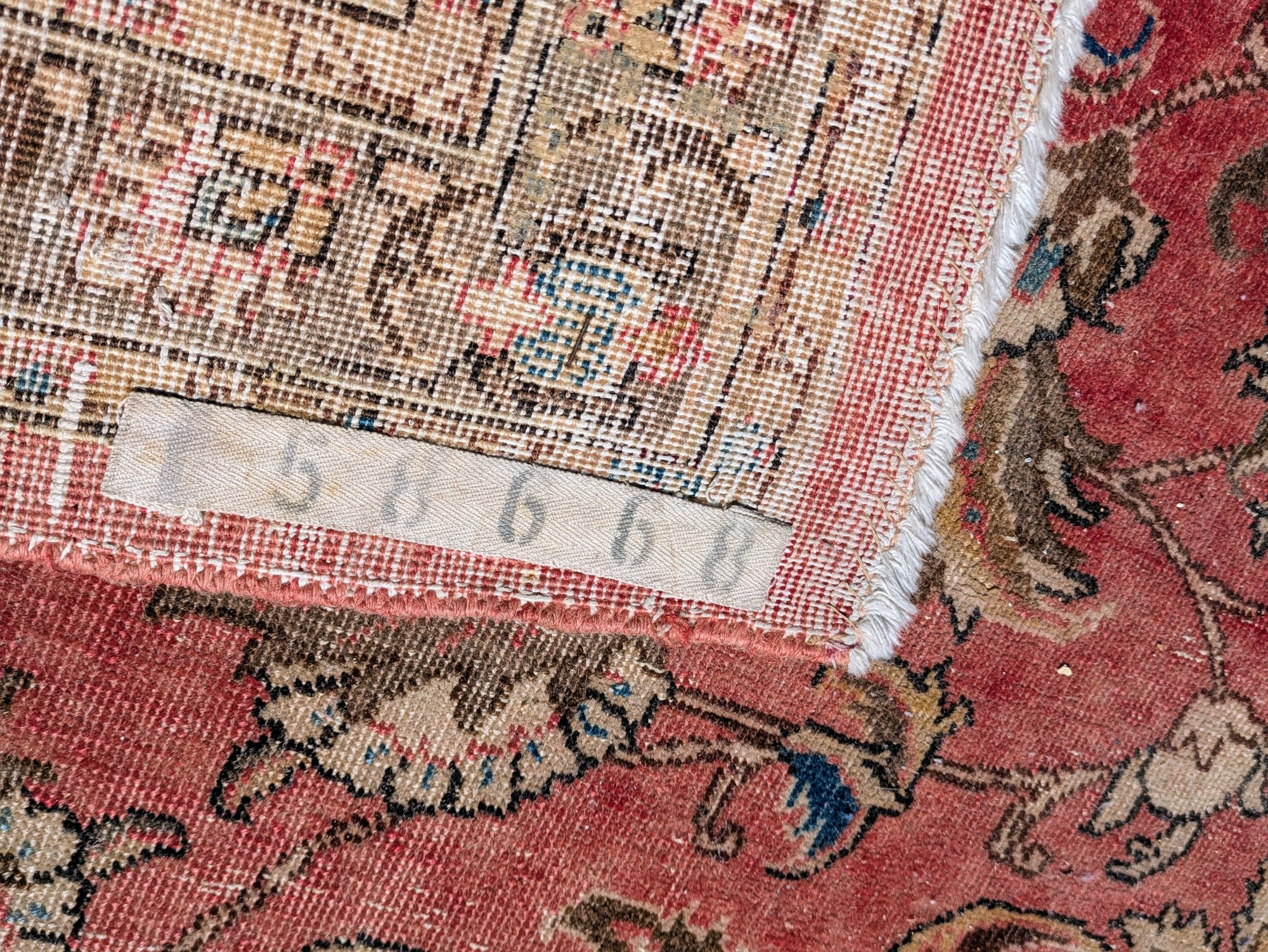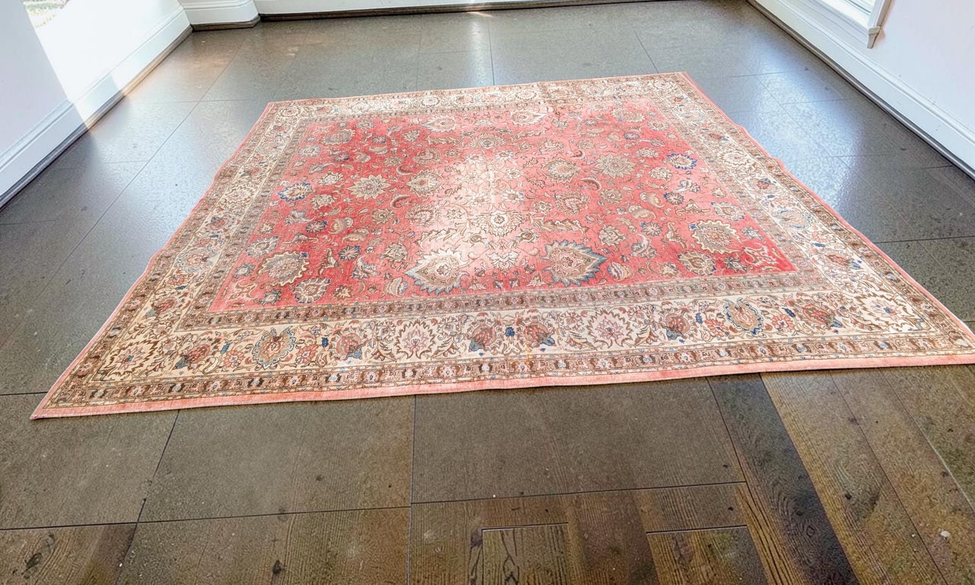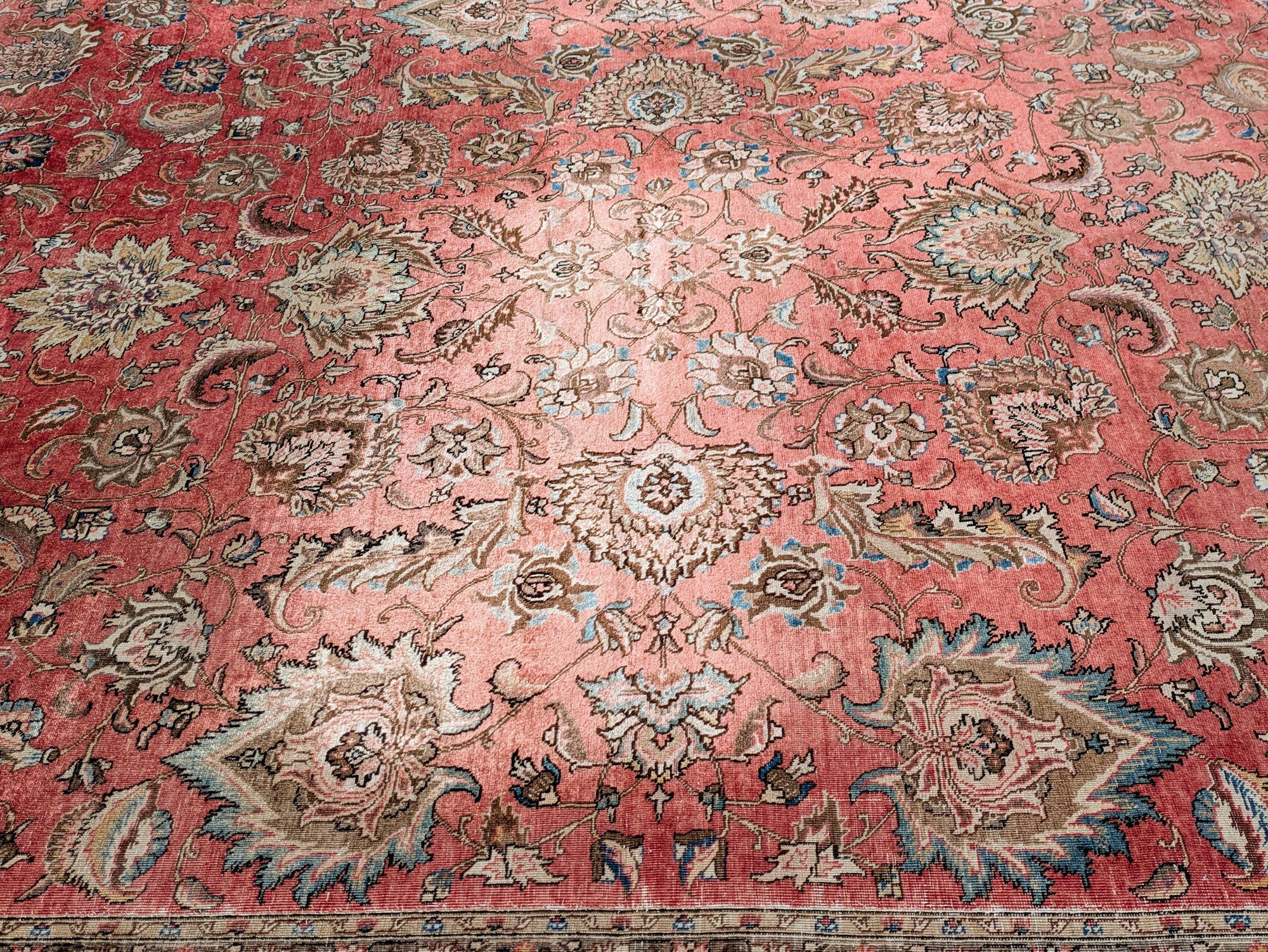 Features a traditional floral medallion pattern in red, beige, and blue tones. Shows wear and fading areas, consistent with age, use, and placement in the home. Still in Pretty Good Condition for its Age. Please see all photos as part of the description and condition.