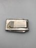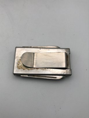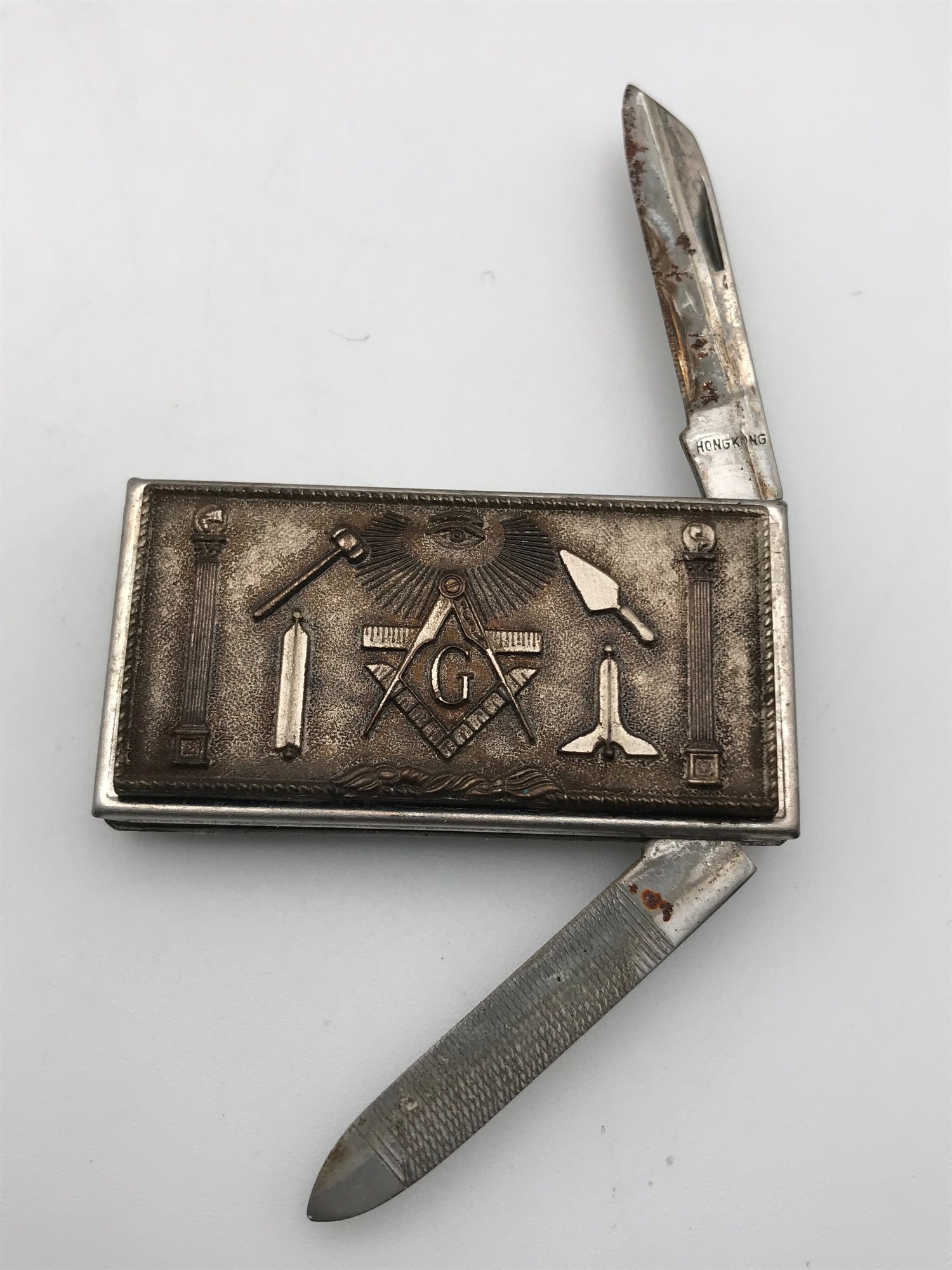 Masonic Folding Pocket Tool: A rectangular silver-toned folding case featuring embossed Freemasonry symbols (Square and Compasses, G, Level, and Trowel). Includes a pen blade and file tool. Marked "Hong Kong."