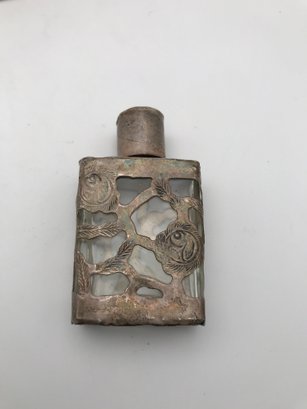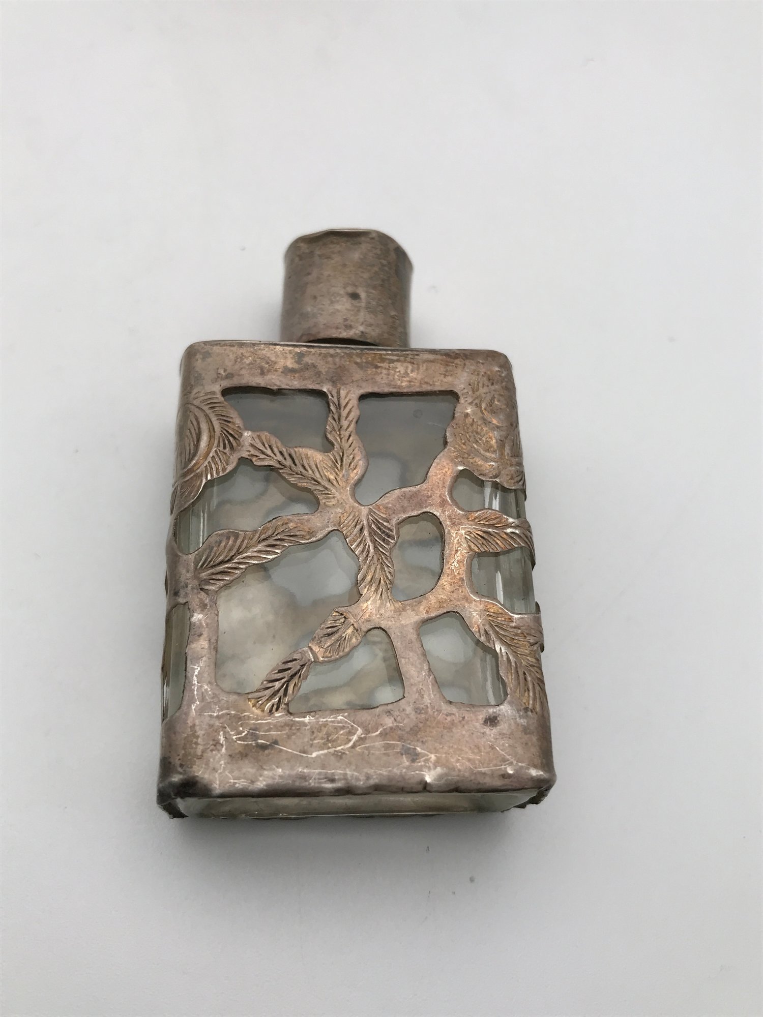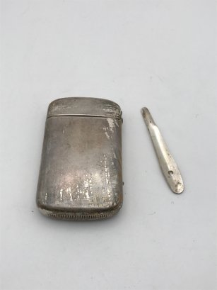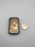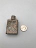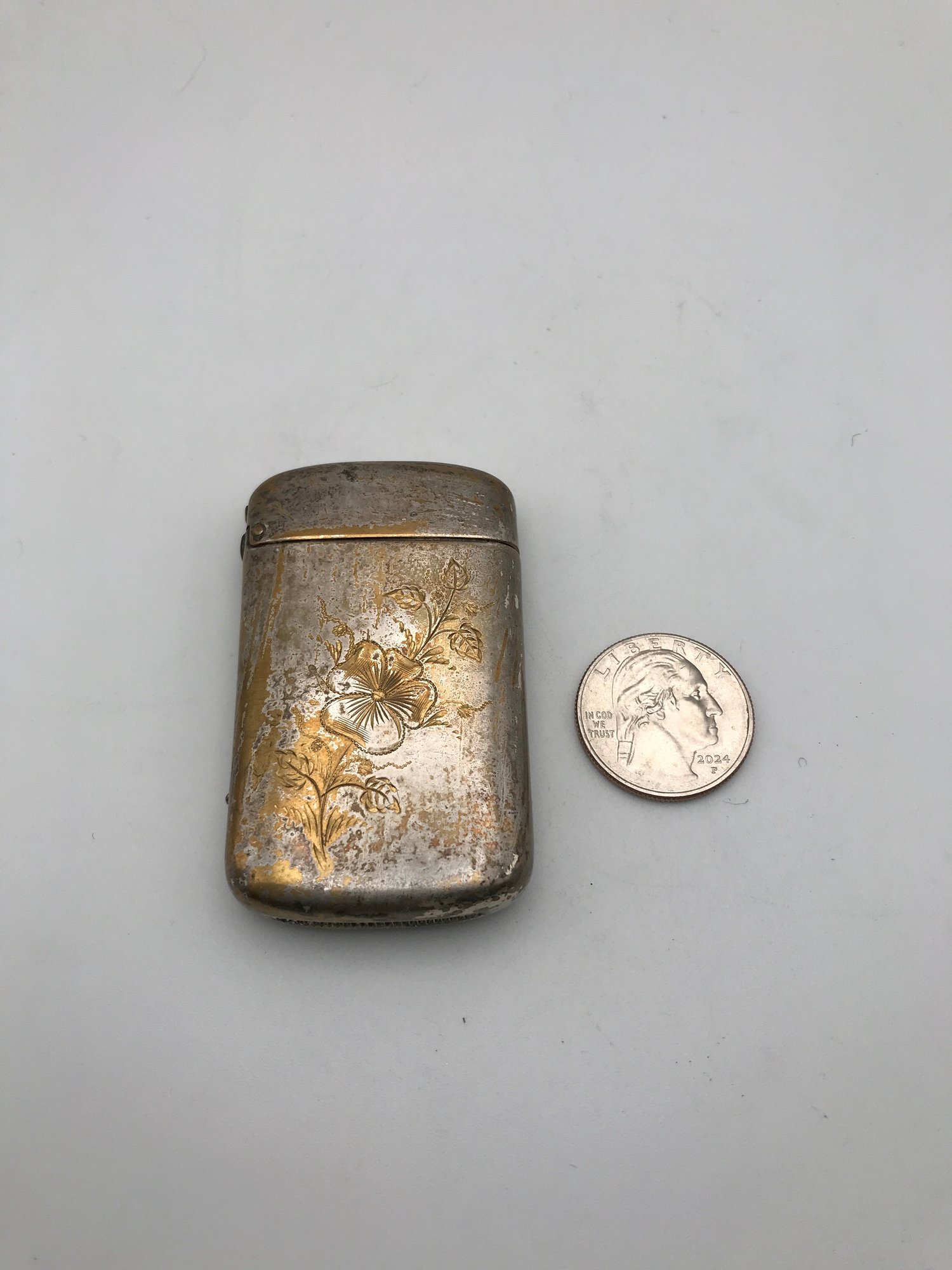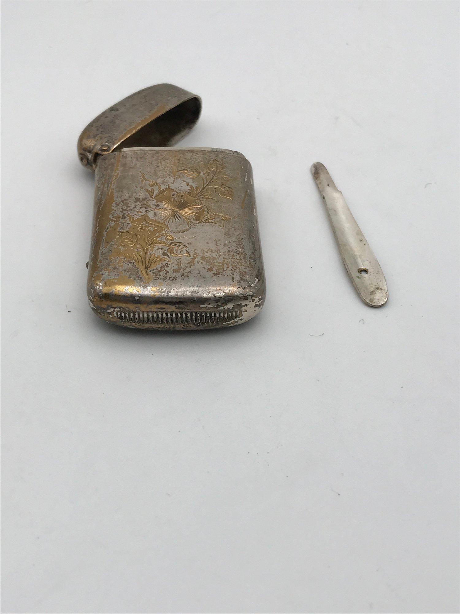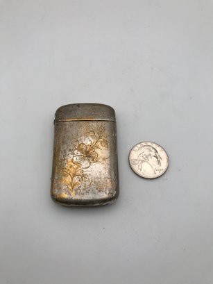 Art Nouveau Style Vesta Case (Match Safe): A hinged metal case with embossed floral/hibiscus designs. Shows an aged patina with gold-tone accents and a textured striker plate on the bottom.