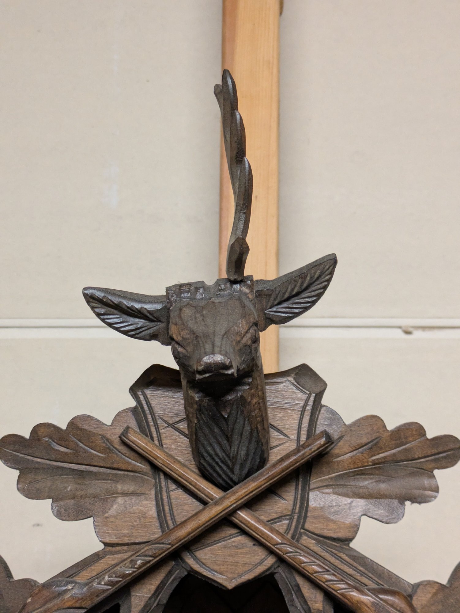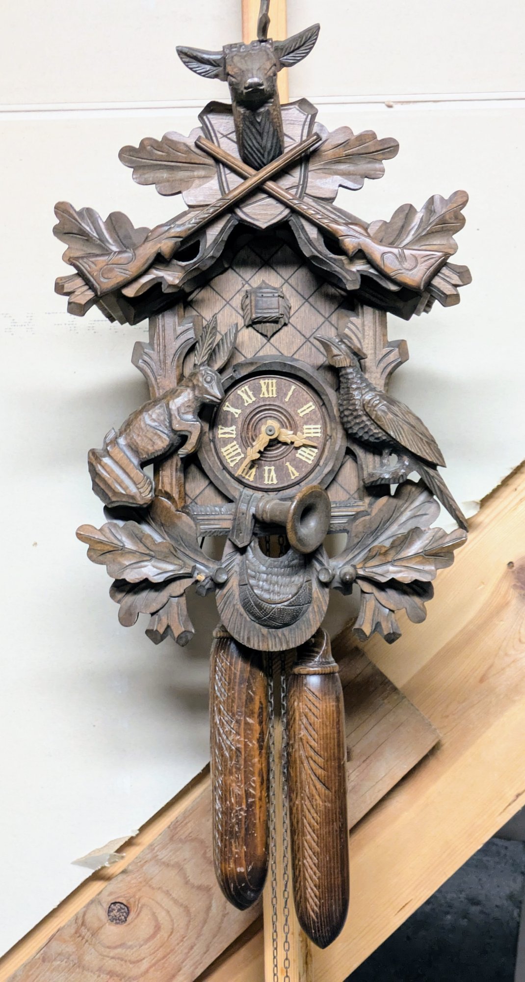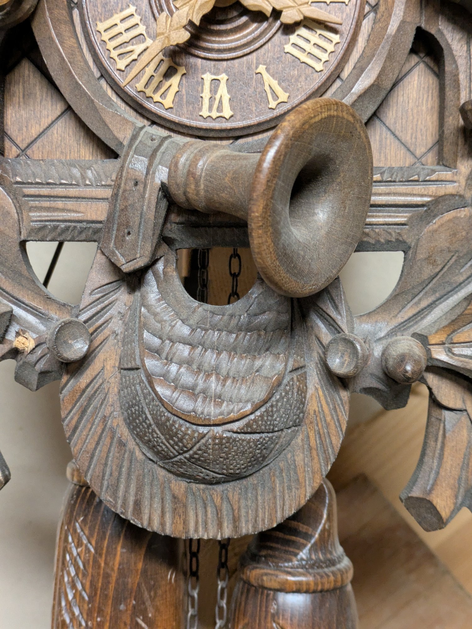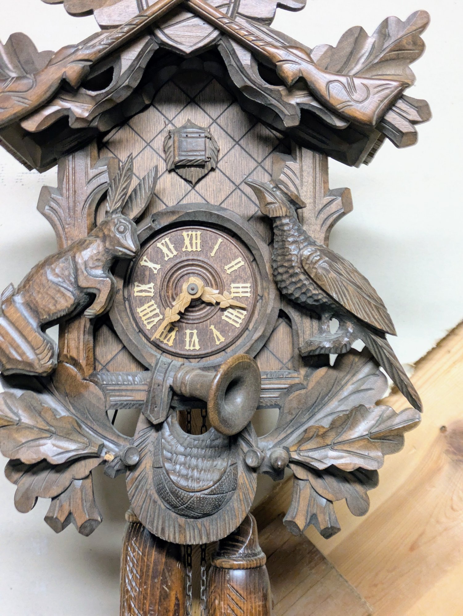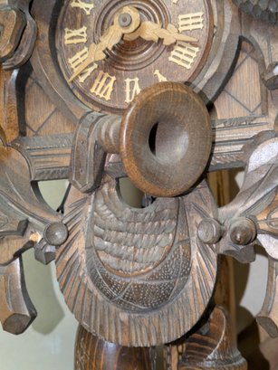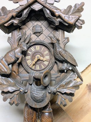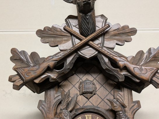 Traditional German Black Forest Cuckoo Clock With A Hunting Theme. The clock features hand-carved oak leaves, a bird on the right, and a rabbit on the left. A hunter's horn encircles the clock dial. There is a Stag Head at the Top (One Antler is Broken off) with Crossed Rifles at the Base. The door on the clock does not always stay closed, the Stag head is a little loose, and an acorn is missing from the leaf detail. Overall, Still Very Good Antique/Vintage Condition. 12"W x 20" H x 9"D