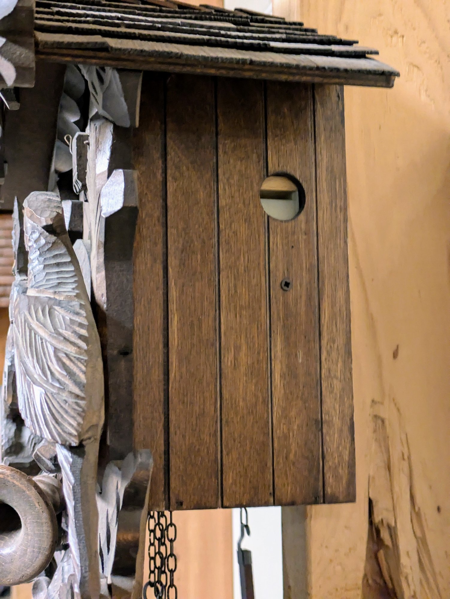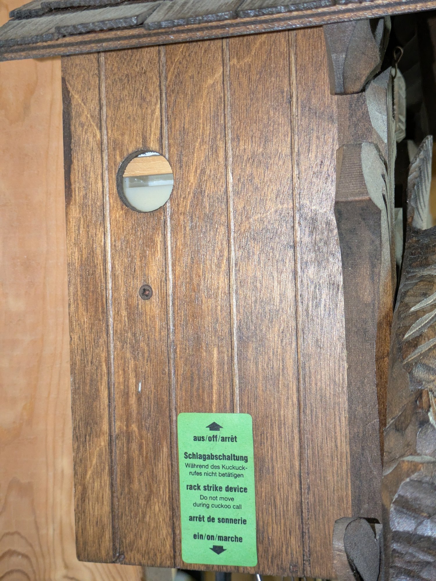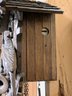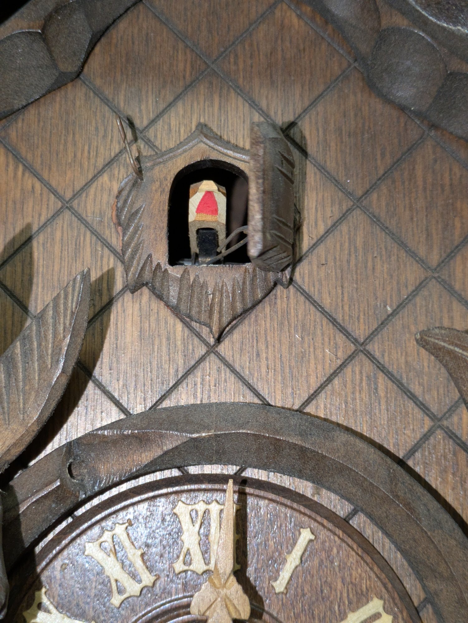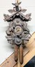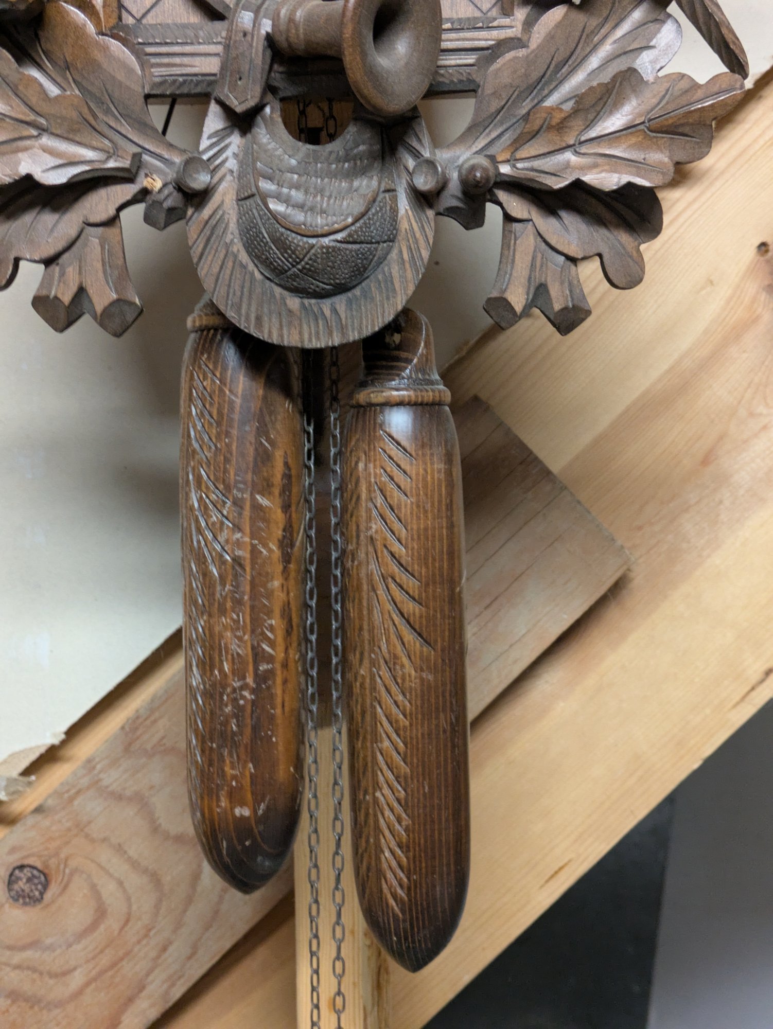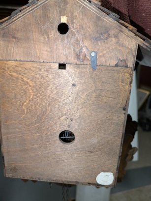 Traditional German Black Forest Cuckoo Clock With A Hunting Theme. The clock features hand-carved oak leaves, a bird on the right, and a rabbit on the left. A hunter's horn encircles the clock dial. There is a Stag Head at the Top (One Antler is Broken off) with Crossed Rifles at the Base. The door on the clock does not always stay closed, the Stag head is a little loose, and an acorn is missing from the leaf detail. Overall, Still Very Good Antique/Vintage Condition. 12"W x 20" H x 9"D