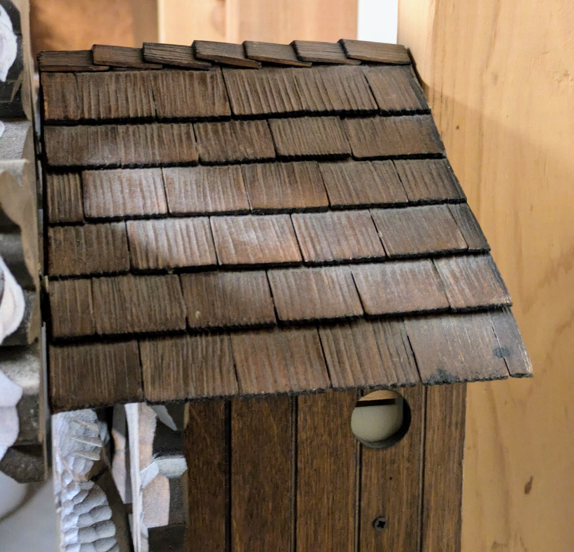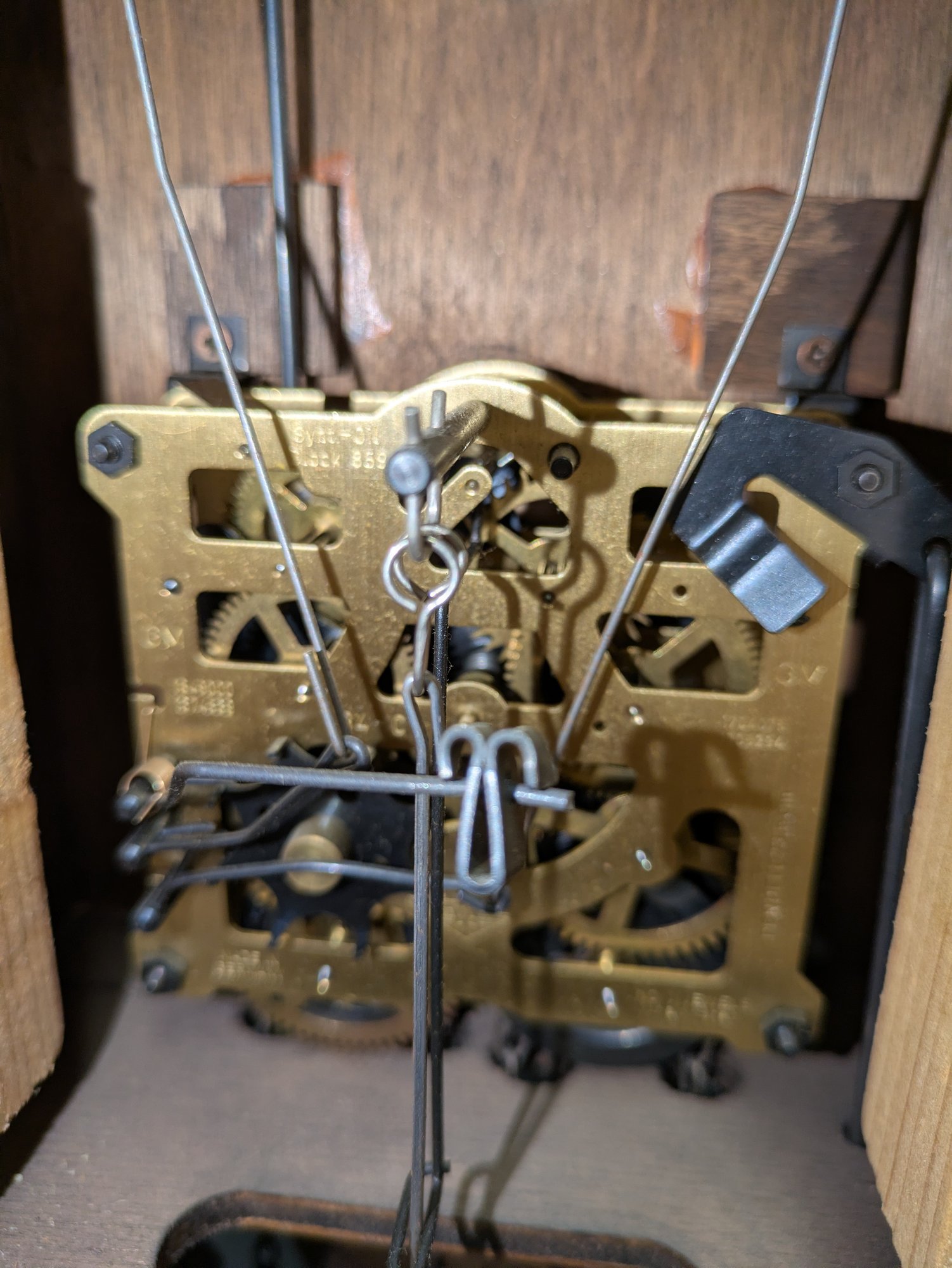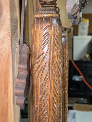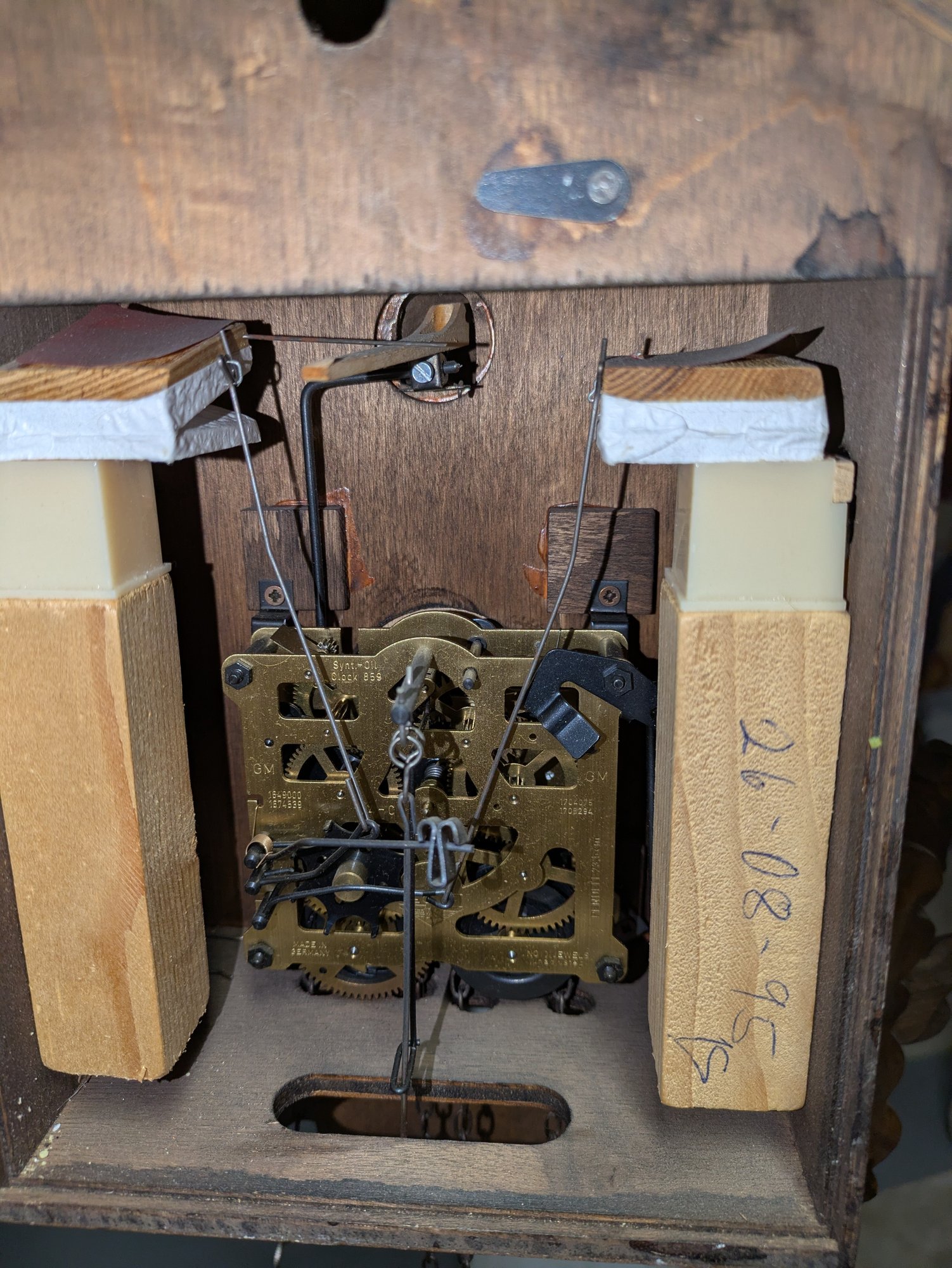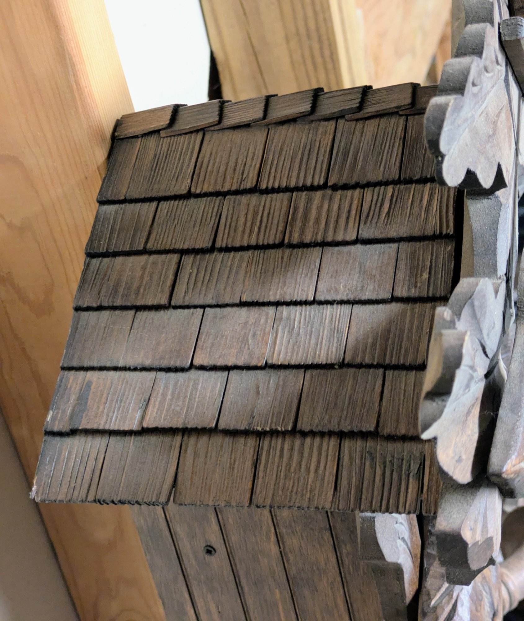 Traditional German Black Forest Cuckoo Clock With A Hunting Theme. The clock features hand-carved oak leaves, a bird on the right, and a rabbit on the left. A hunter's horn encircles the clock dial. There is a Stag Head at the Top (One Antler is Broken off) with Crossed Rifles at the Base. The door on the clock does not always stay closed, the Stag head is a little loose, and an acorn is missing from the leaf detail. Overall, Still Very Good Antique/Vintage Condition. 12"W x 20" H x 9"D