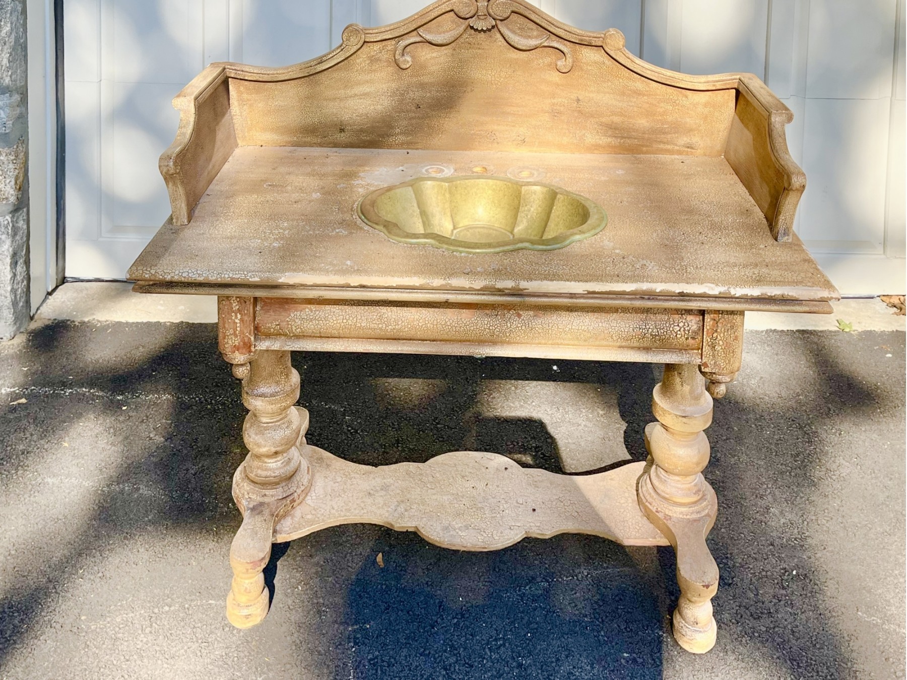 Very cool antique table turned into bathroom vanity. Just needs faucets and plumbing! Great way to add antique style to a bathroom.
