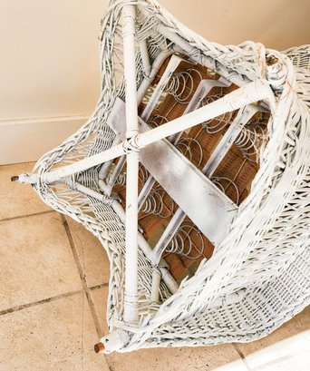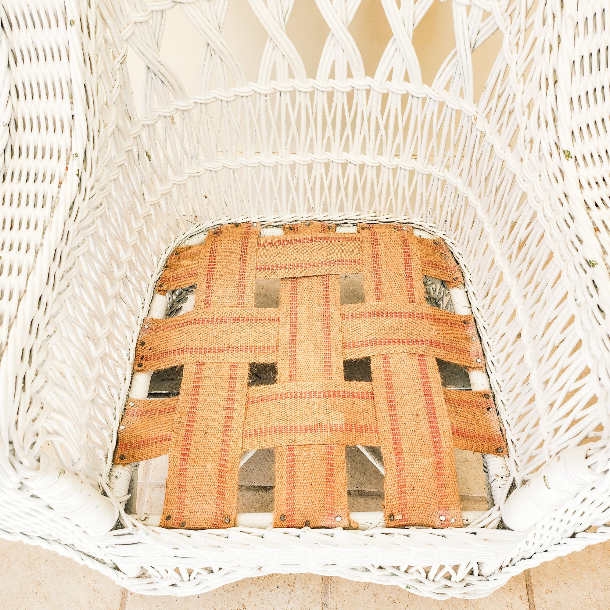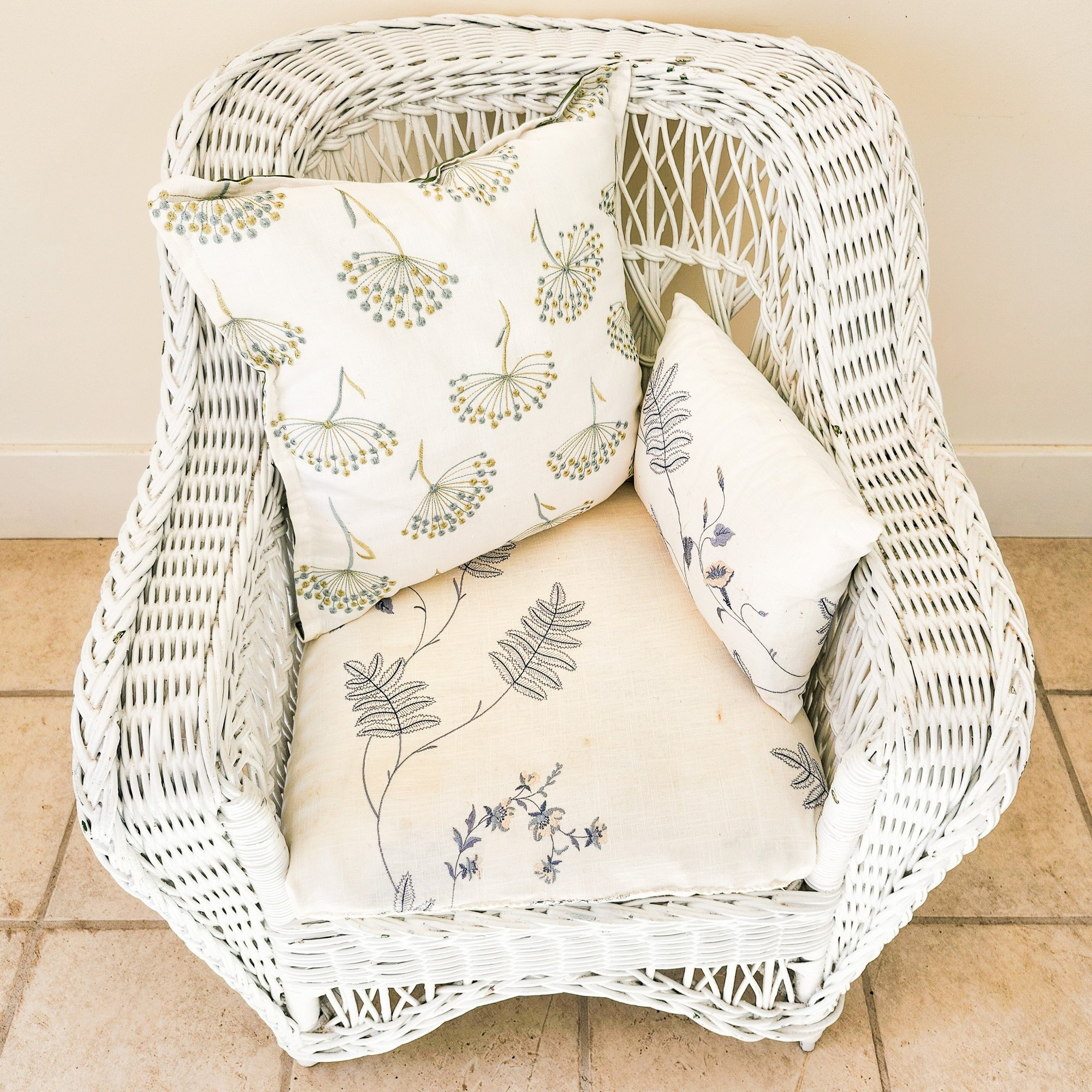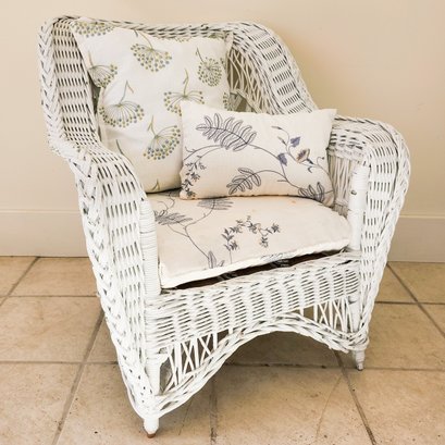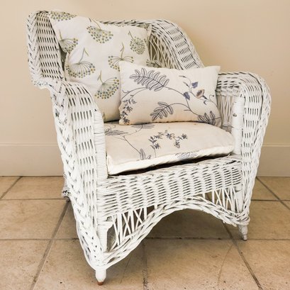 Pretty white antique porch chair with upholstered cushions.