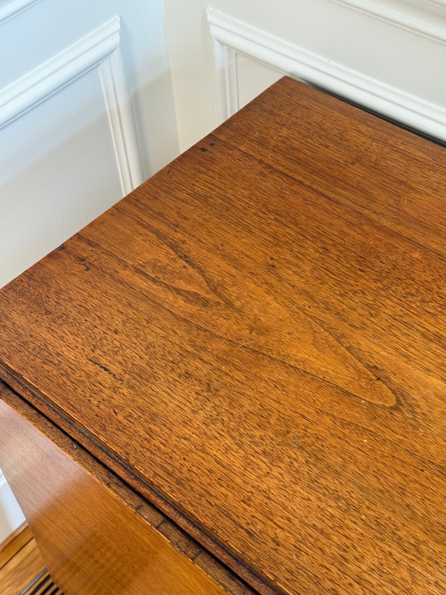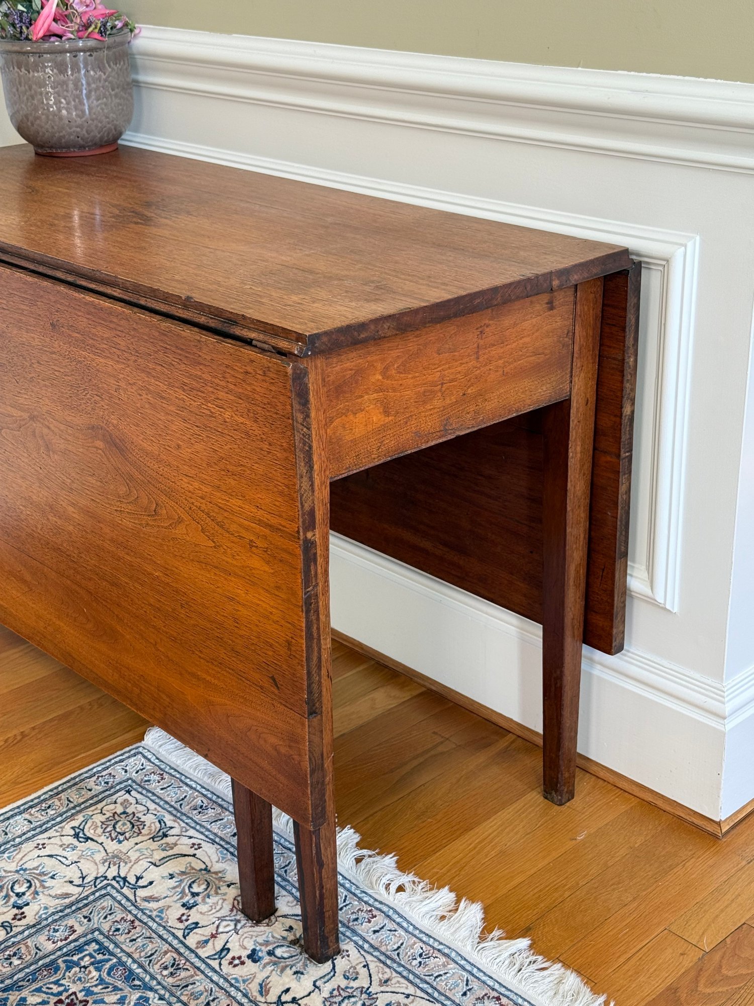 A timeless and versatile piece, this antique wood dining table features clean lines and gently tapered legs, offering a refined silhouette suited for both traditional and modern interiors. The drop-leaf design allows for flexible use — compact when lowered and generously sized when extended — making it ideal for smaller spaces or multifunctional rooms. The warm wood grain and classic finish highlight the natural character of the piece. Perfect as a dining table, console, or workspace.