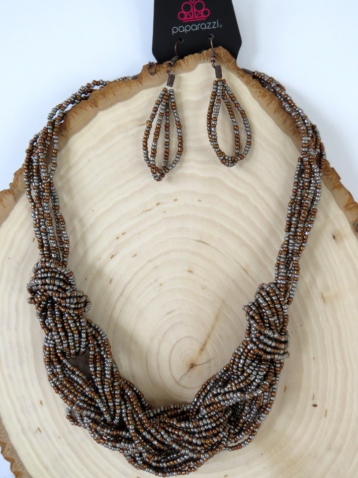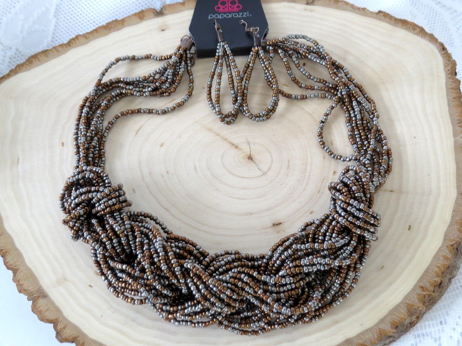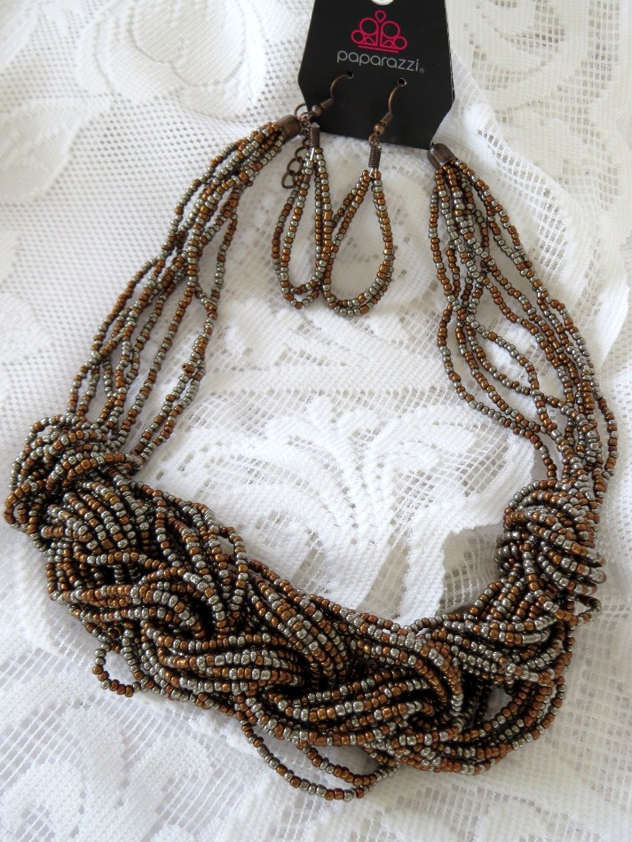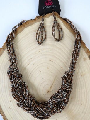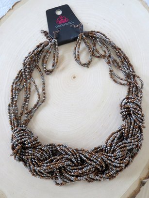 Wonderful copper and gun metal gray colored seed bead create this 2 piece set by paparazzi. The necklace is a multi-strand partially braided style with a length extended and working lobster claw clasp. Measures 16" in length without the extender. The French wire beaded hoop dangle earrings measure 2.5" long. Set is still in original package and appears to have never been worn.