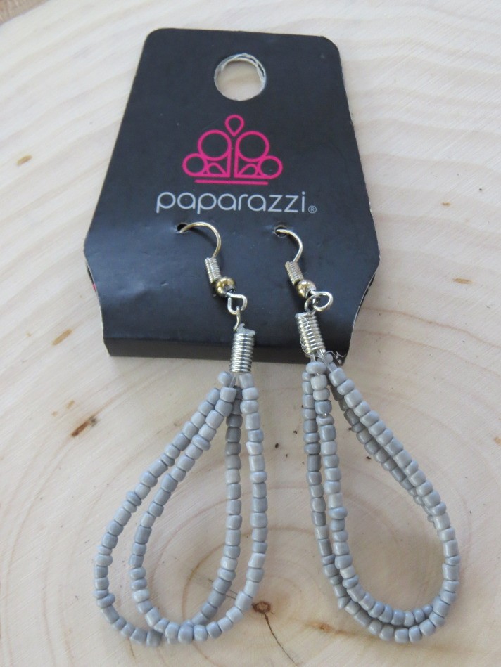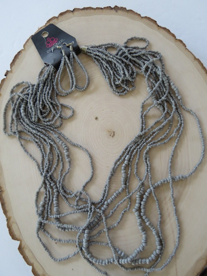Neutral color Paparazzi "Confederate Gray" seed bead waterfall necklace with working lobster claw clasp and matching French wire dangle hoop earrings. Necklace measures 26" at the shortest strand and the longest is 34". French wire earrings measure approximately 2 1/4" long. The necklace has a 2 1/2" extender. Paparazzi necklace and earrings set-appears to have never been removed from original packaging until these photos were taken.