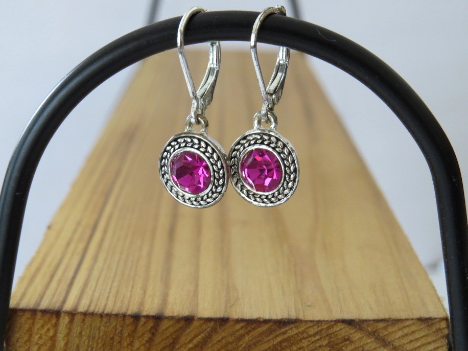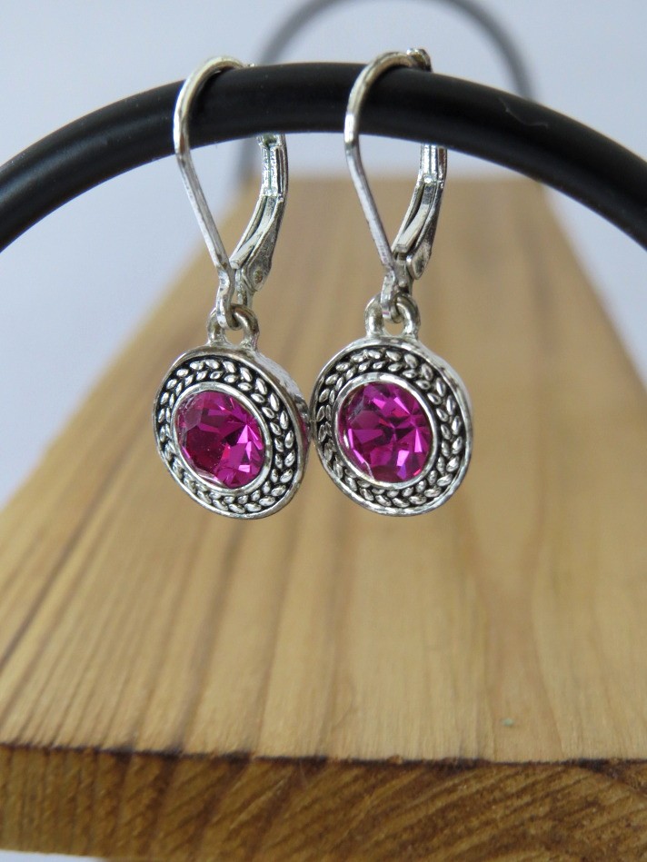 Napier round fuchsia pink rhinestone silver tone lever back dangle earrings. Earrings measure 1 1/4" in length and are marked Napier on the back of the earring.