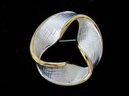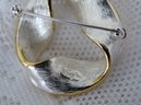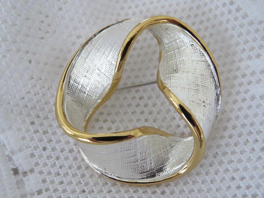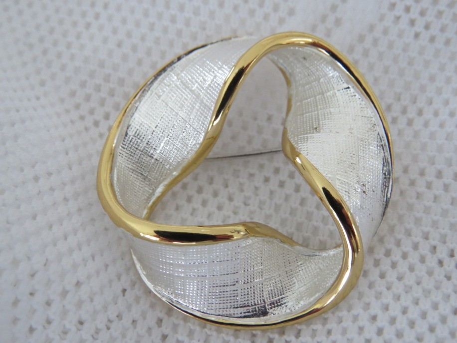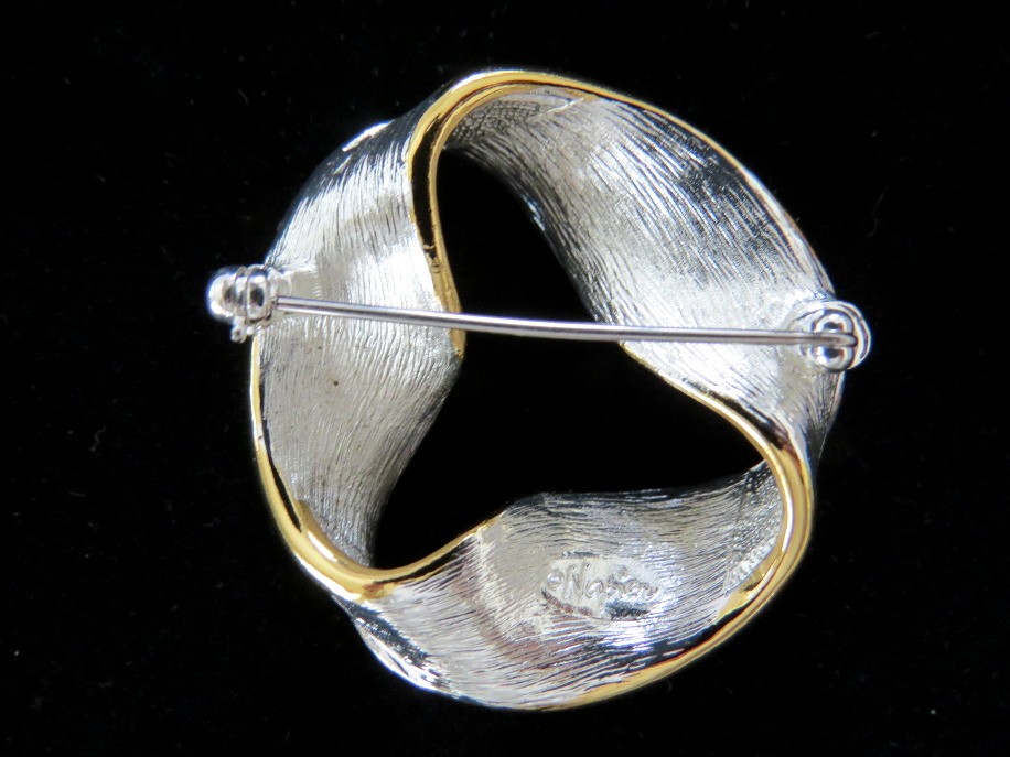 Great two tone silver gold design by Napier which creates an appearance of threads in the ribbon. Pin has a 1 1/2" diameter with a working clasp. Pin is marked Napier on the backside.