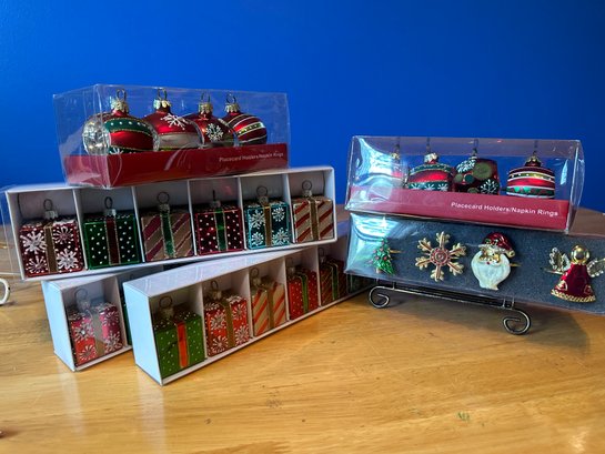 3 pkg. 6 each of Present place card holders new in boxes, 8 ornament place cards/napkin rings 4 each box , 4 new in box holiday napkin rings.