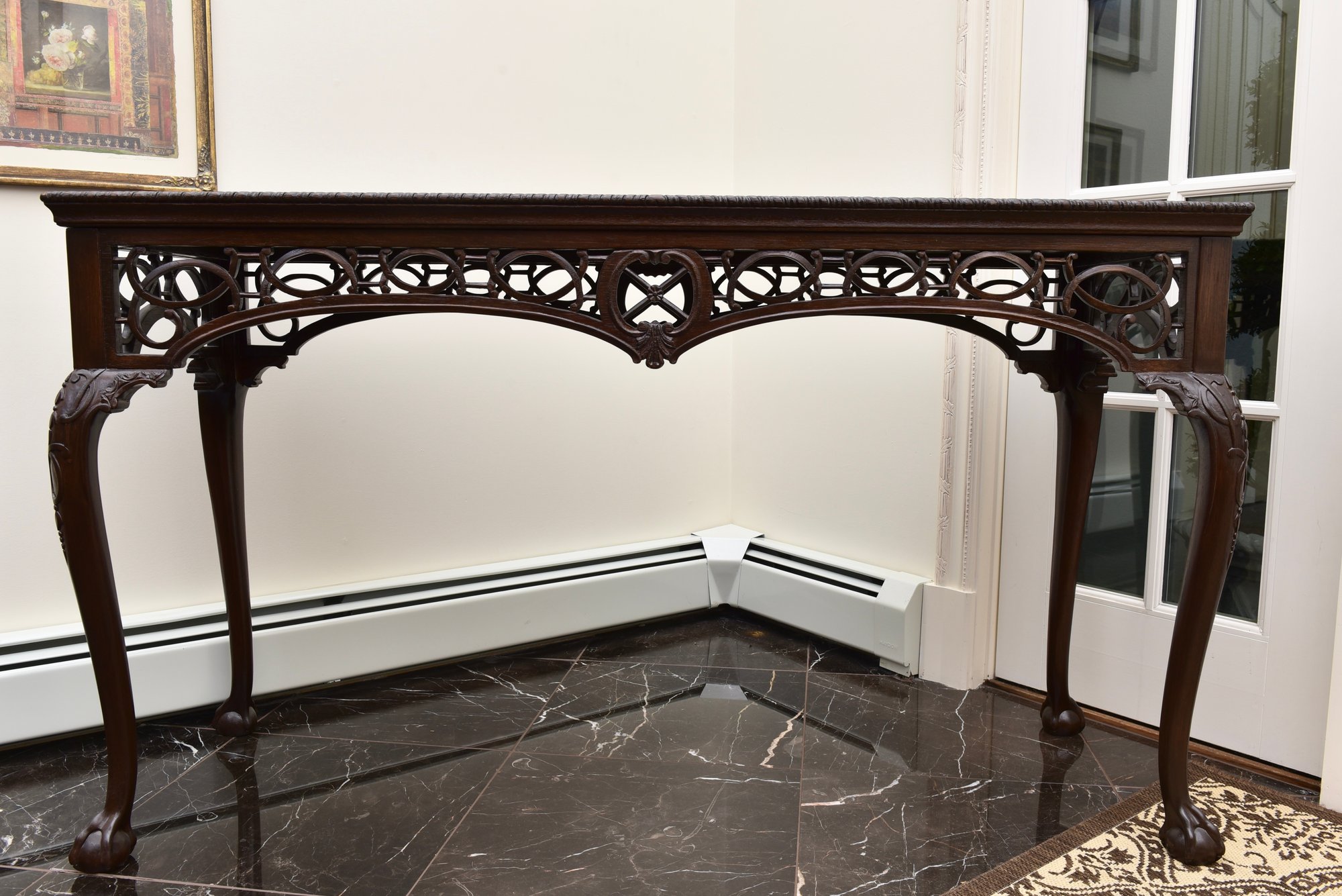 Striking long console table crafted in a Chippendale taste, featuring an open fretwork/Chinese Chippendale style gallery apron with a central motif, set beneath a rectangular top. Supported by elegant cabriole legs with carved knee details and ball and claw feet. Ideal for a foyer, behind a sofa, or along a dining room wall.