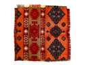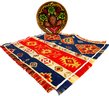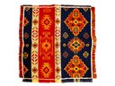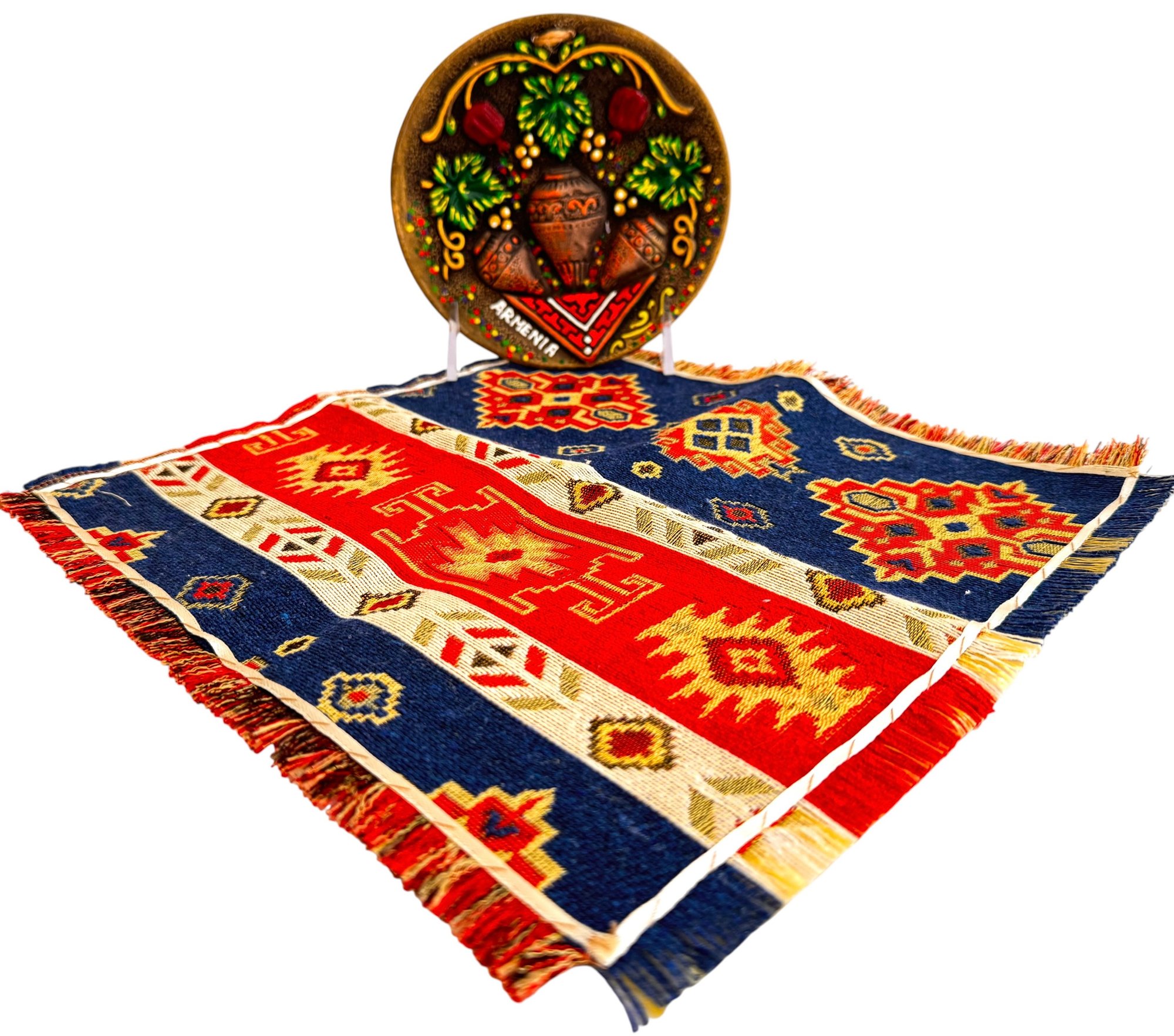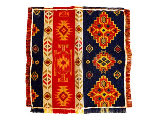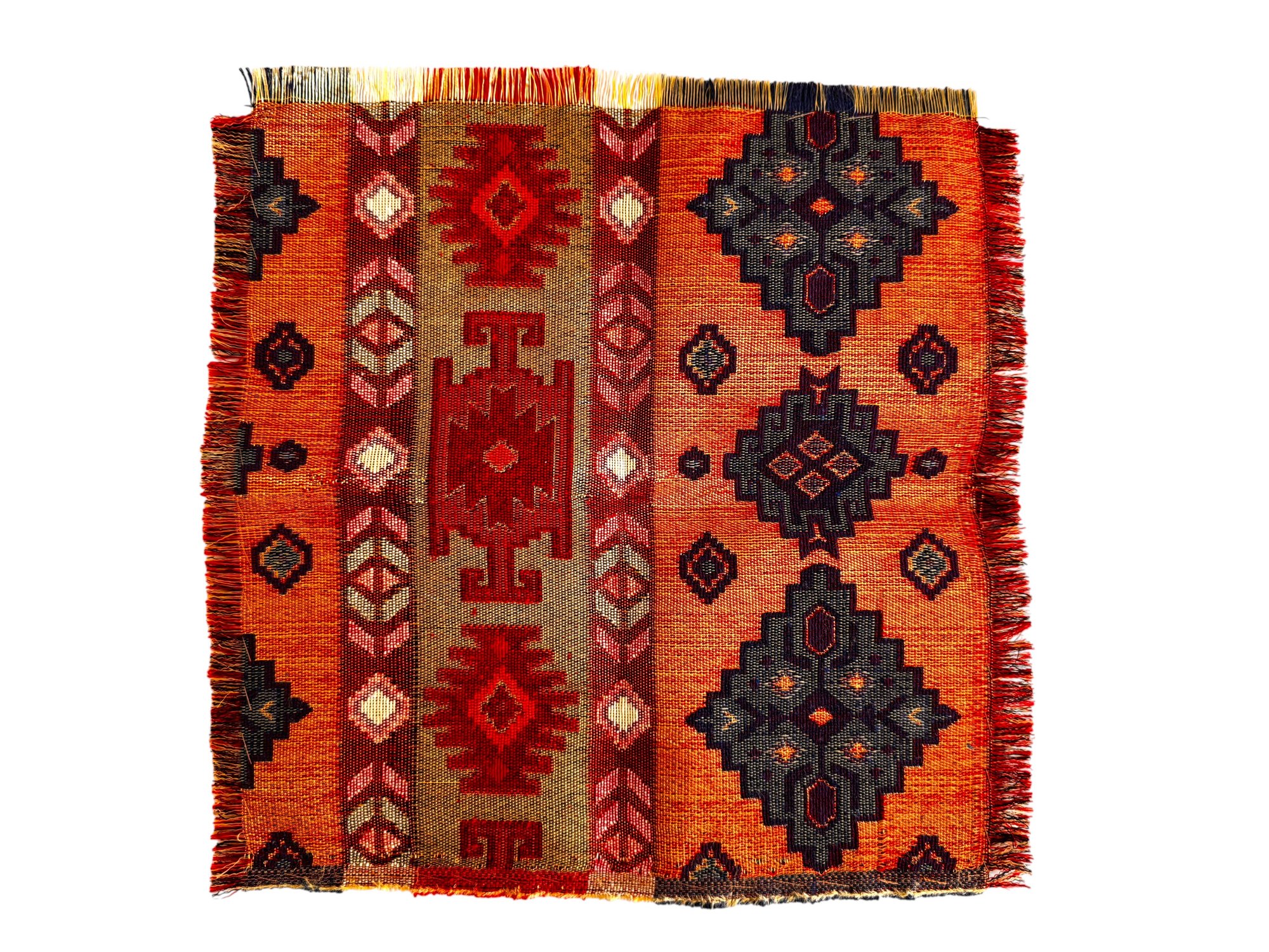 • Woven Textile Mat – Vibrant geometric patterned textile in rich red, blue, gold, and black tones with fringe edges. Traditional folk design styling.
