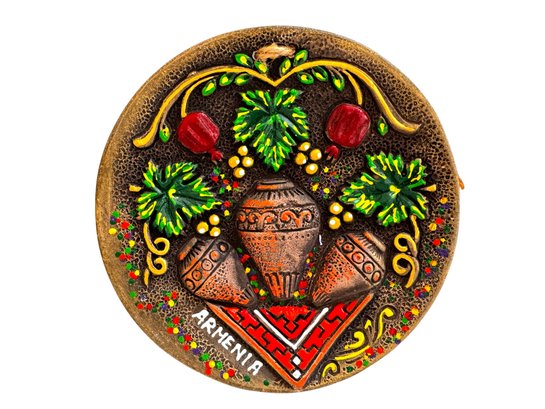 • Hand-Painted Armenian Wall Plaque – Round carved plaque with raised relief decoration featuring traditional motifs including pomegranates, grapes, and ornamental vessels. Marked “Armenia” at the base. Retains hanging cord.