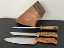 Vintage very sharp pair of Armstrong Forge wood handled knives and sharpener in a block.