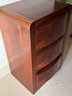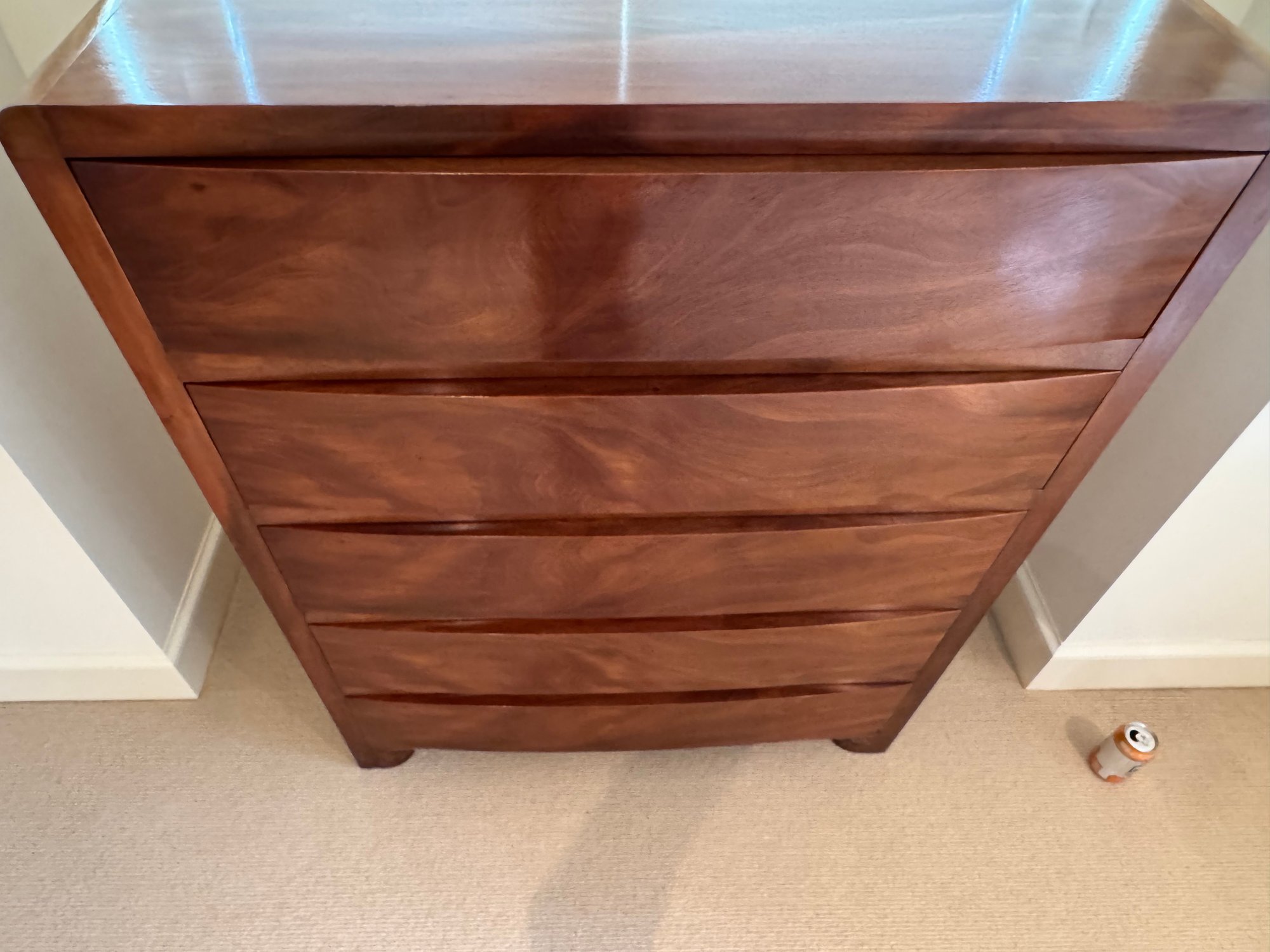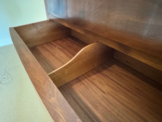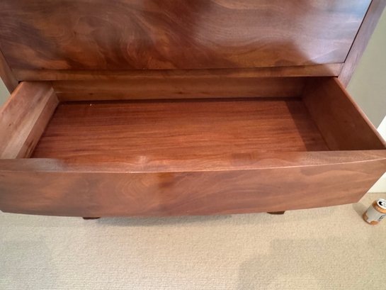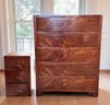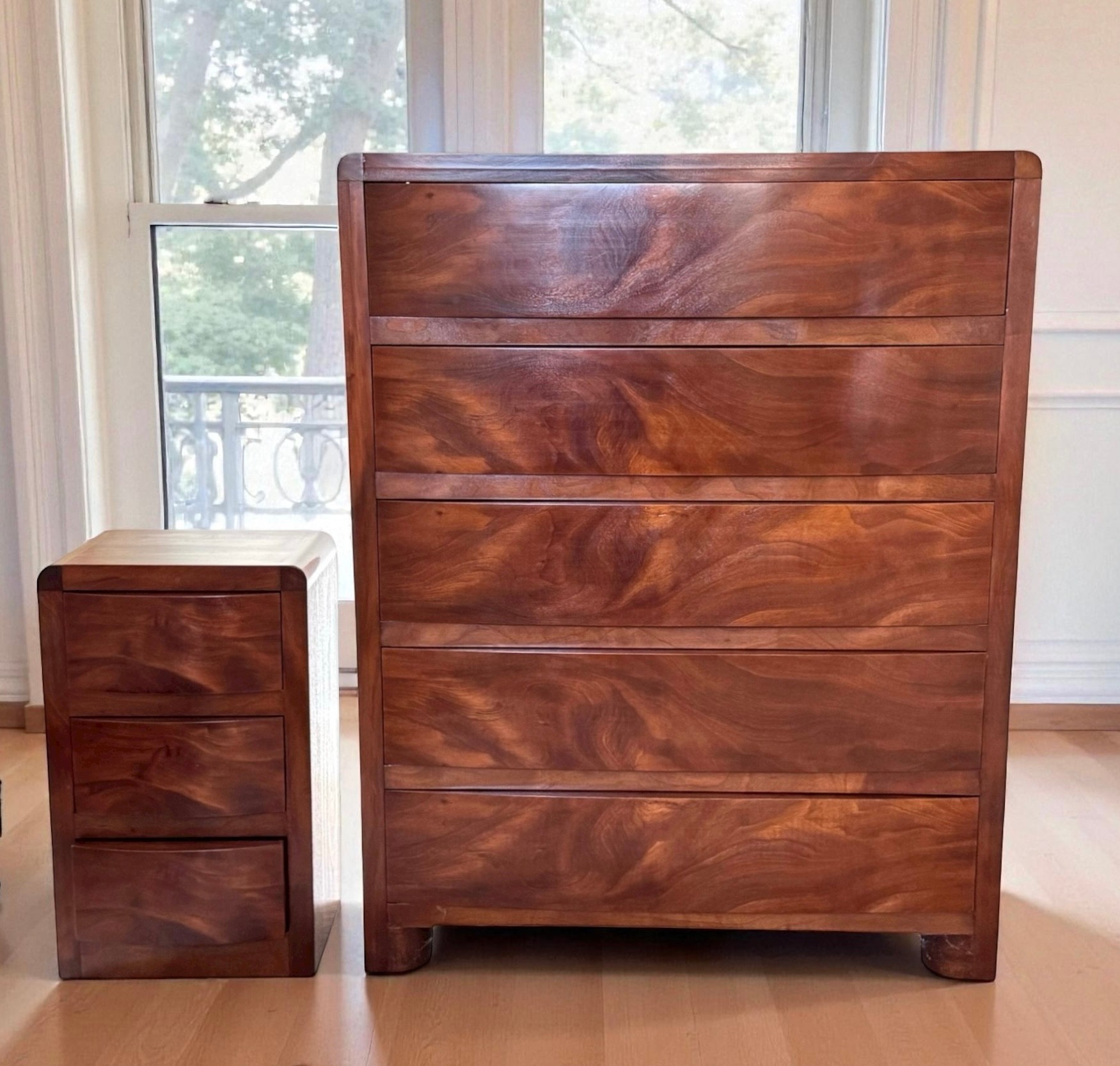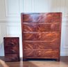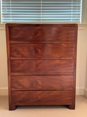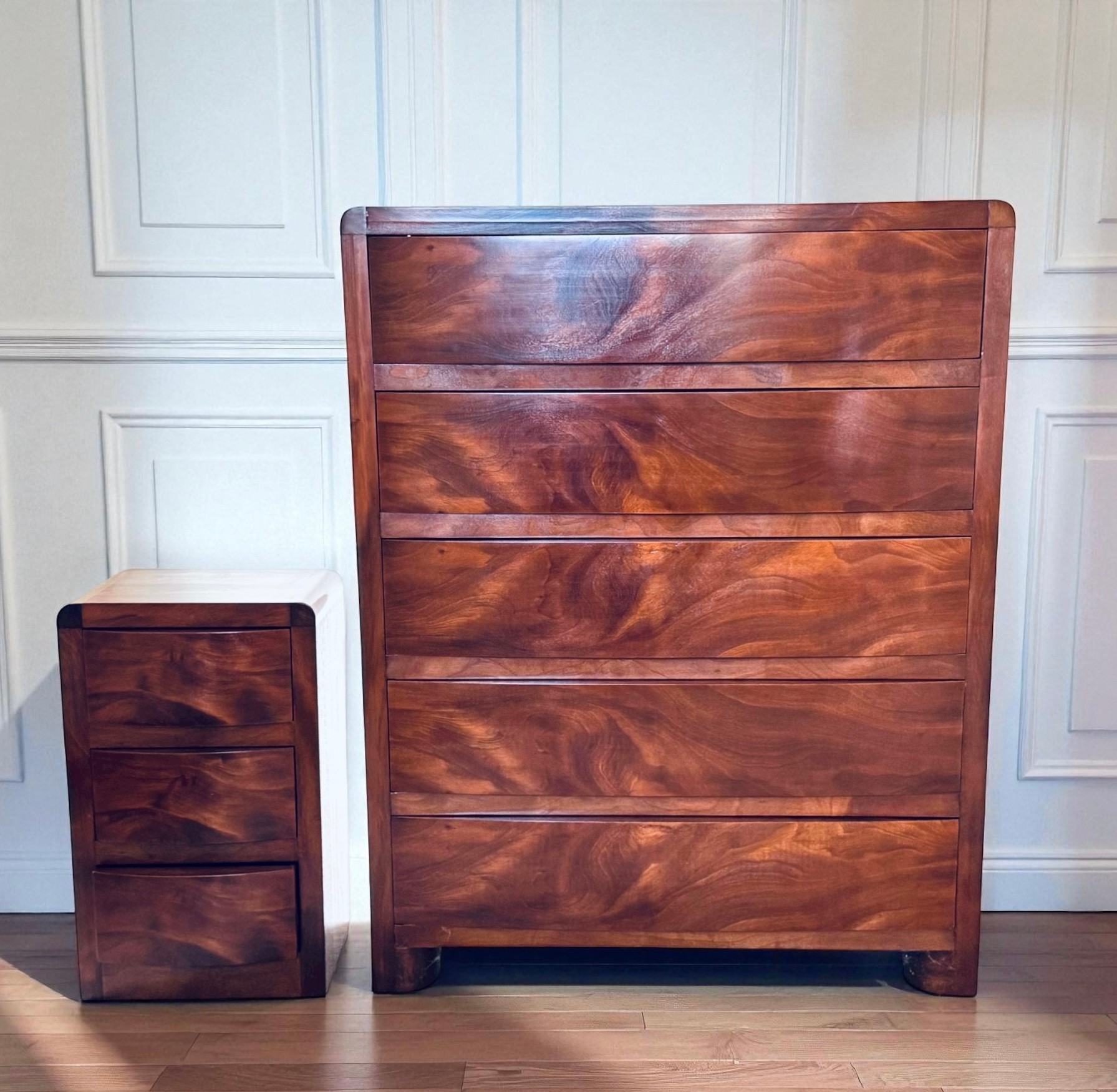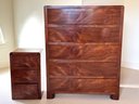 Simple and elegant Art Deco style tall wood dresser with five wide storage drawers, hidden casters and skyscraper detailing. The small side table has three drawers - all have a lovely arch detail. In beautiful condition for age.