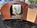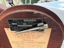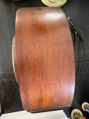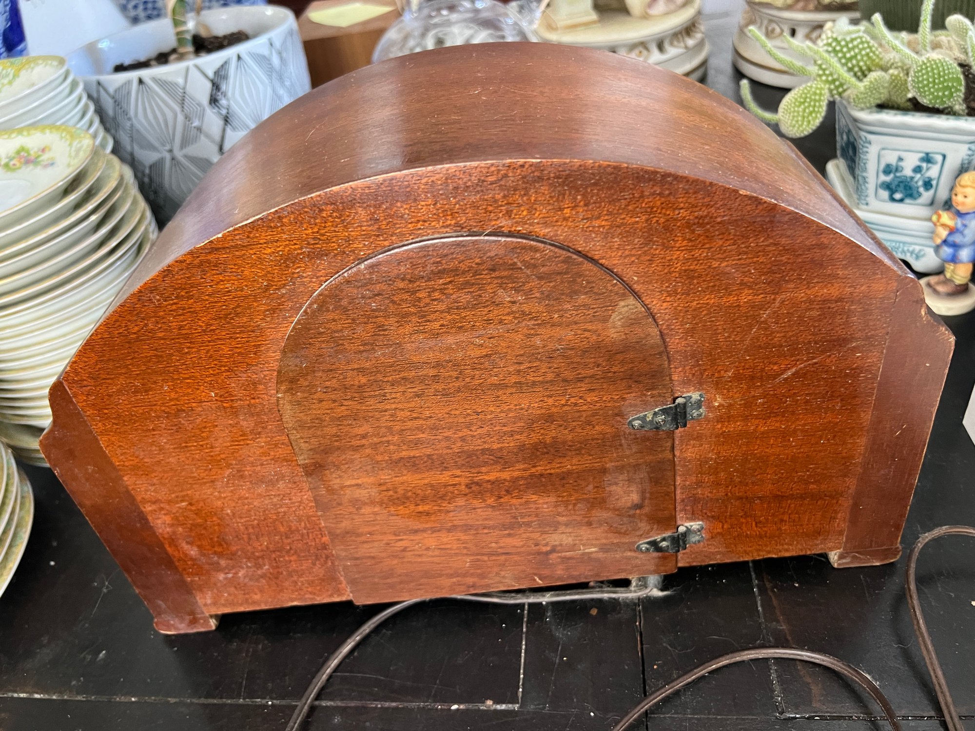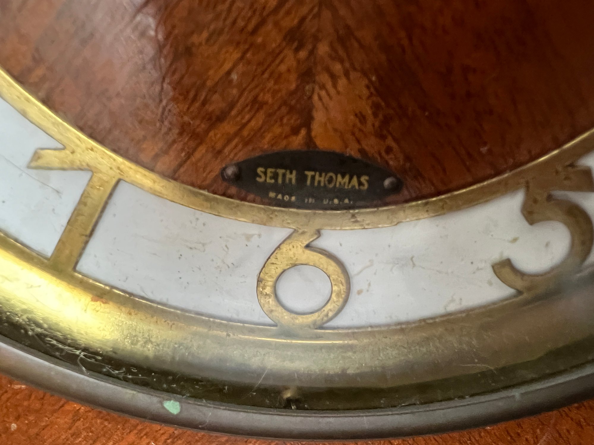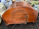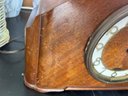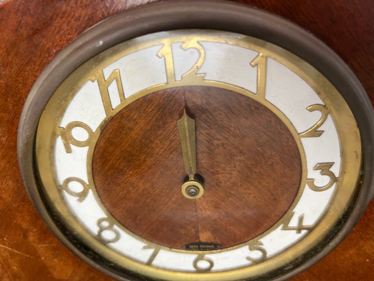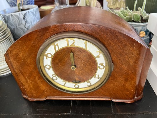 Very cool vintage art deco mantel clock with a rounded wooden case and a brass rimmed face with brass numerals. This clock has lovely style, and was made in Connecticut.