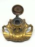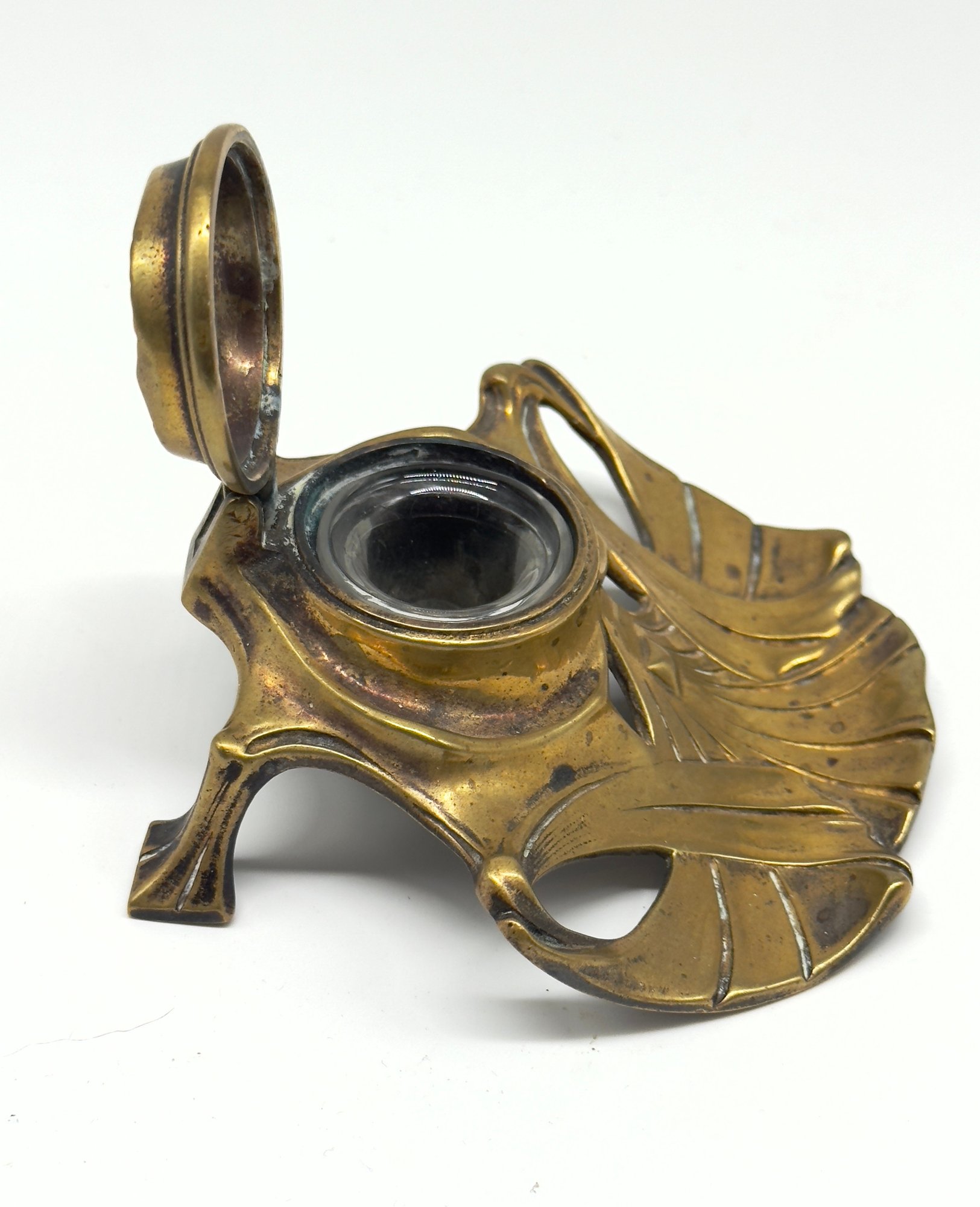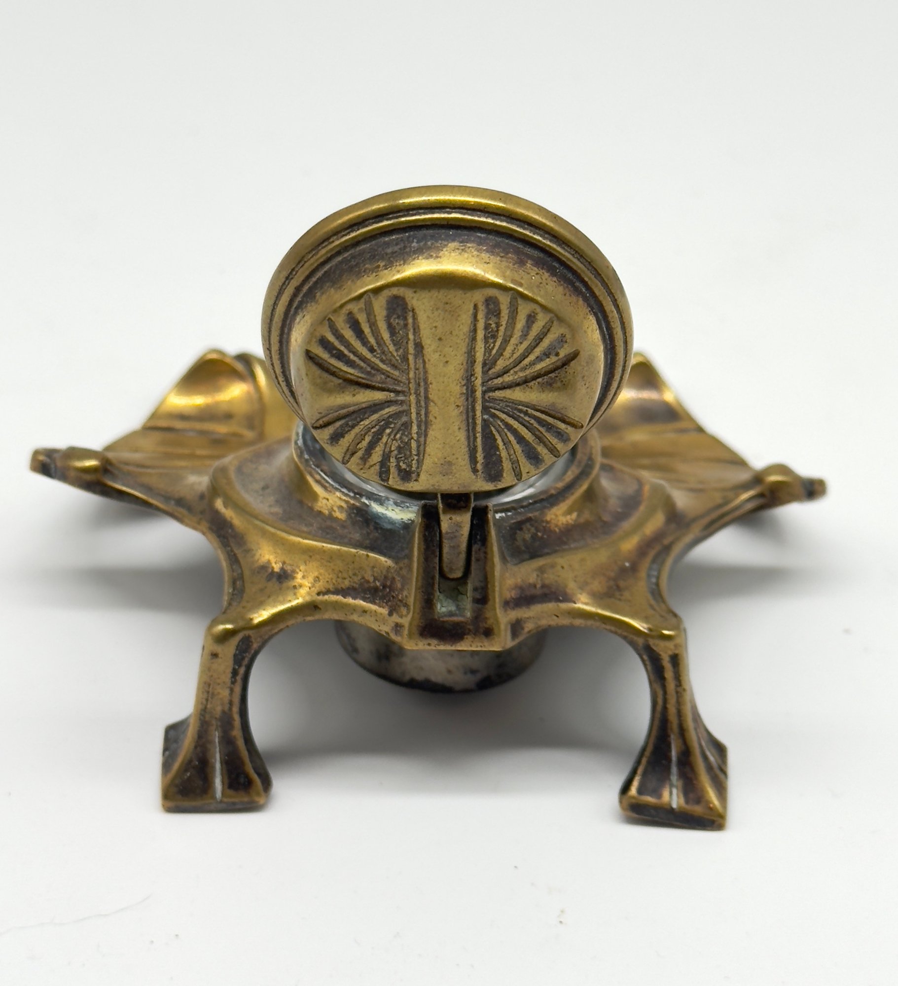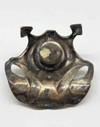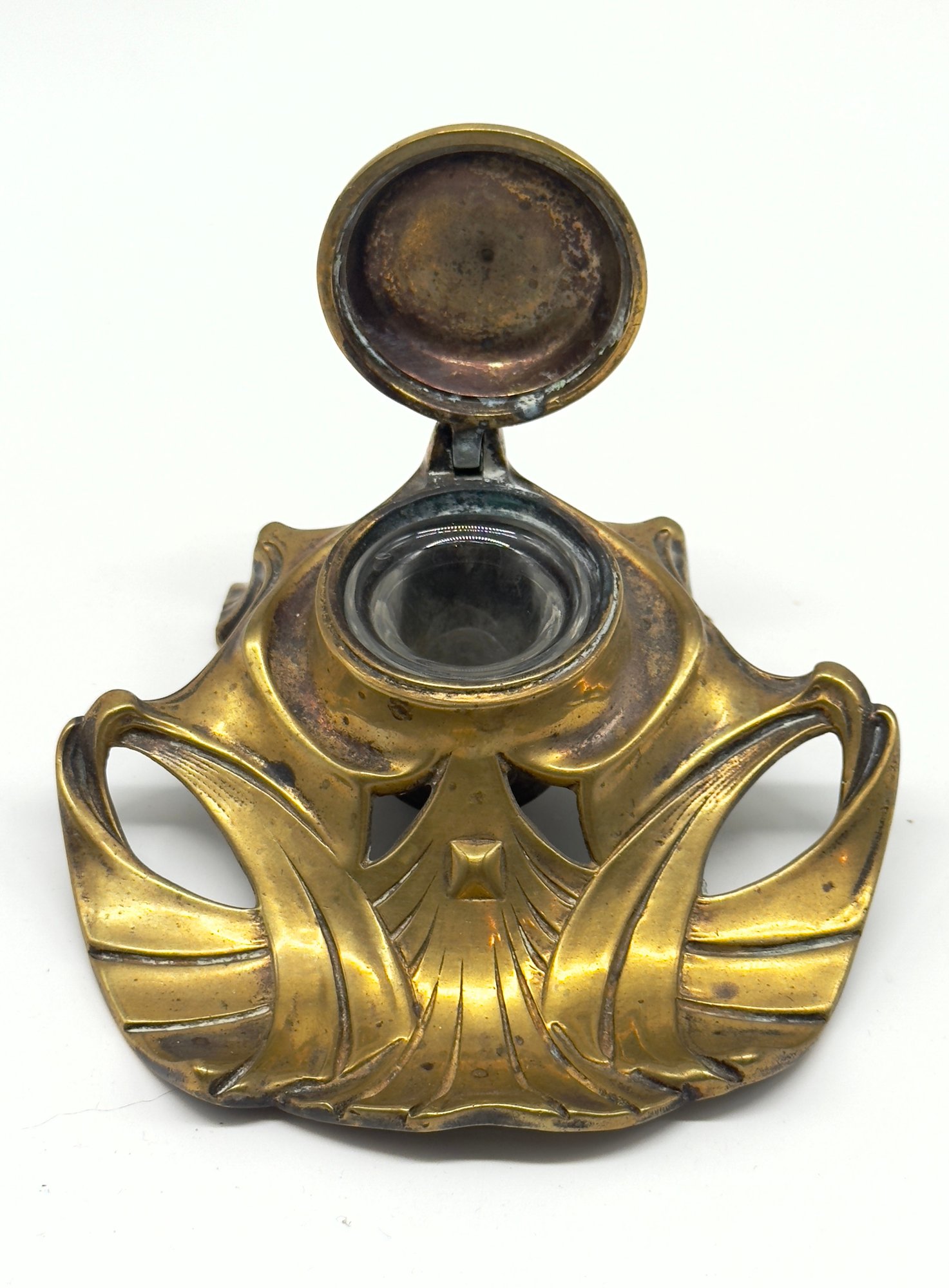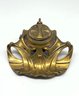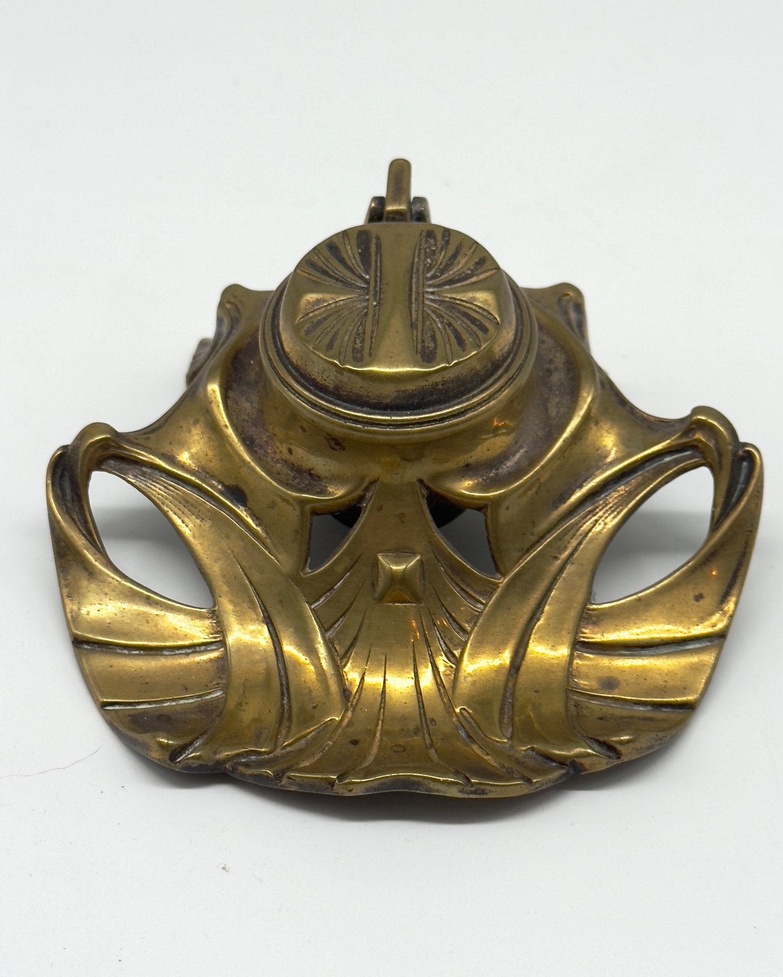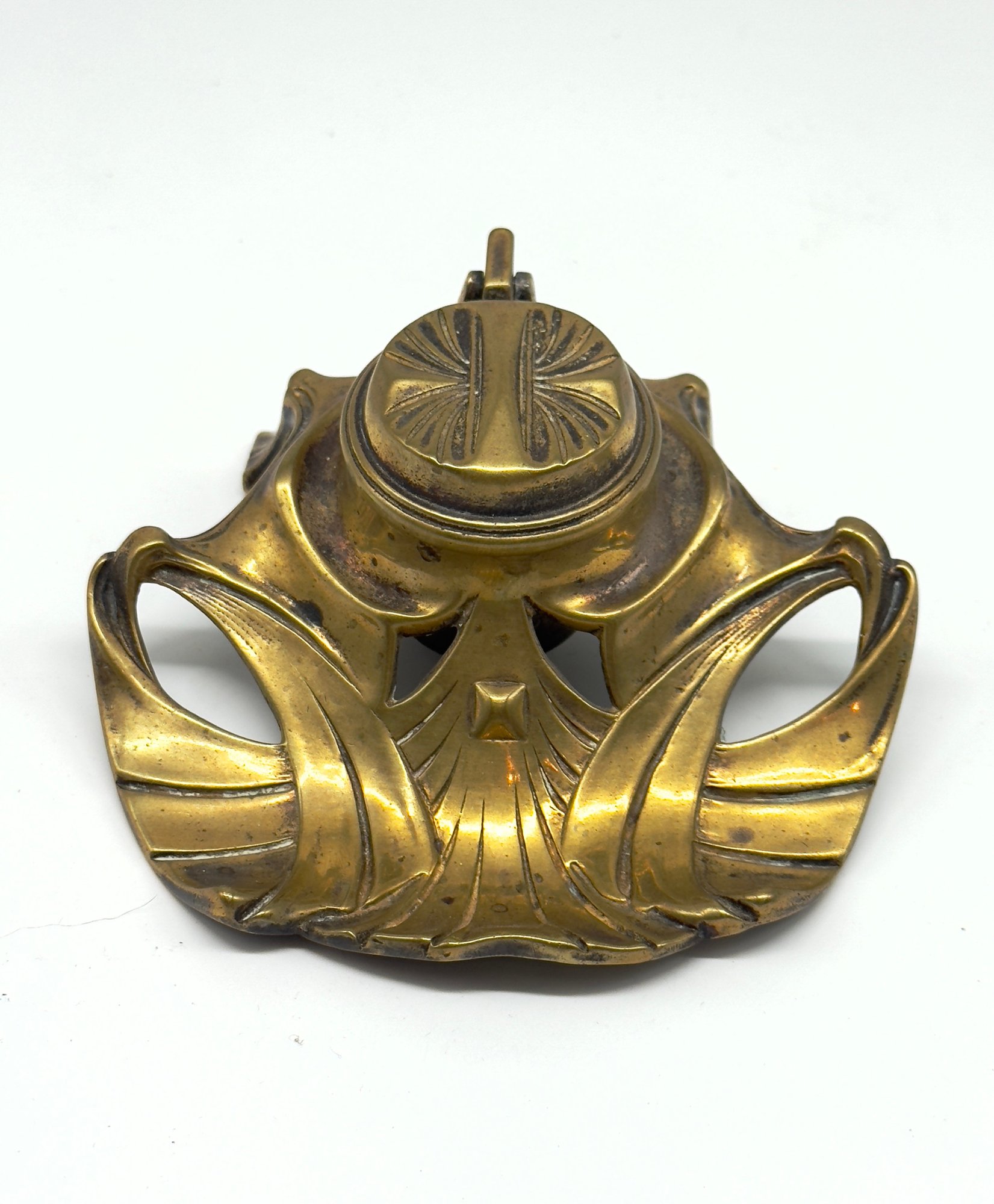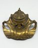 The design features the flowing, organic lines characteristic of the Art Nouveau style. It is made of brass and has a lid that would cover a glass ink cup. Size 4.5 W x 4 D 2 H