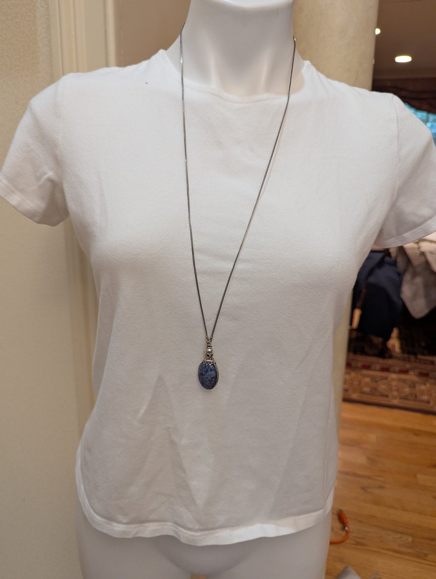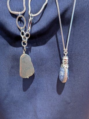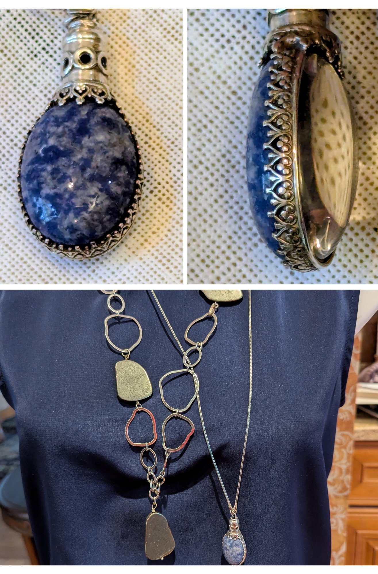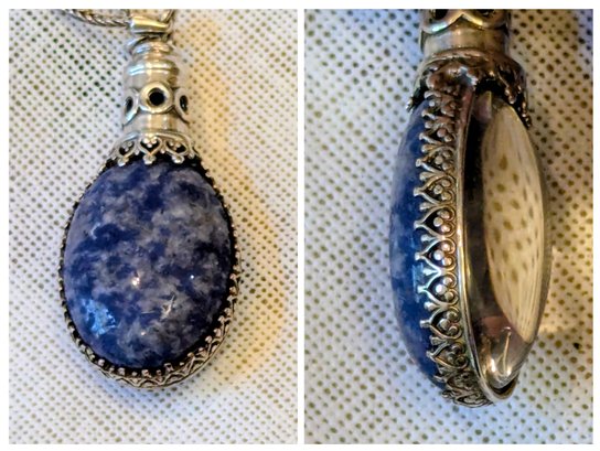 The second piece is an elegant sterling silver amulet-style pendant on a fine, woven-style chain (likely a Fox Tail or similar design). The pendant itself is a capsule or locket shape, featuring a beautiful oval Sodalite (deep blue stone with white/grey matrix) cabochon on one side. The setting showcases intricate metalwork, including filigree and textured detailing around the stone and the bail. The design suggests a piece that may be a small vial, a prayer box, or a piece designed to hold a small treasure.