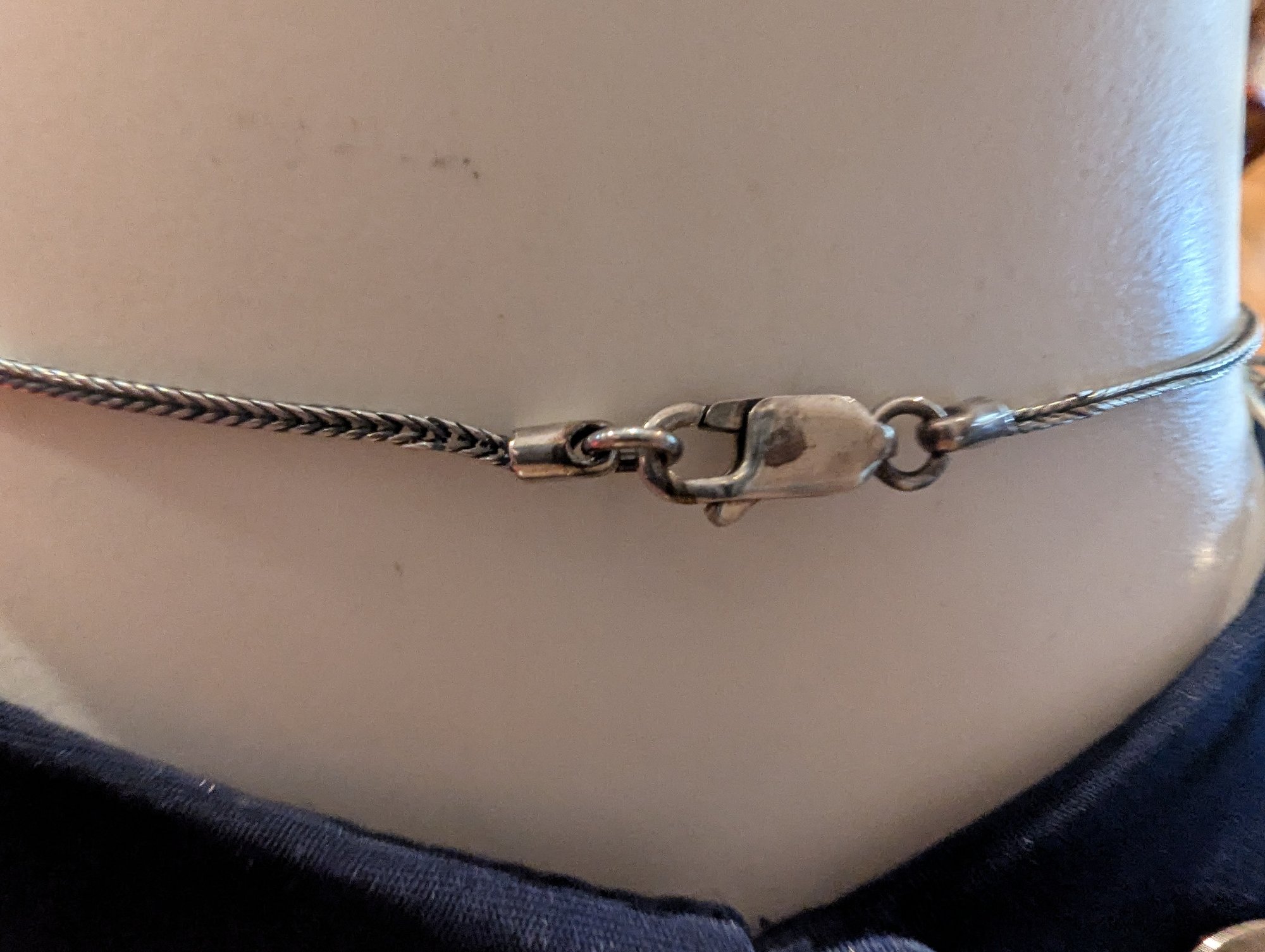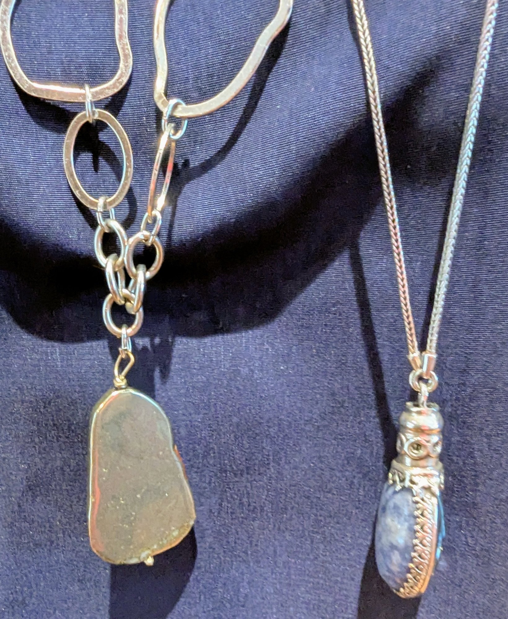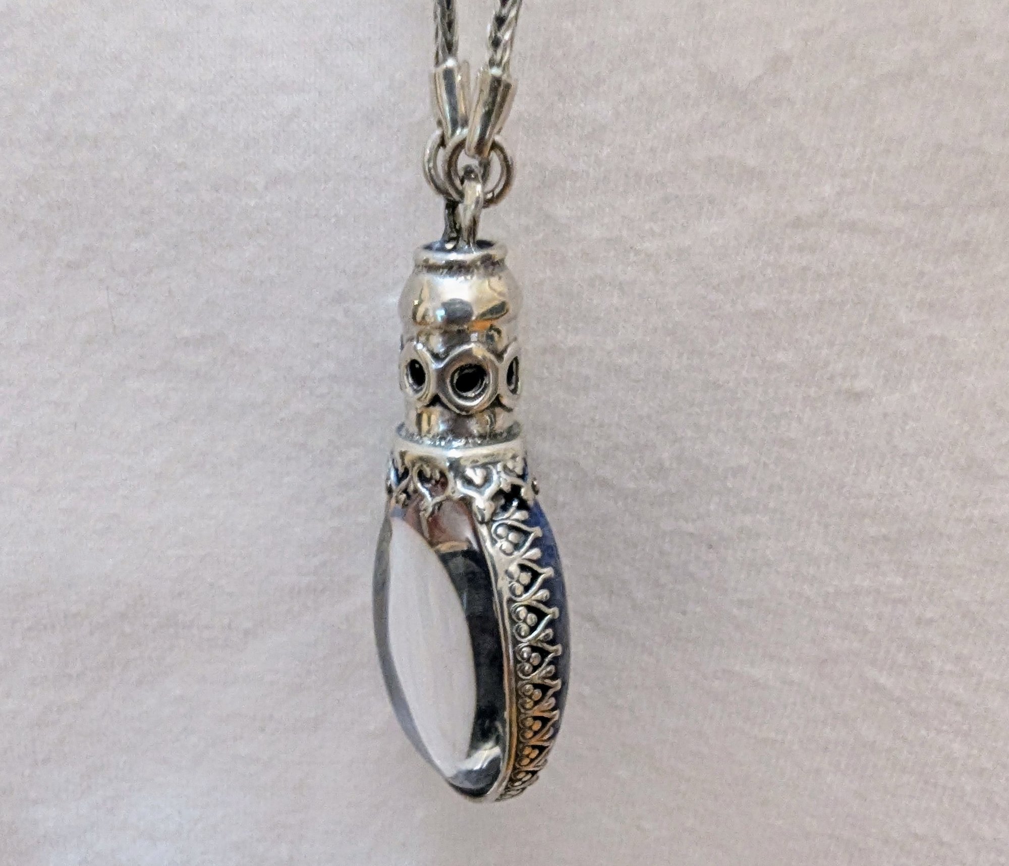 The second piece is an elegant sterling silver amulet-style pendant on a fine, woven-style chain (likely a Fox Tail or similar design). The pendant itself is a capsule or locket shape, featuring a beautiful oval Sodalite (deep blue stone with white/grey matrix) cabochon on one side. The setting showcases intricate metalwork, including filigree and textured detailing around the stone and the bail. The design suggests a piece that may be a small vial, a prayer box, or a piece designed to hold a small treasure.