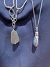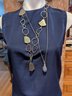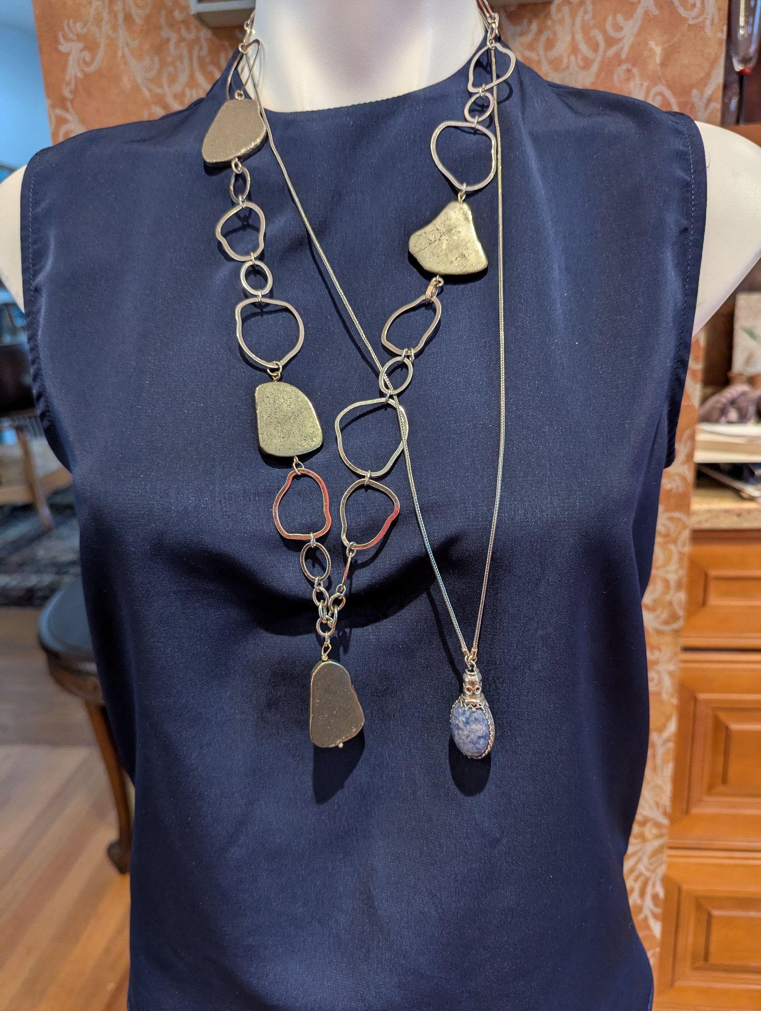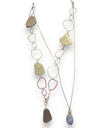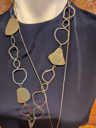 The first piece is a striking long statement necklace with an abstract, contemporary design. It features multiple links in irregular, organic shapes, alternating between polished metal rings and chunky, gold-toned Pyrite (or a similar metallic stone/material) nuggets. The design creates a bold, modern look with an earthy, mineral touch