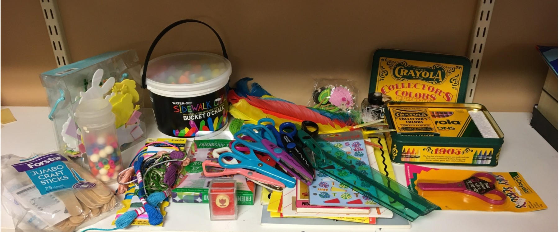 Nice lot of arts and crafts supplies for the kids, including new, unused crayons and sidewalk chalks, craft sticks, scissors, beads, feathers & more!