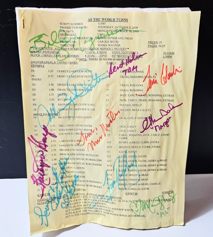 As the World turns script autographed by the cast. This is the LAST of several copies we have remaining in stock.