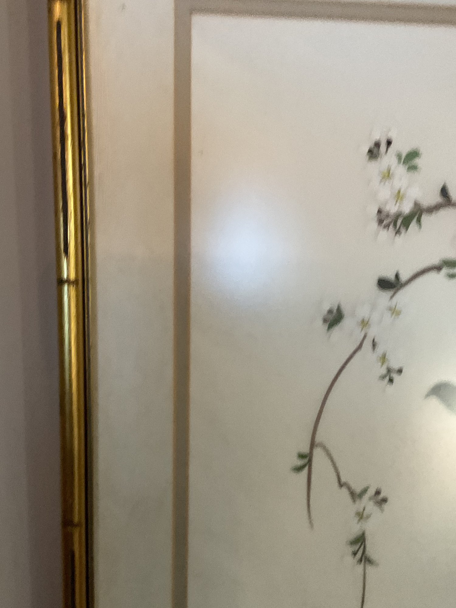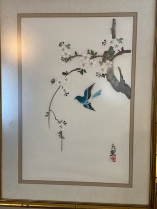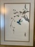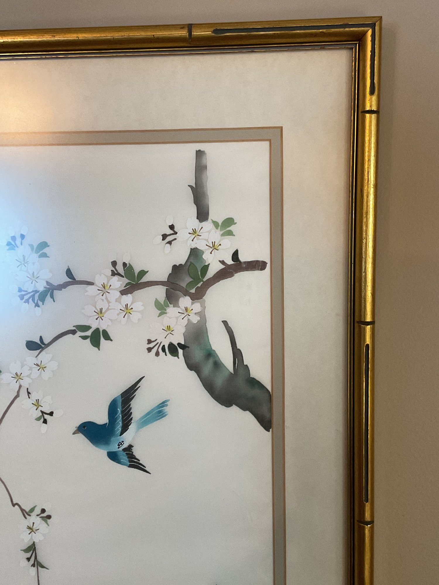 Beautiful painting of a blue bird in flight among finely rendered blossoming branches. Signed in the lower right. Beautifully matted in gilt bamboo style frame. Anti-glare glass needs cleaning. Companion to the Asian painting sold separately in this auction. We found an unframed version of this painting selling online for $50.