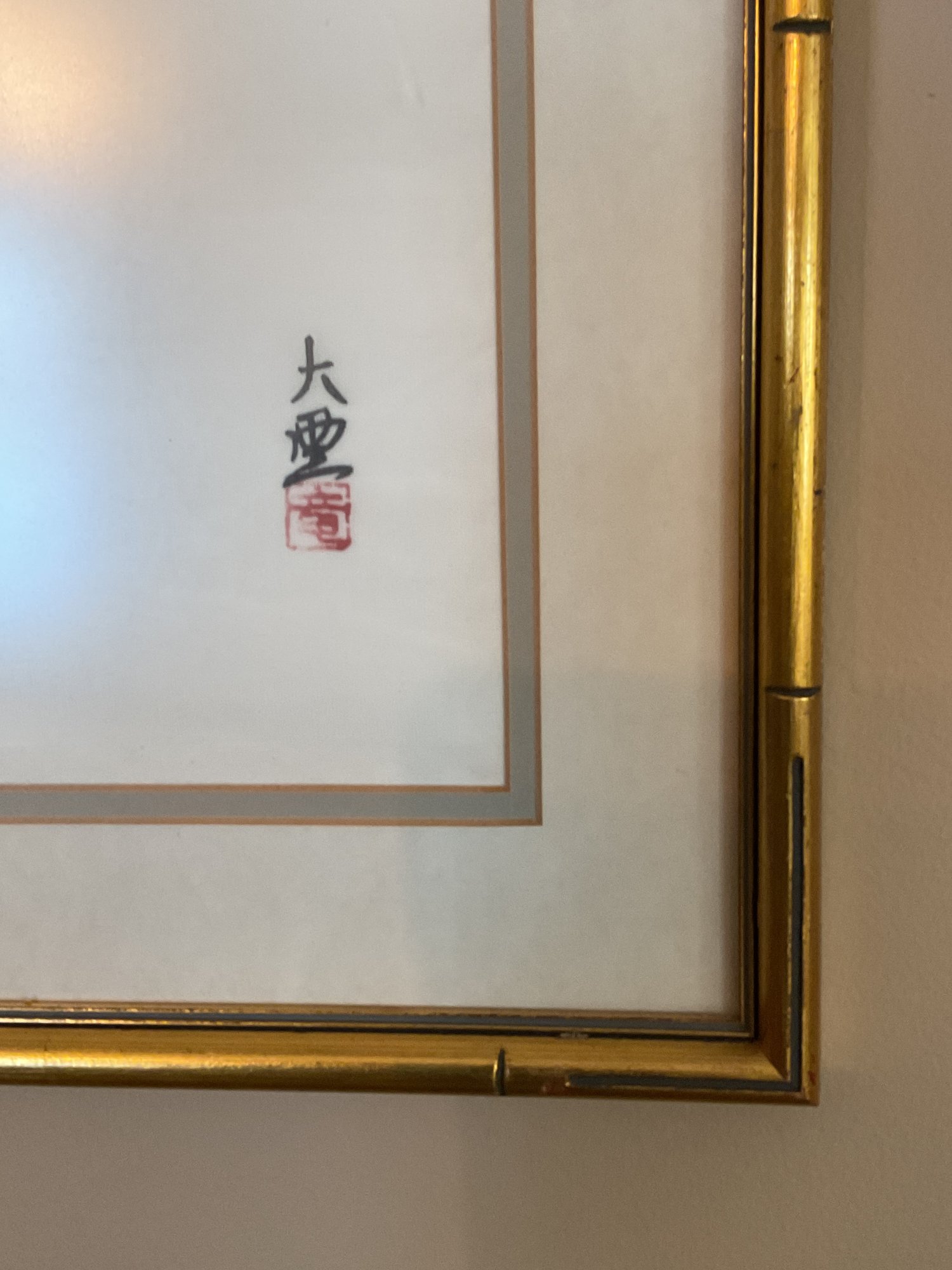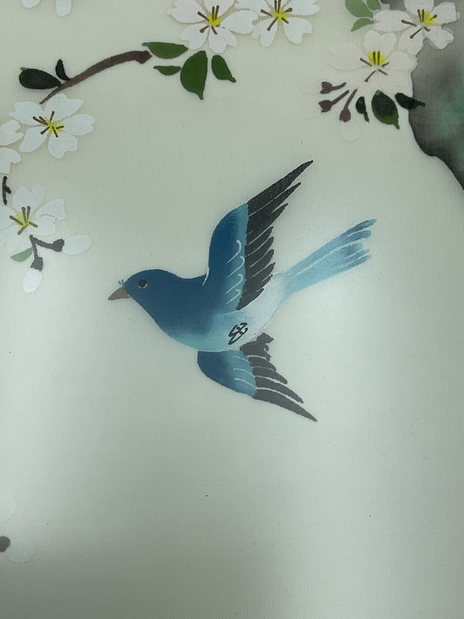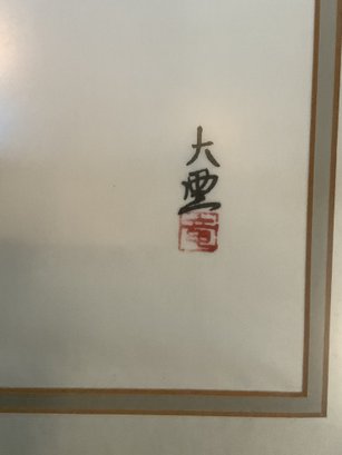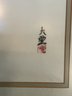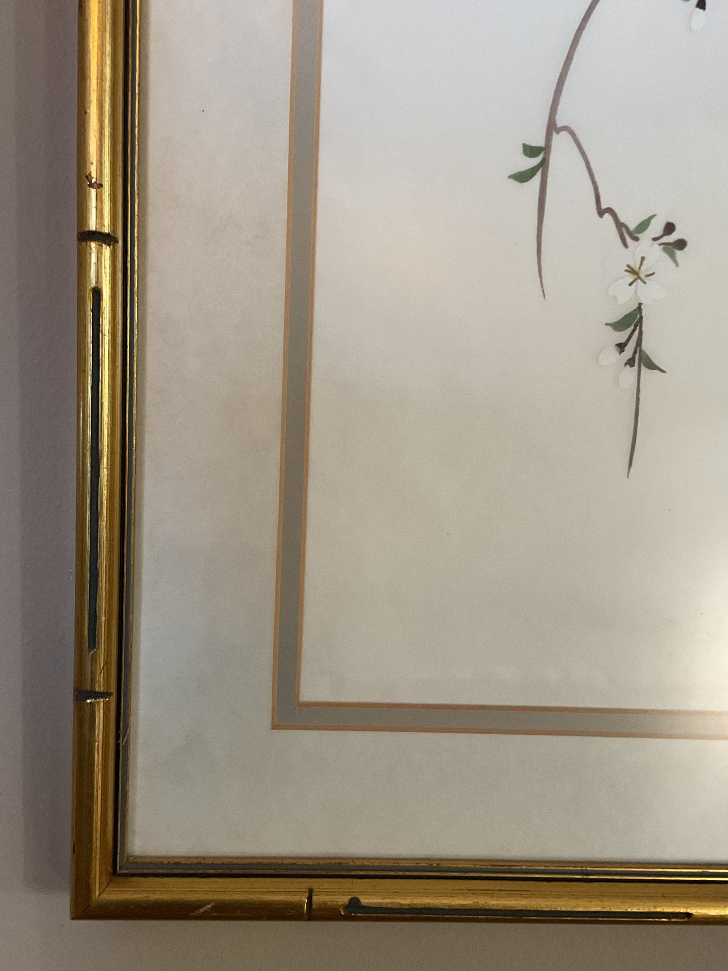 Beautiful painting of a blue bird in flight among finely rendered blossoming branches. Signed in the lower right. Beautifully matted in gilt bamboo style frame. Anti-glare glass needs cleaning. Companion to the Asian painting sold separately in this auction. We found an unframed version of this painting selling online for $50.