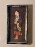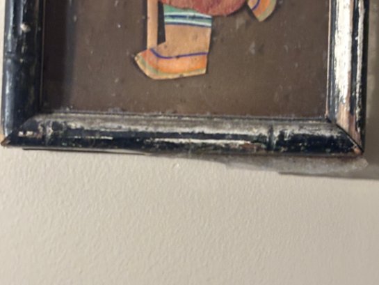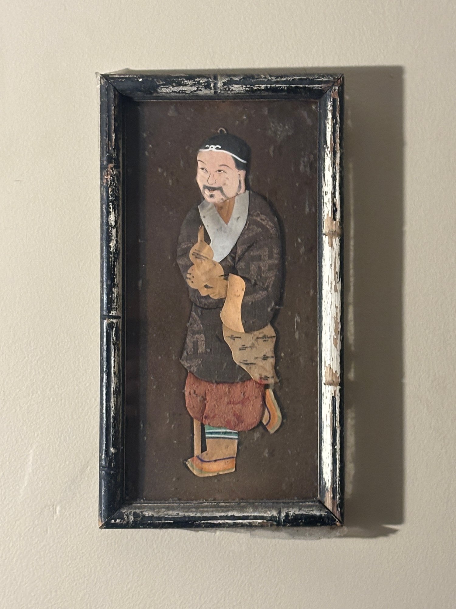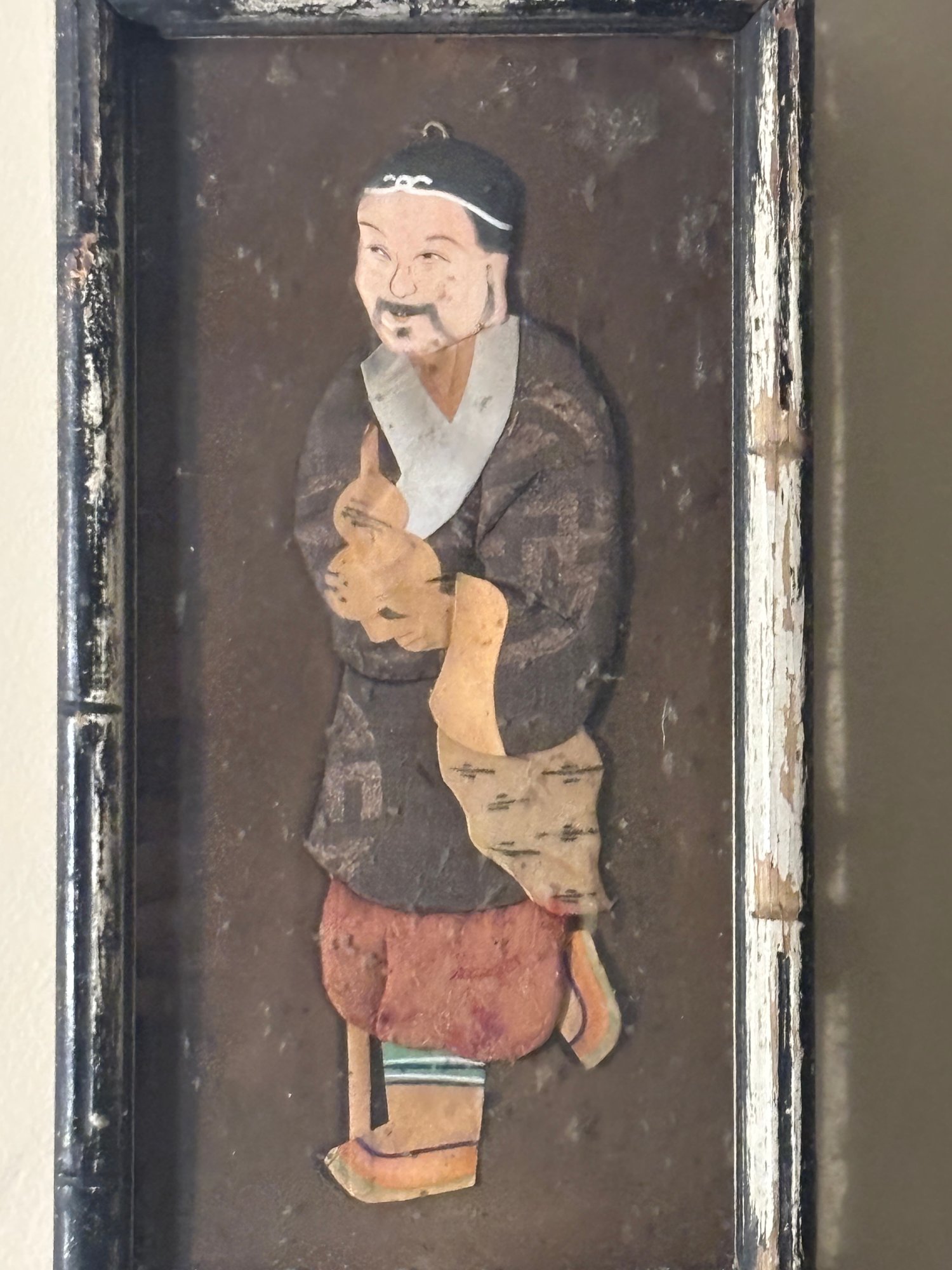 The character’s stylized facial features, flowing robe, and articulated limbs create a sense of motion and personality, while the dark ground and distressed frame add to the piece’s aged, atmospheric presence. This feels like a fragment of performance history preserved as wall art.