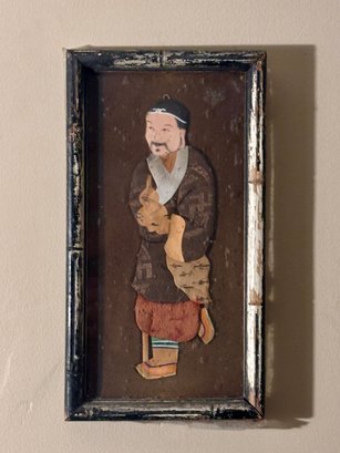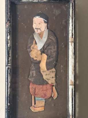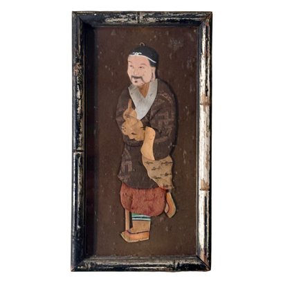 A captivating hand-cut and hand-painted paper figure depicting a traditionally dressed Asian character, mounted as a dimensional folk art panel. The layered construction and expressive detailing give the figure a sculptural quality, reminiscent of shadow puppetry and theatrical storytelling traditions.