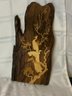Carved and appliqued wood wall art. Base is a solid slab of wood. Hand carved lighter wood birds and trees with leaves make a dramatic statement. Lovingly rendered pair of peacocks in a tree adds an elegant accent to any wall. No signature and no indication of country of origin. Minor breaks/loss to some of the appliqued pieces are not noticeable except under close inspection.