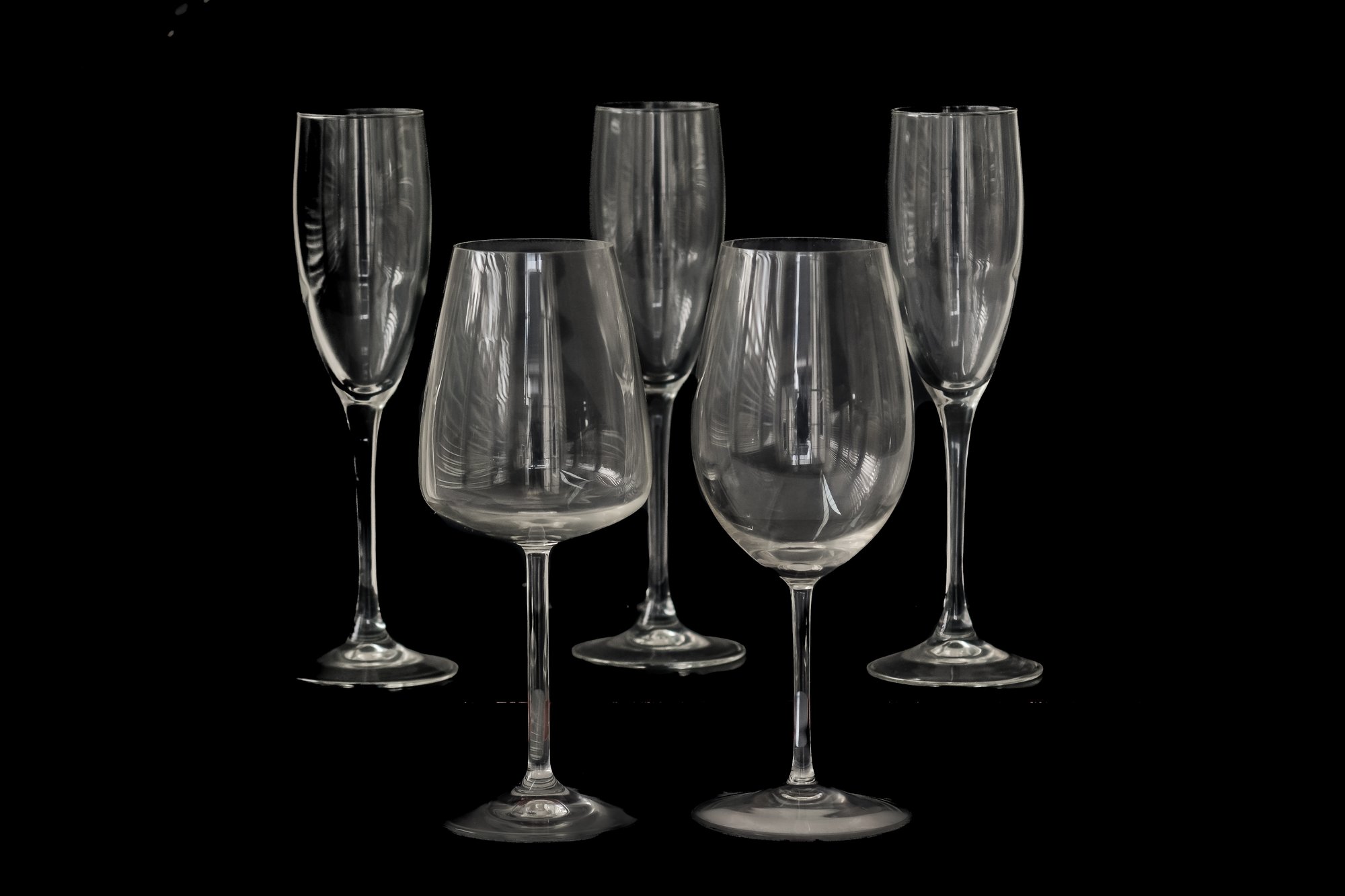 Five glasses - (1) Eisch flat bottom wine glass, (3) french champagne flutes, (1) white wine glass