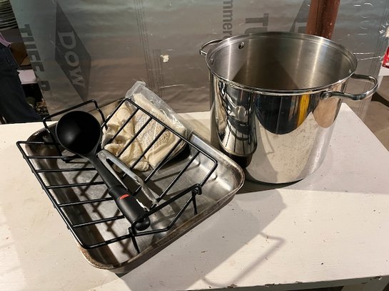 Stock pot with lid, roasting pan, rack, etc