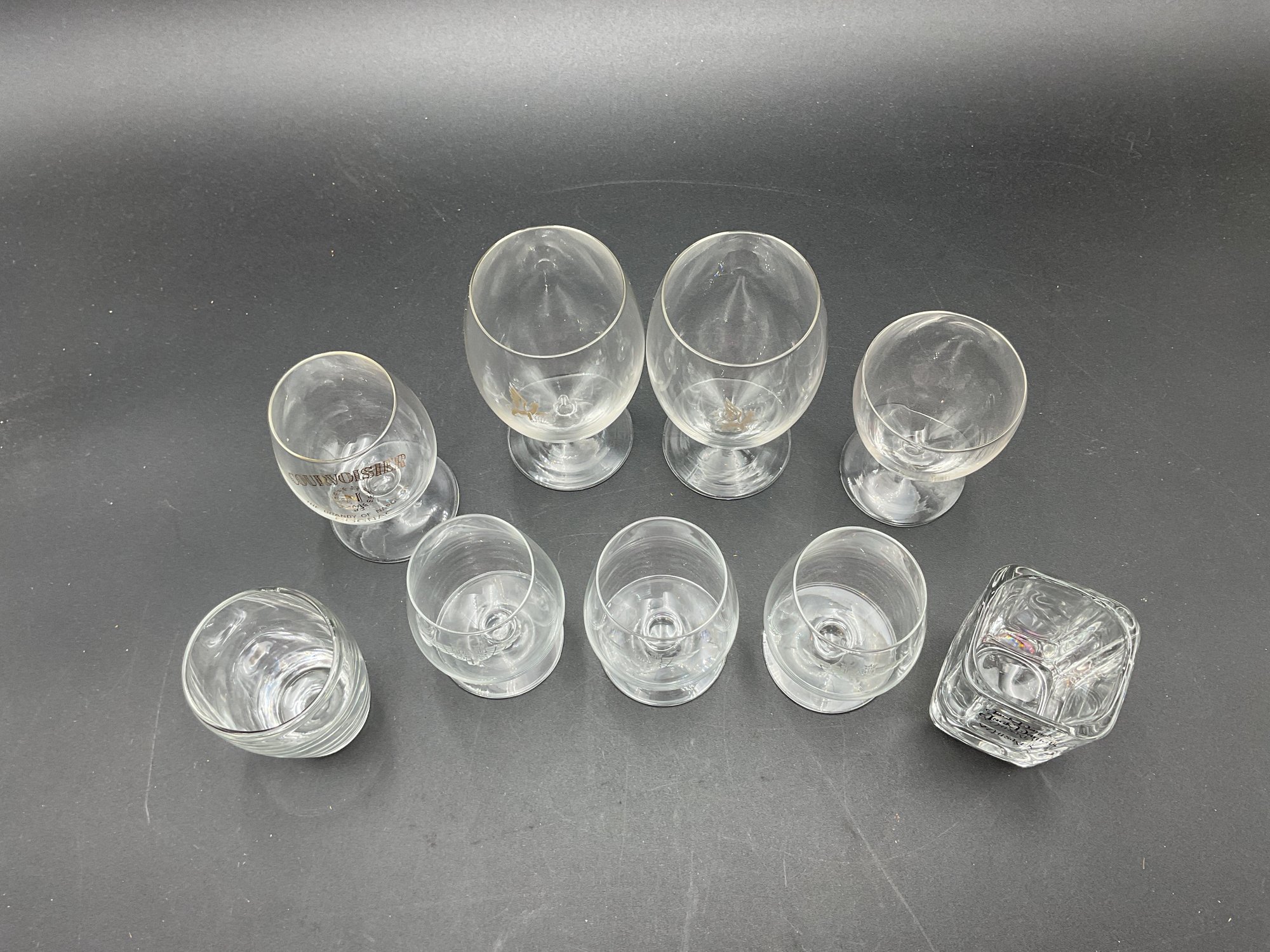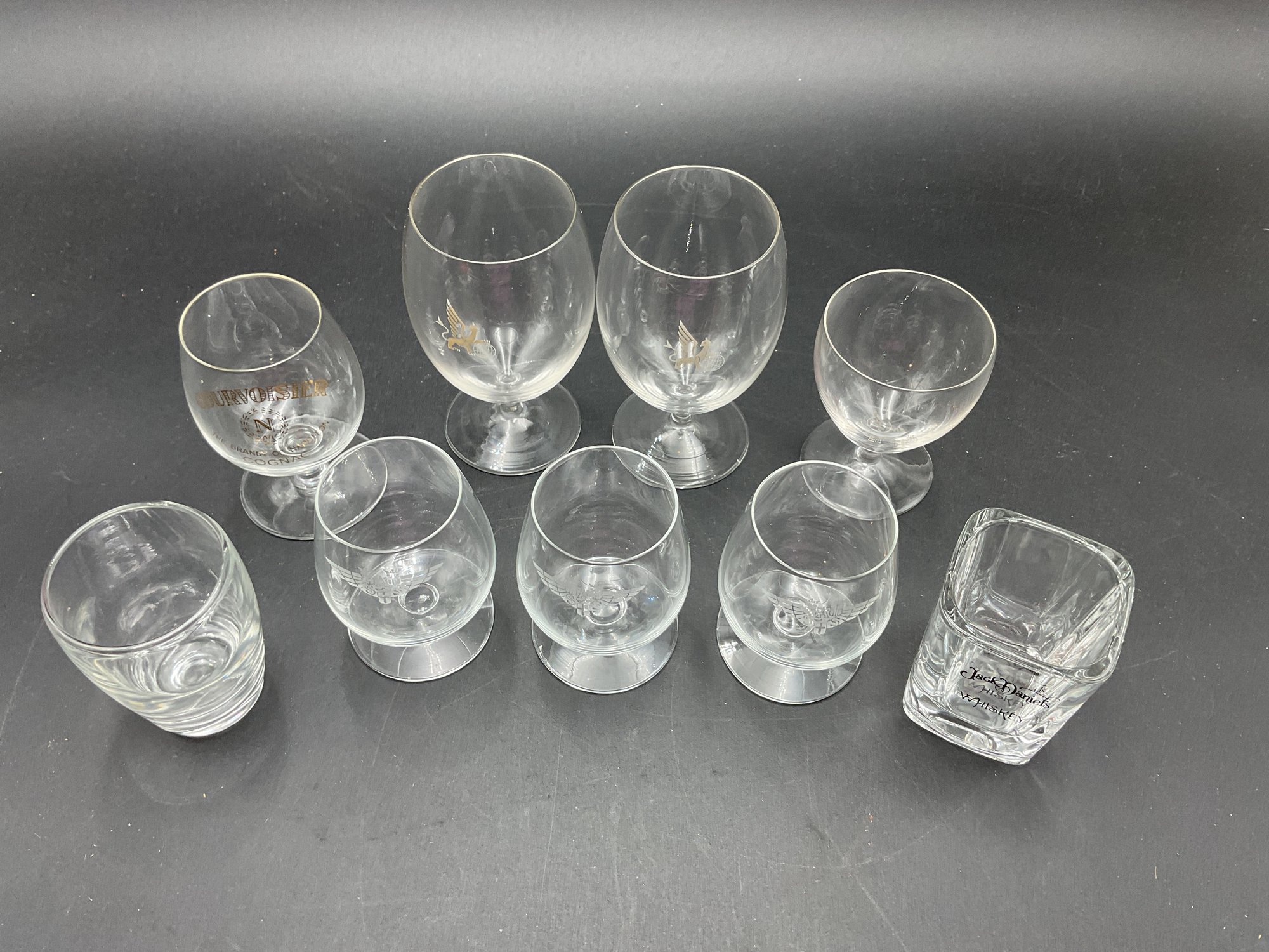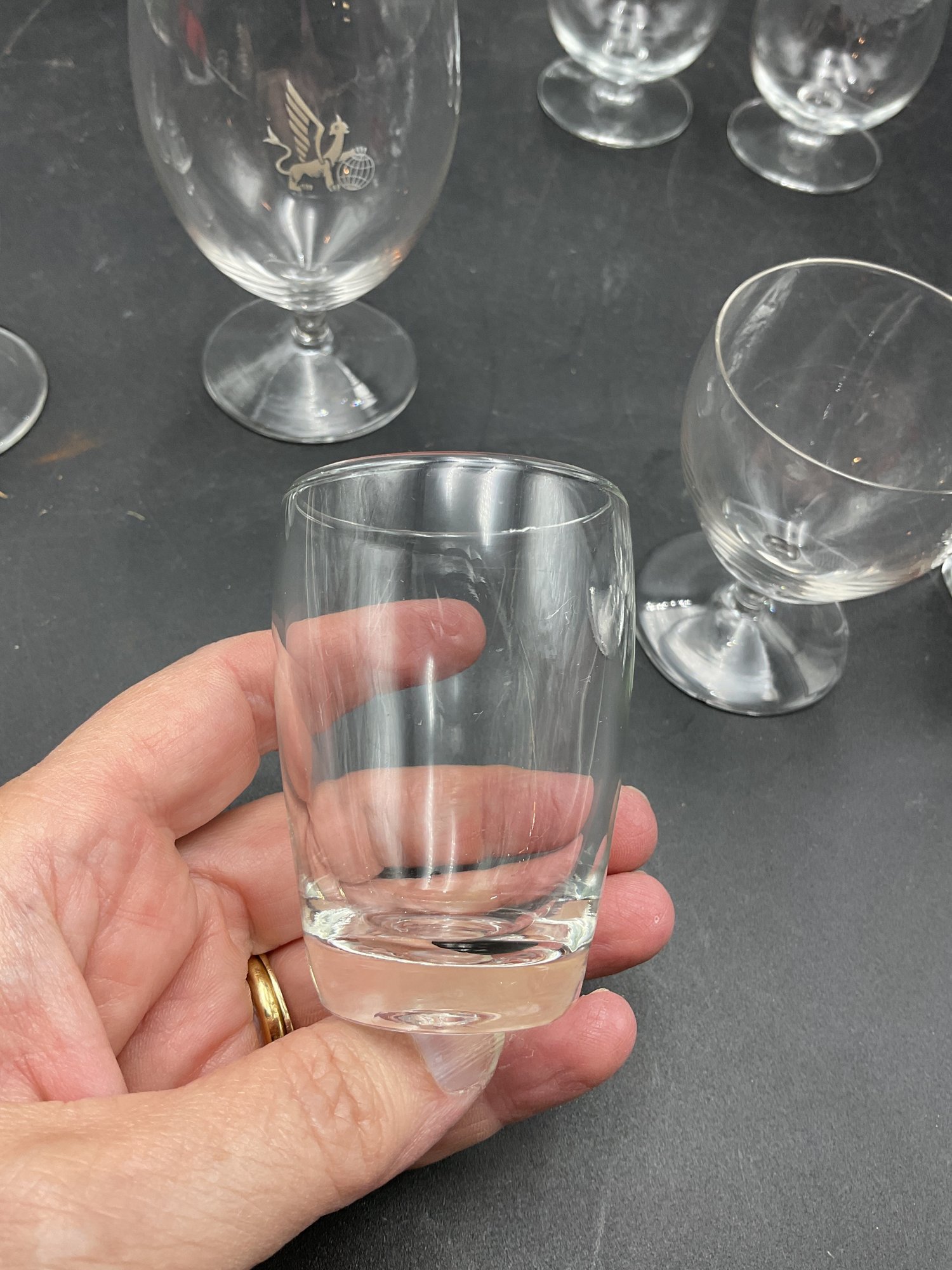 Assorted brandy and cognac snifters plus a couple shot glasses, all believed to be vintage. All in great condition, no chips or cracks. Includes 3 from SAS (Scandinavian Airlines vintage logo), 1 Courvoisier, 3 with unidentified griffin and globe logo, 1 Jack Daniels shot glass and one clear double shot glass.