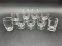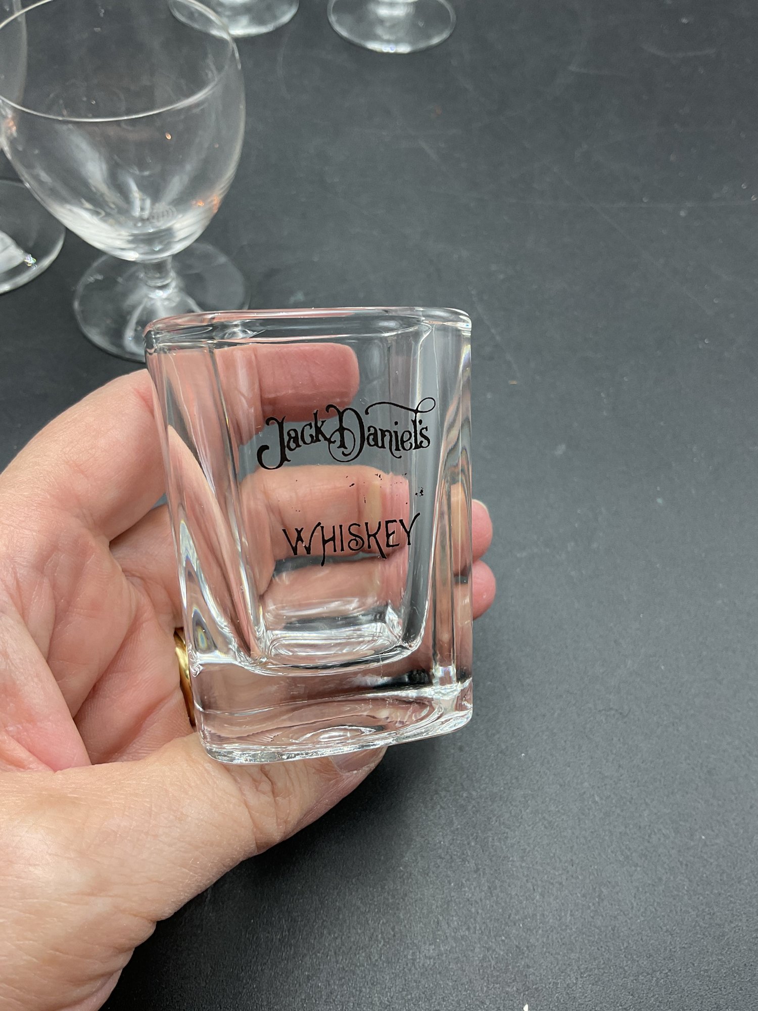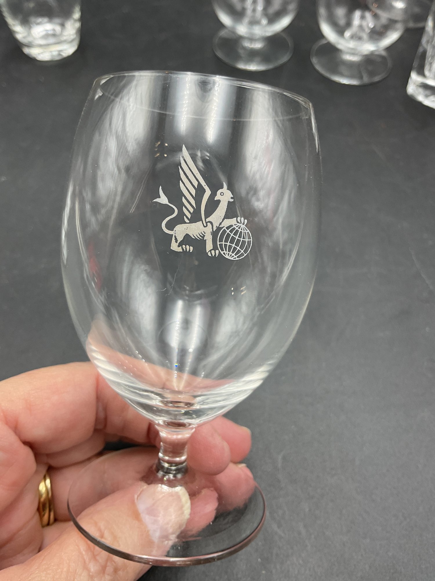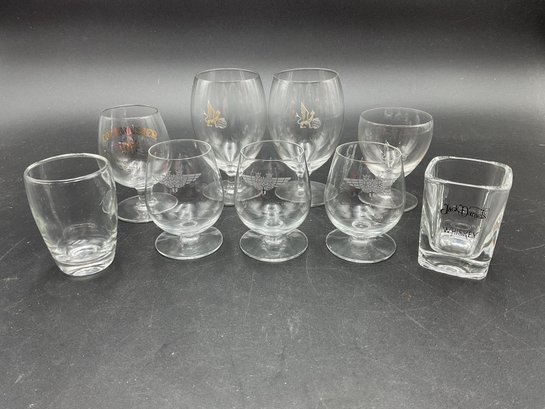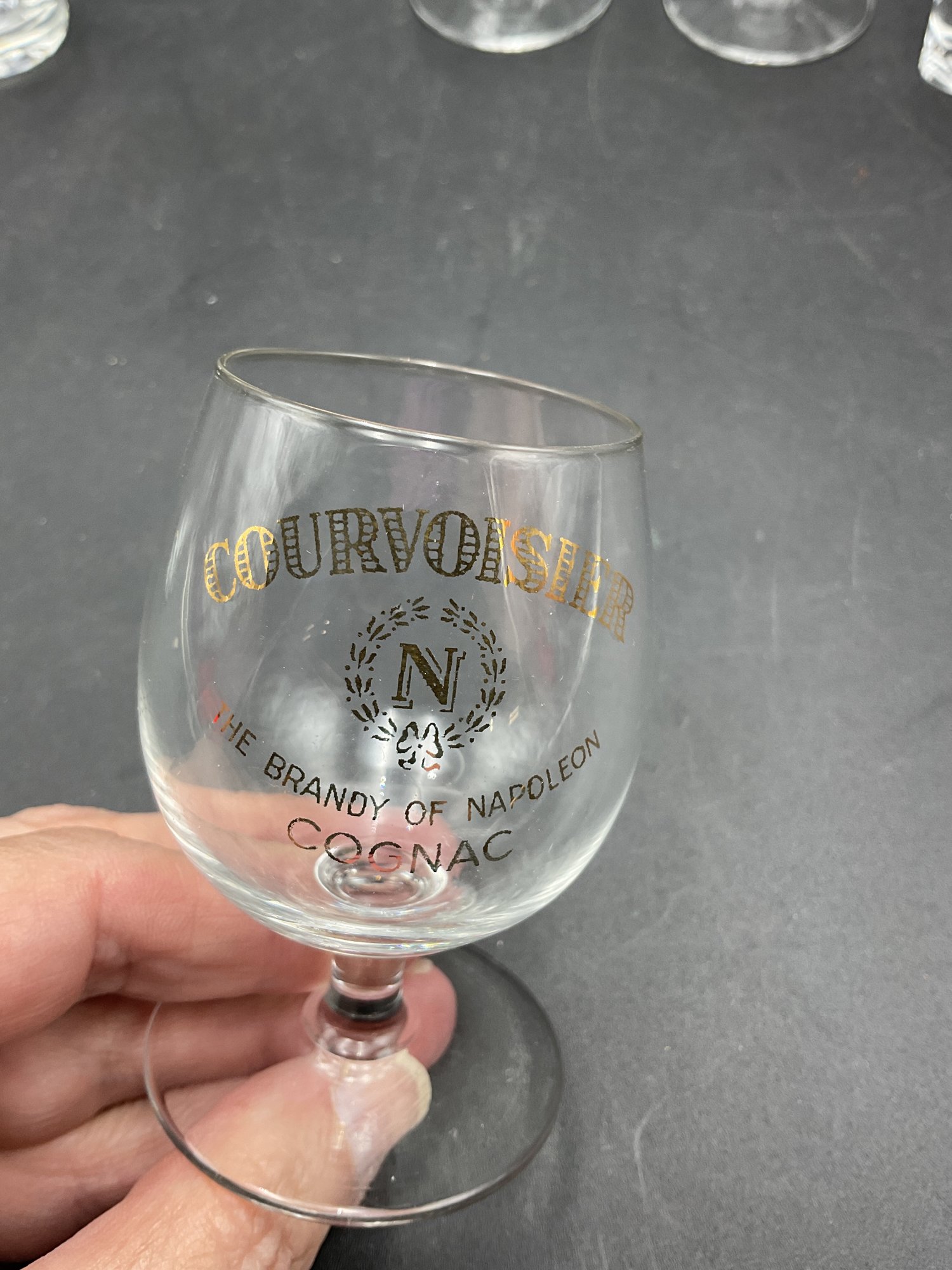 Assorted brandy and cognac snifters plus a couple shot glasses, all believed to be vintage. All in great condition, no chips or cracks. Includes 3 from SAS (Scandinavian Airlines vintage logo), 1 Courvoisier, 3 with unidentified griffin and globe logo, 1 Jack Daniels shot glass and one clear double shot glass.