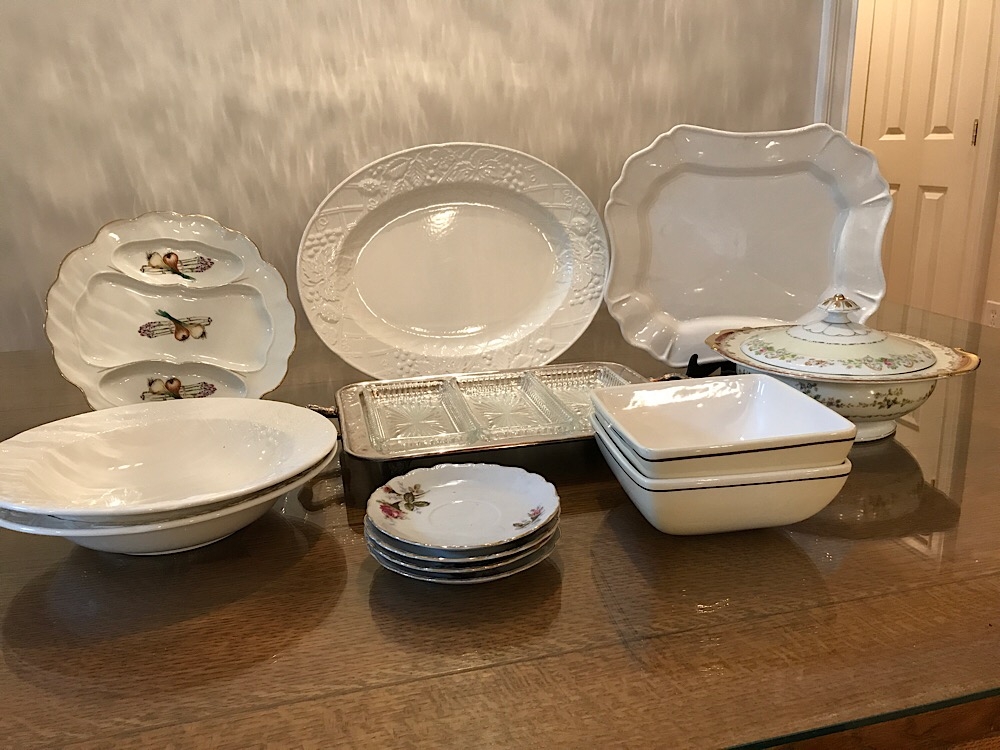 Two white platters, vintage Leonard silverplate & glass relish and condiment dish with feet. Floral plate Occupied Japan and more.