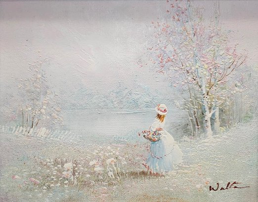Pastel Lady By A Lake, oil on canvas, signed by Walton. This painting shows a lady standing by a calm lake. She’s wearing a vintage white dress that blends with the soft colors of the scene. The lake reflects the light pastel shades of the scenery. The background has trees and a gentle landscape. The overall feeling of the painting is peaceful and calm, with a dreamy, impressionist touch. This painting is approx. 14 5/8 x 2 x 12 5/8".