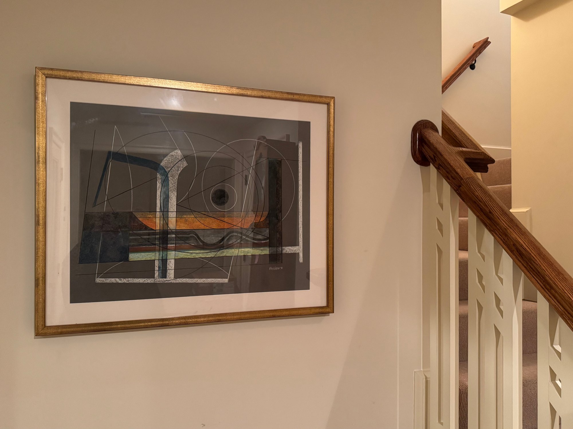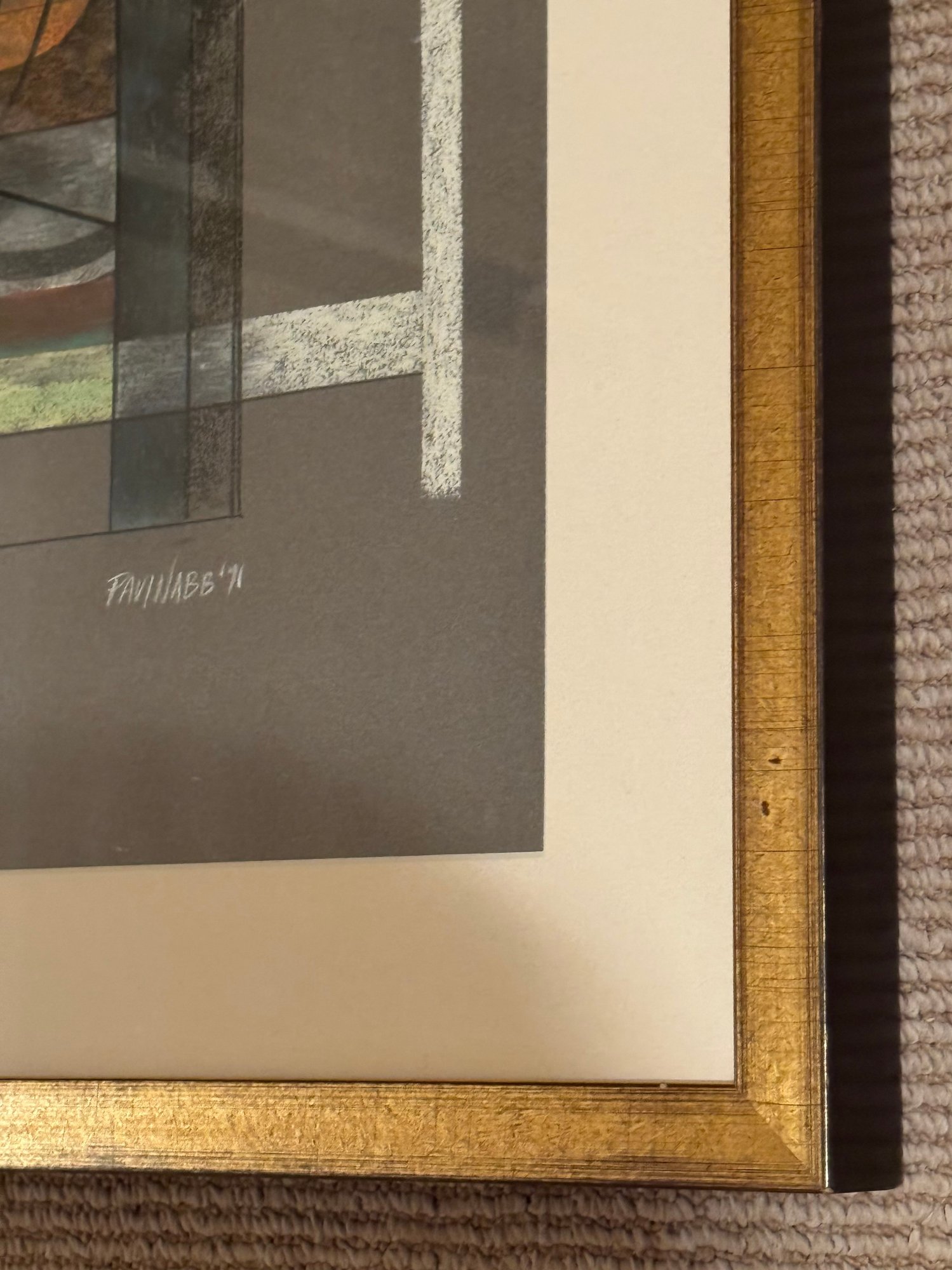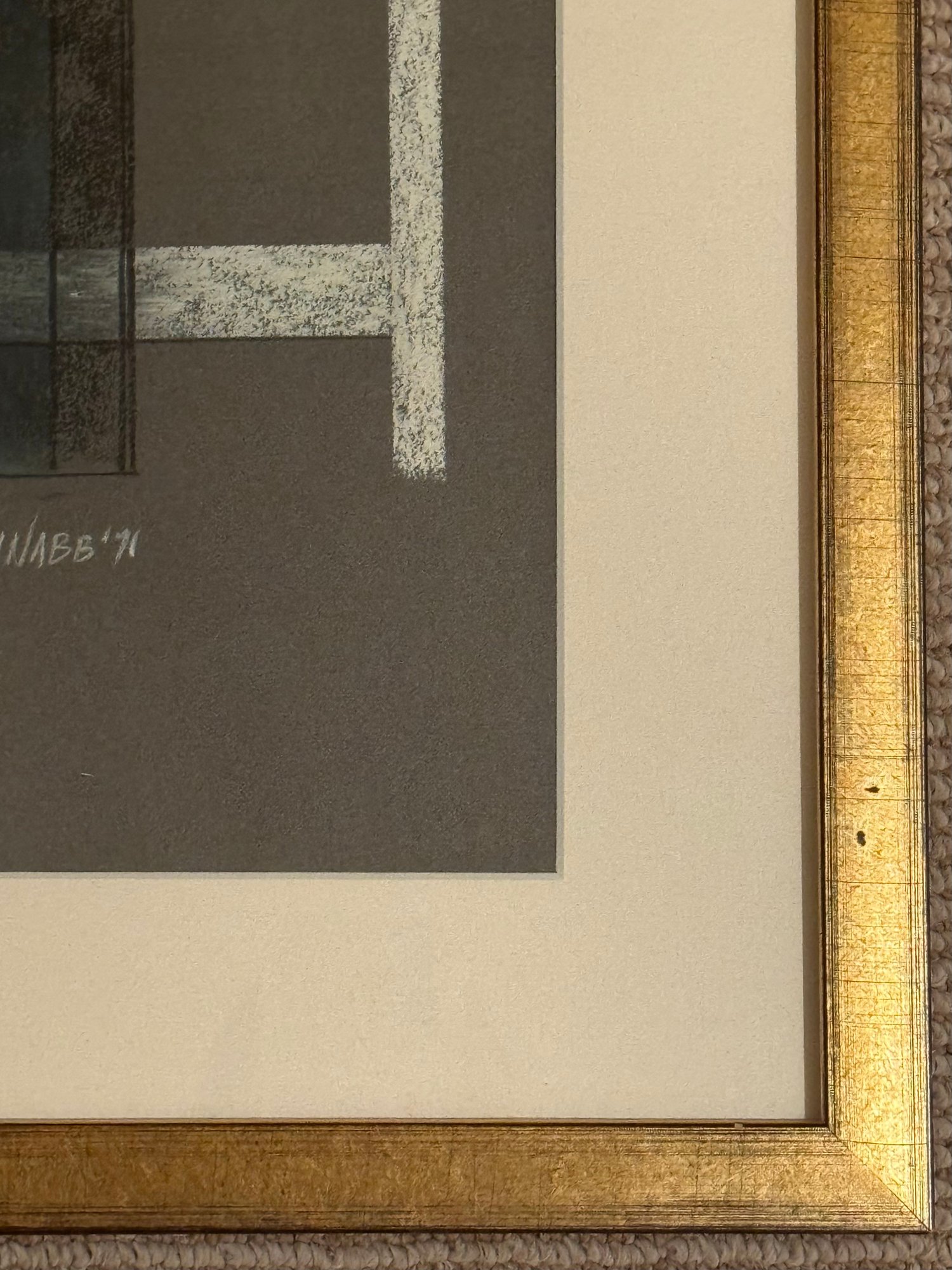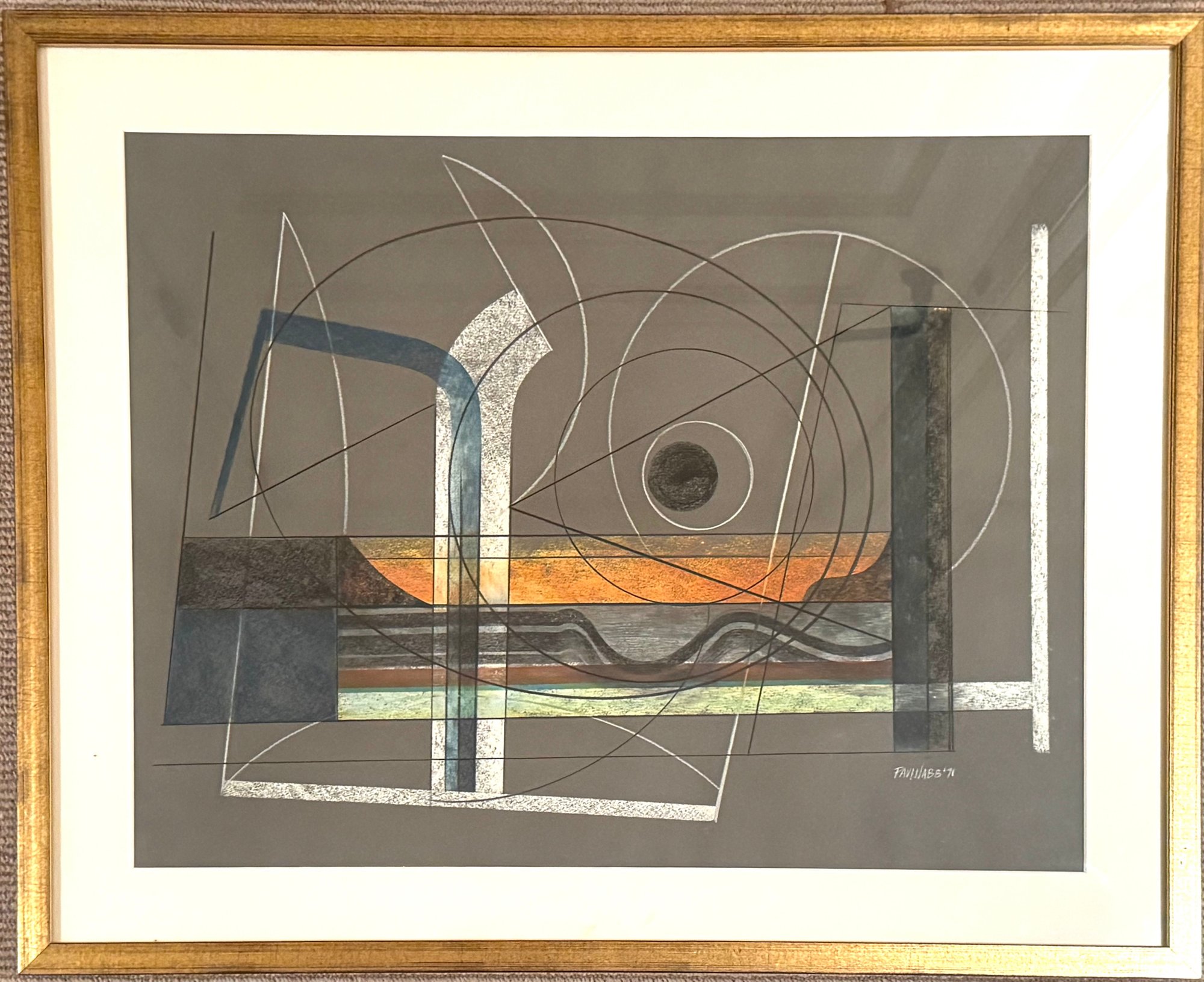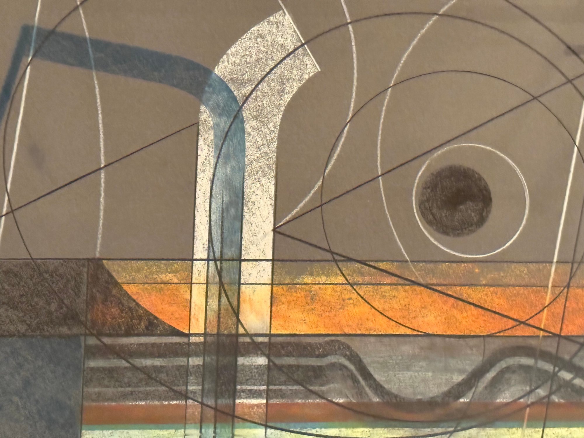 Serene abstract pastel and charcoal drawing by artist Paul with circular motif overlapping horizontal and vertical geometric shapes. Back labels dates pastel 1971. Framed in a wood brushed gilt frame under ivory matt. In very good condition. Size 31 W x 26 H x 1.5 D