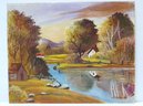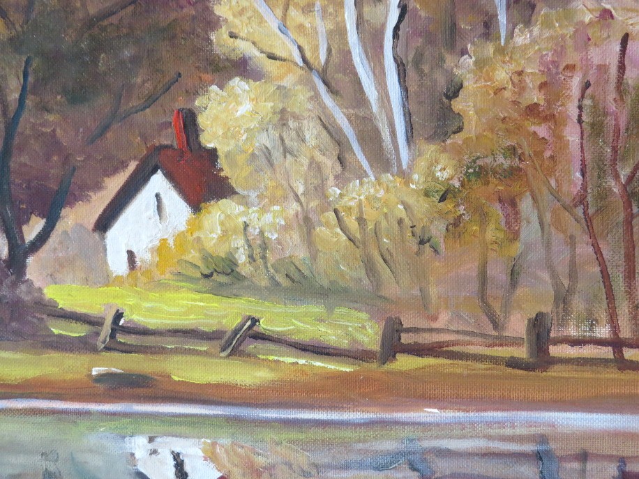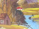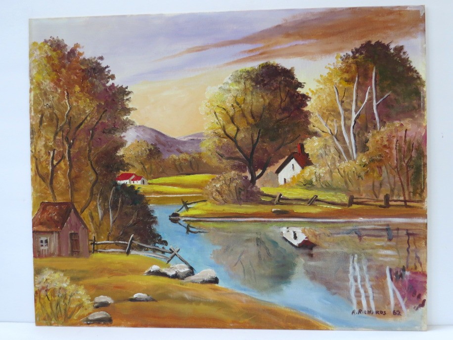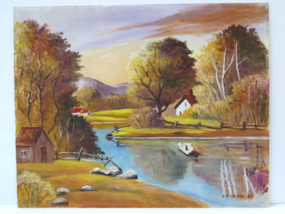 Peaceful country pasture and pond oil on board painting that depicts a serene country lifestyle of New England. Warm golden colors welcome the autumn season. This 16" X 20" painting is signed A. Richards (Arthur A. Richards), 1962. There are 3 other oil on board paintings in this auction by this artist.