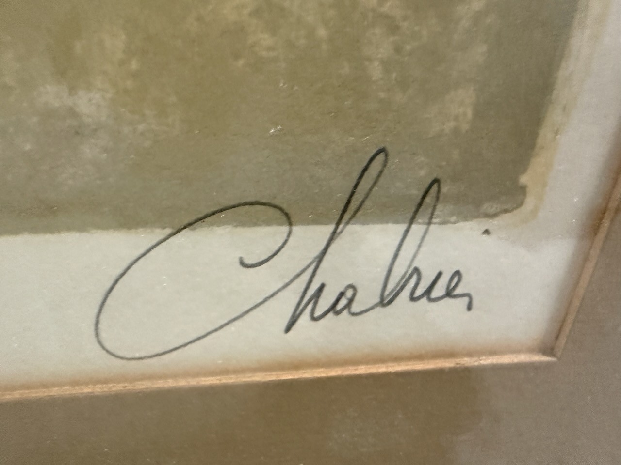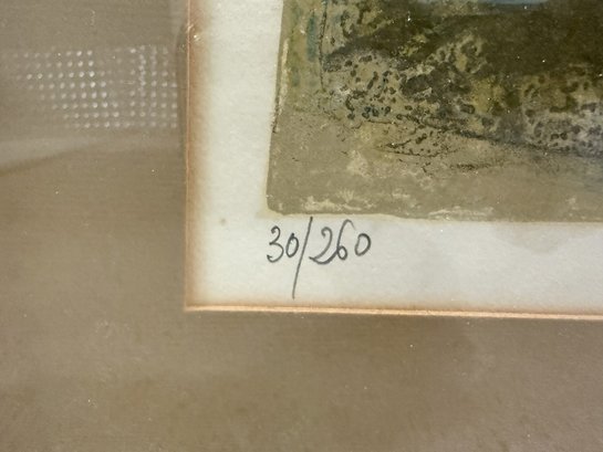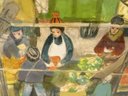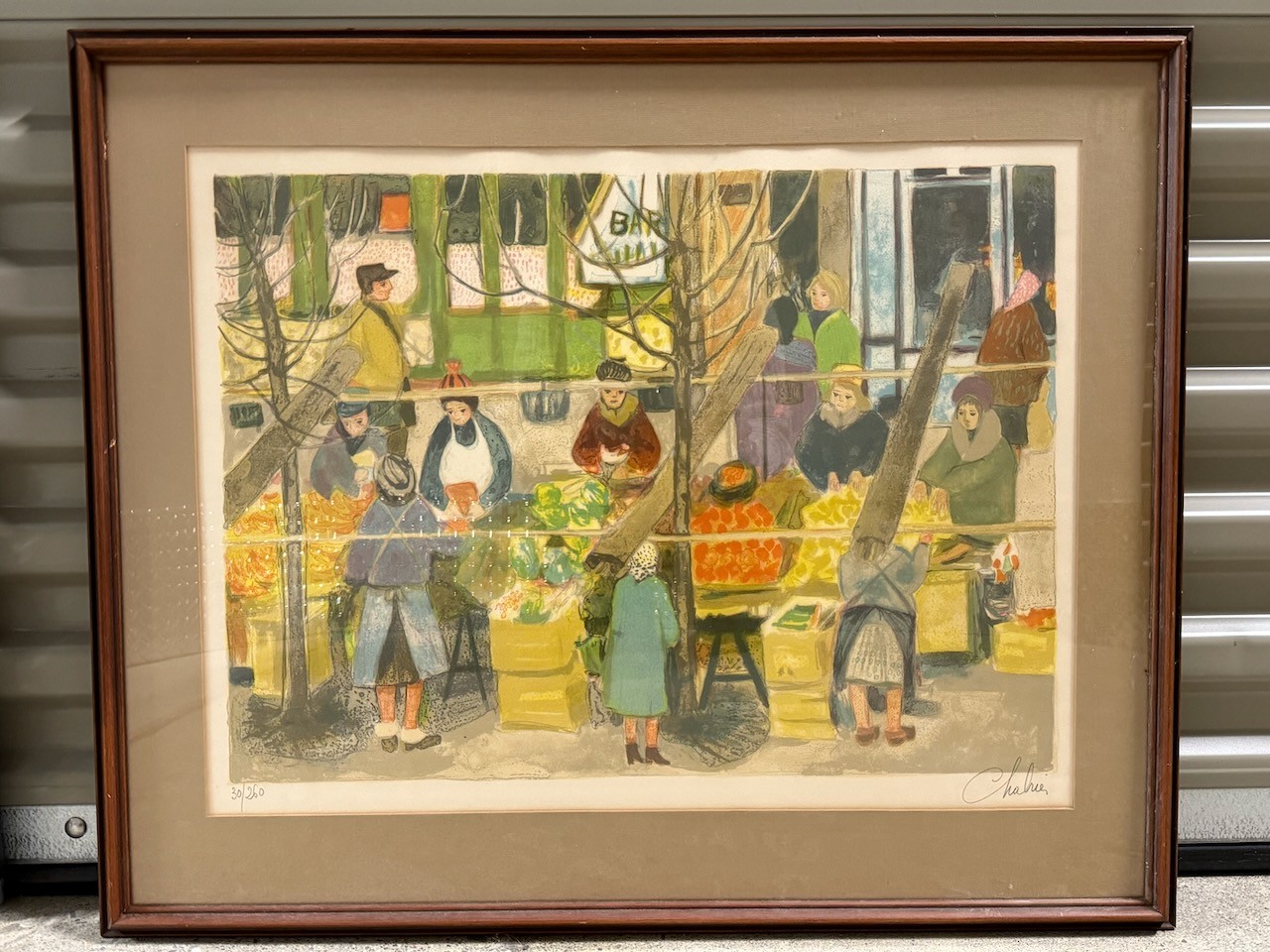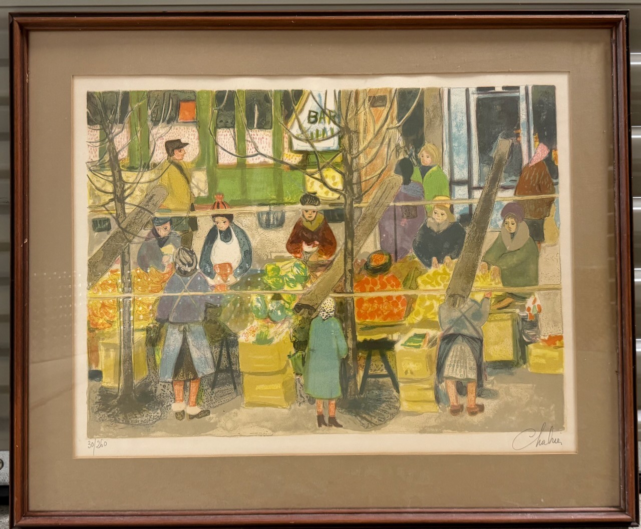 Nathalie Chabrier (French, b. 1932) "Le Maraicher" lithograph depicting a vibrant market scene with yellow stalls holding a variety of produce as figures gather around. Pencil signed lower right, numbered 30/260 lower left. Displayed behind plexiglass with a light brown mat in a medium brown wood frame. 22.25" x 27" framed