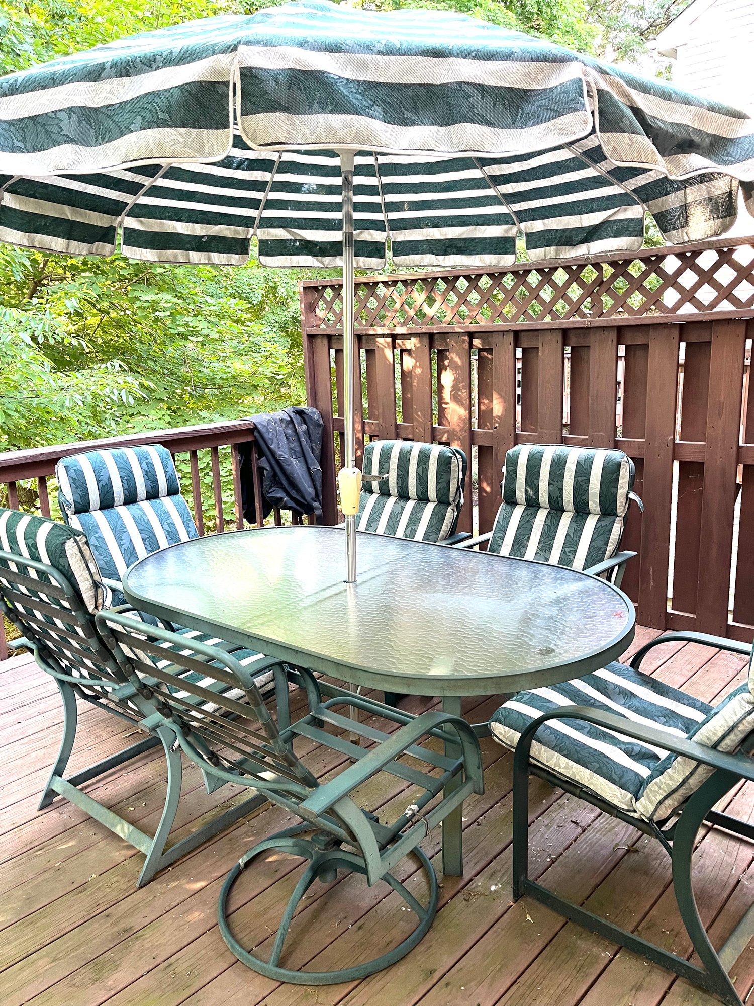 Glass top table and 6 chairs, two need to be re-strapped and one is missing a cushion, umbrella is in good condition but the base was left out over the winter and has cracked.