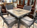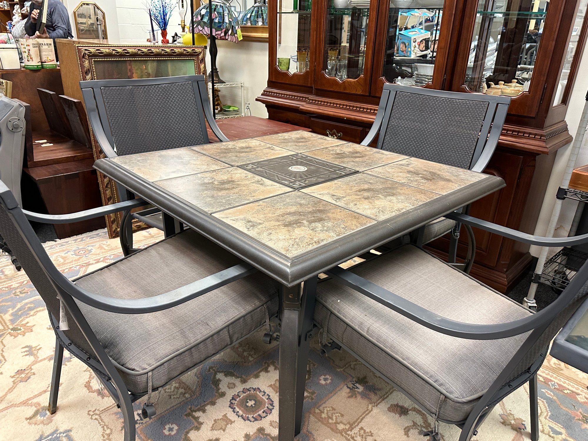 table 40 x 29 with umbrella hole chairs a-a 24 x 37 cushions are removable missing one cushion