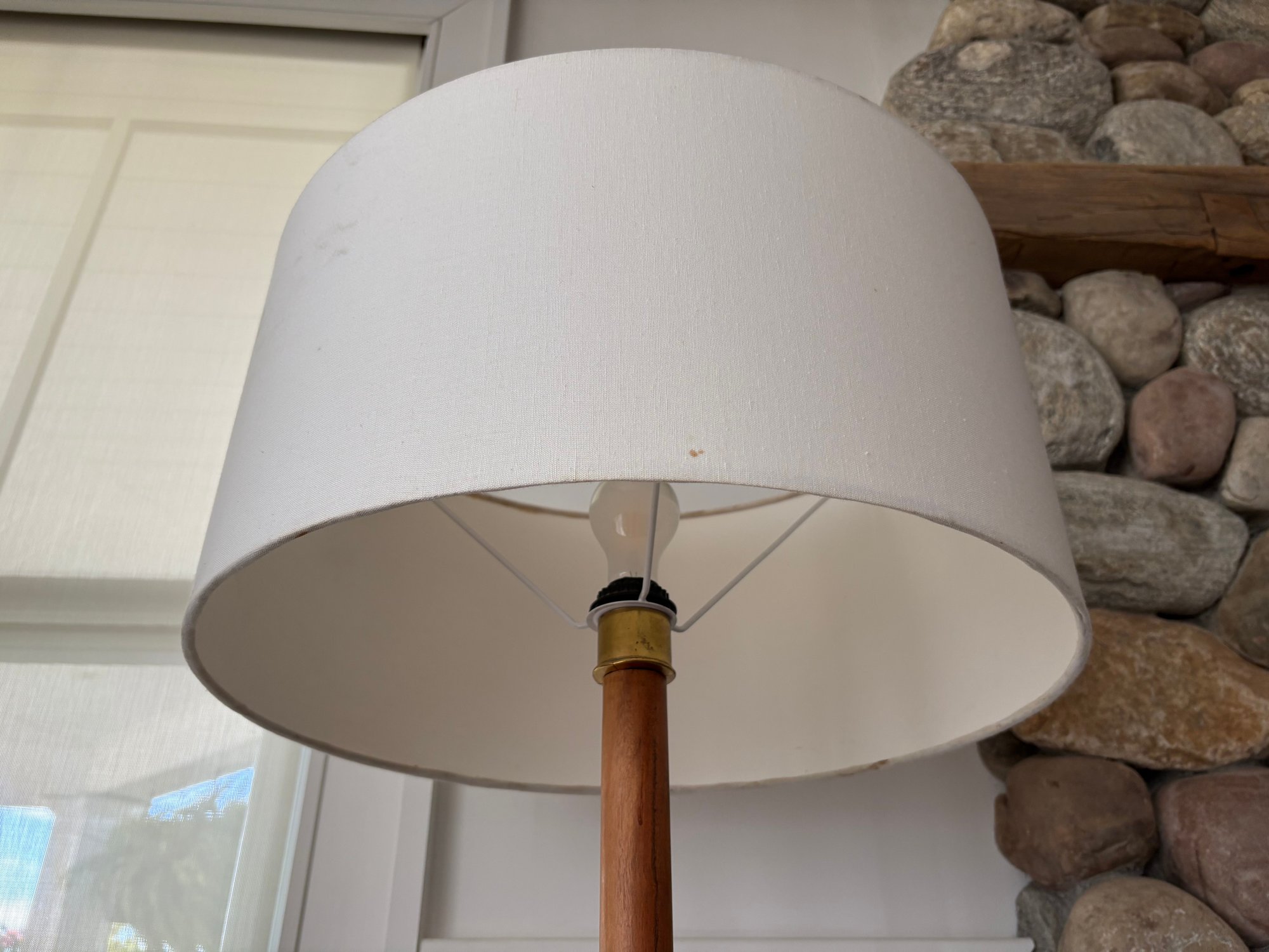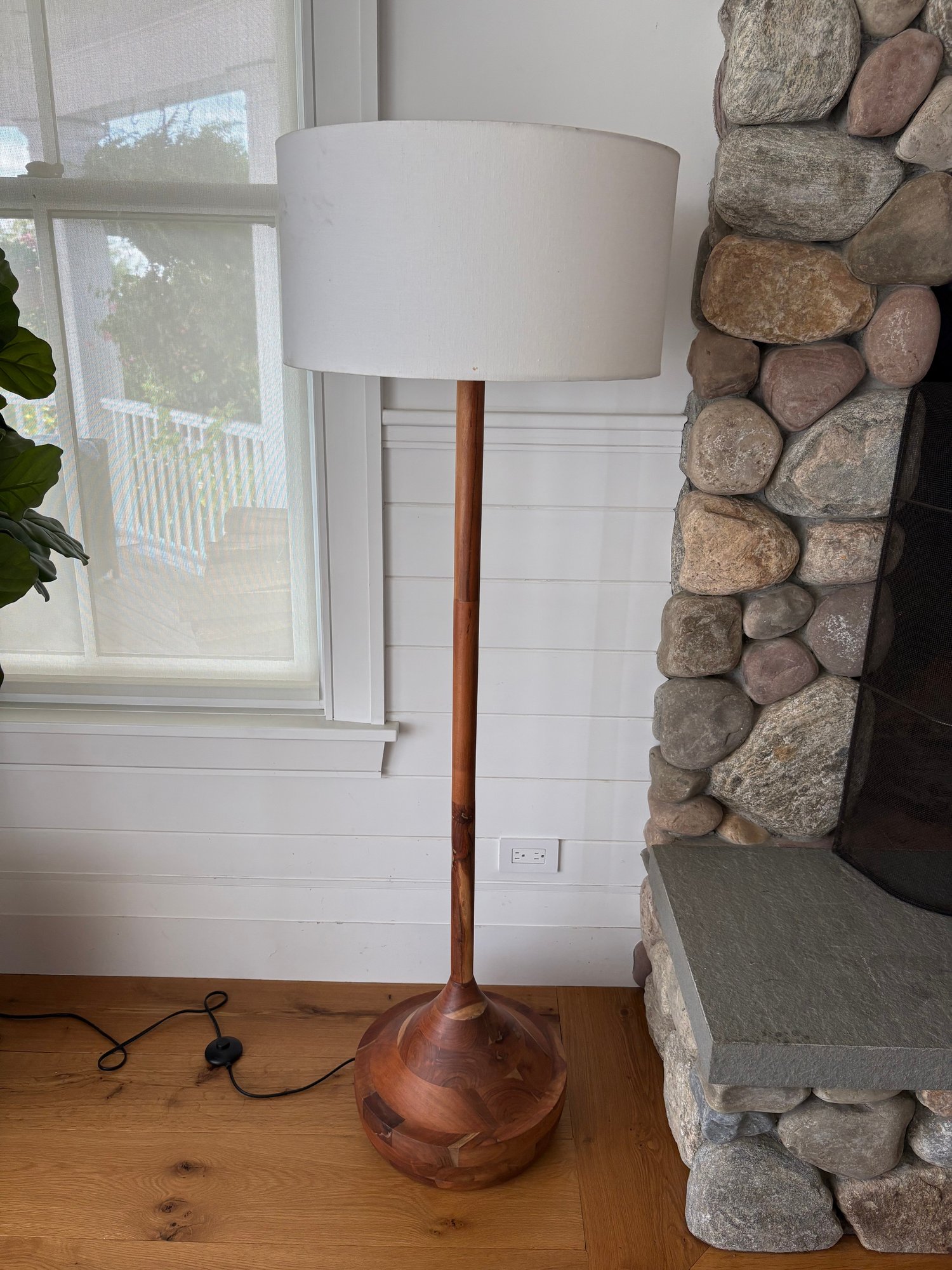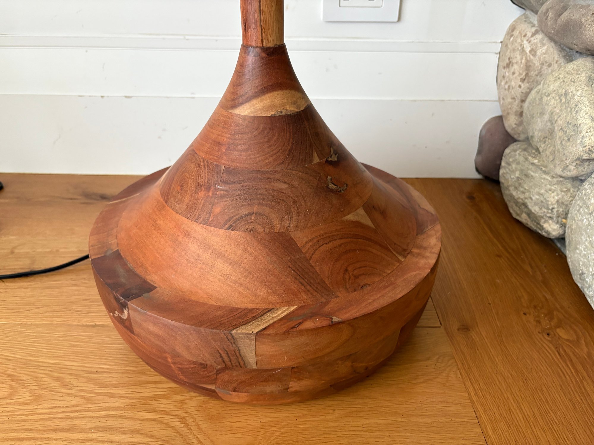 Floor lamp featuring a sleek, minimalist design with a tall, slender wooden pole and a substantial, rounded wooden base. It is topped with a large, cylindrical white lampshade, which provides soft, diffused lighting.