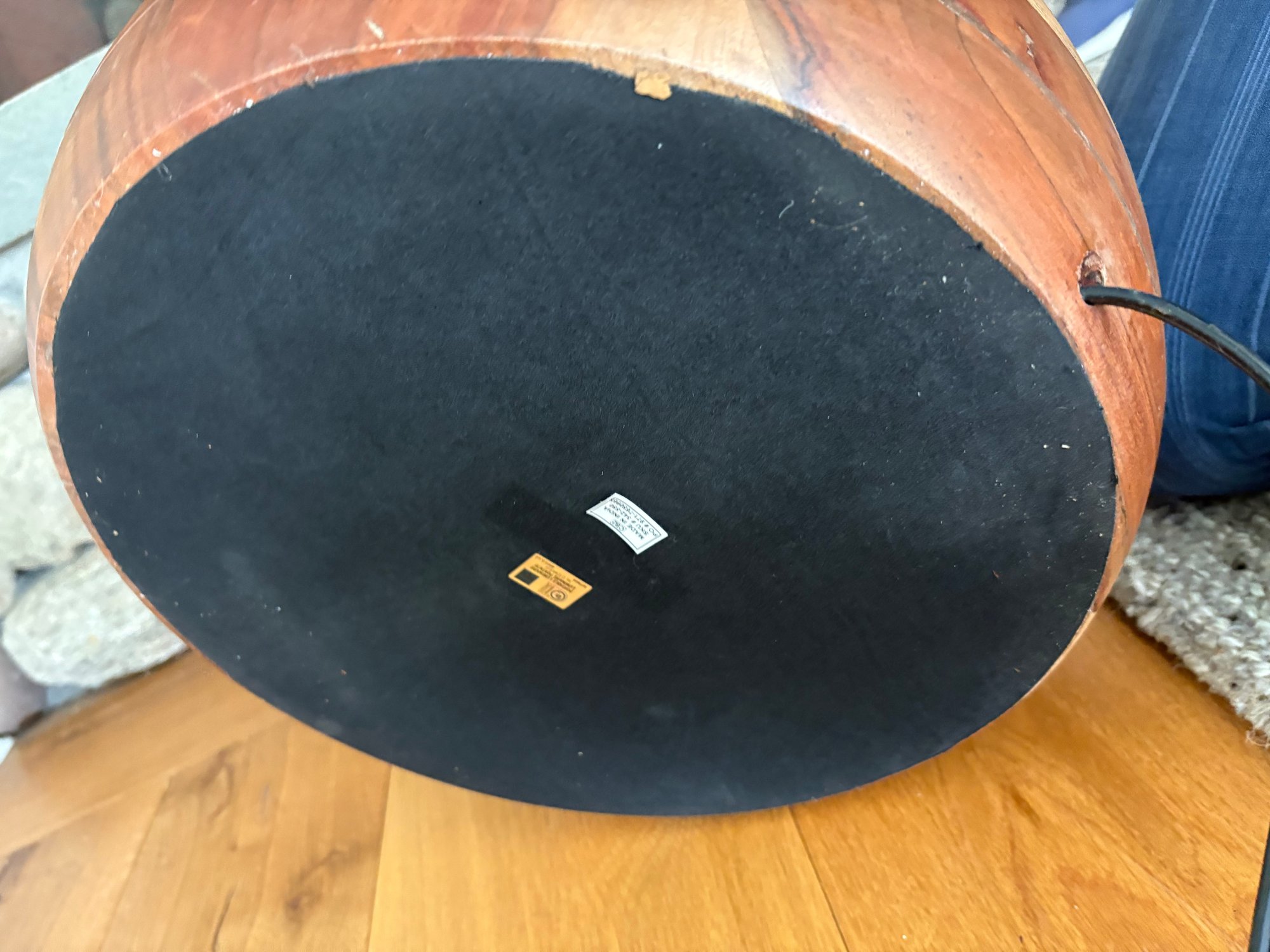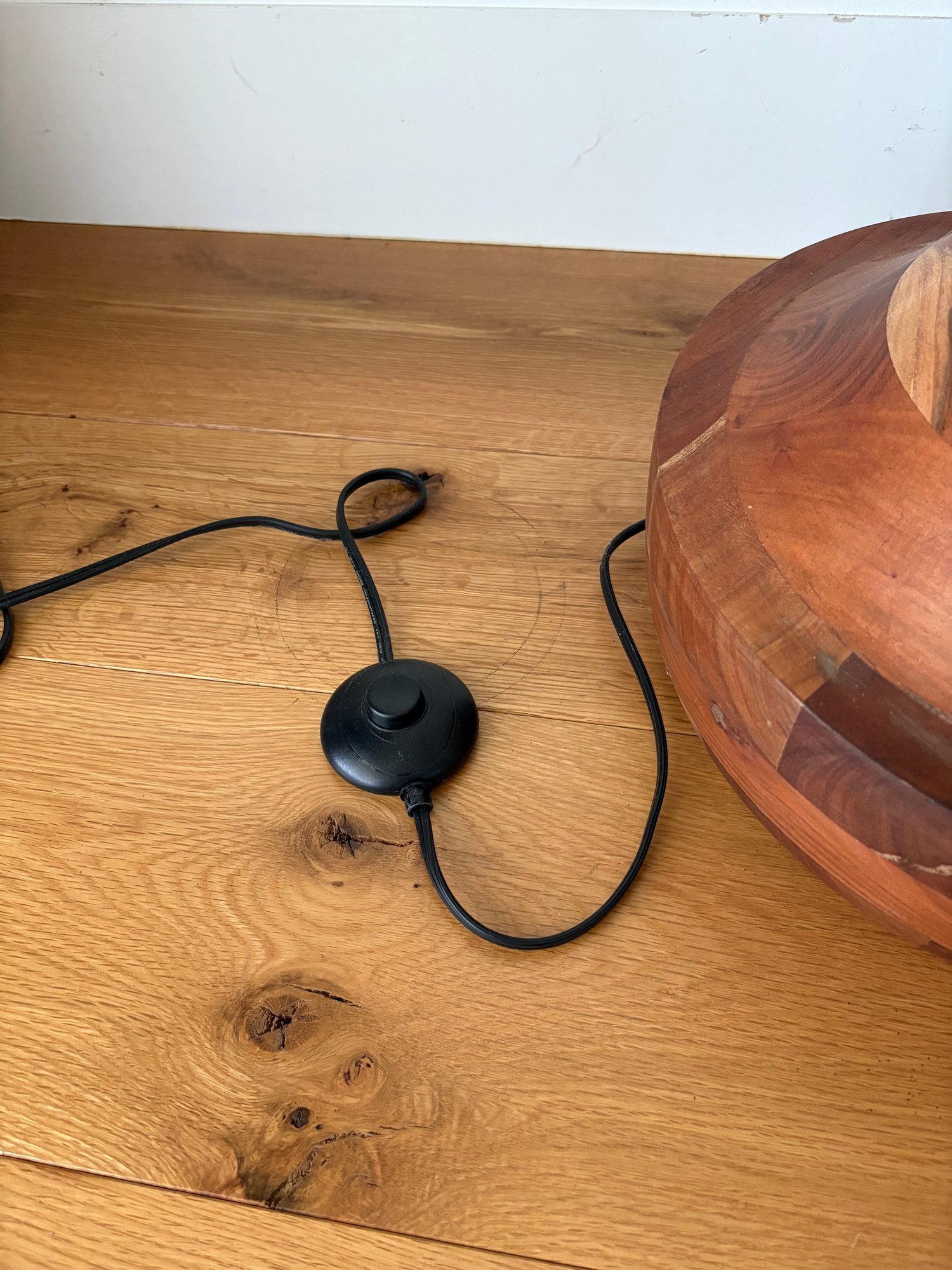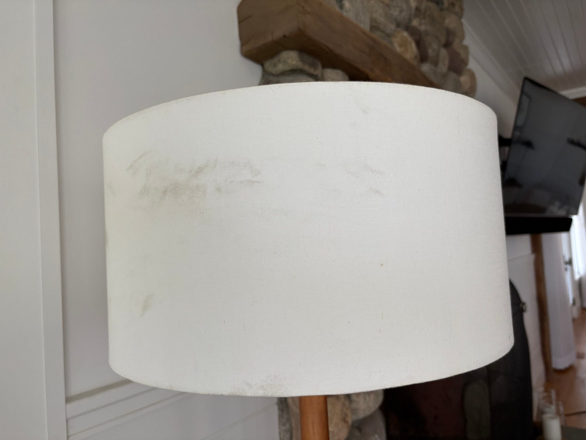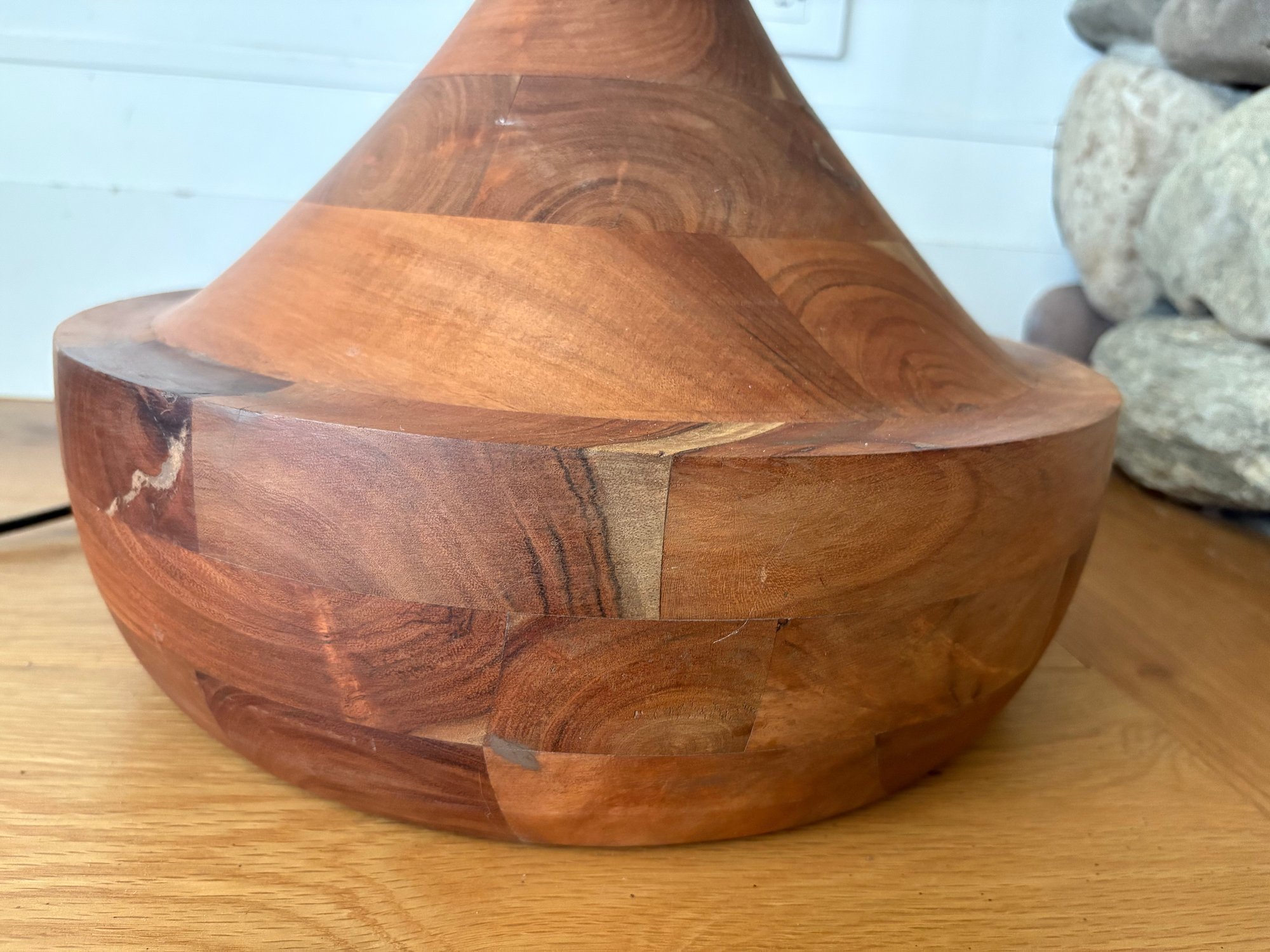 Floor lamp featuring a sleek, minimalist design with a tall, slender wooden pole and a substantial, rounded wooden base. It is topped with a large, cylindrical white lampshade, which provides soft, diffused lighting.