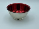 Lovely bowl with red acrylic liner. Marked Paul Revere Reproduction Oneida USA on the bottom. Believed to be silverplate as it has some tarnish and looks like silver. In good condition with scuffs and scratches from age and use