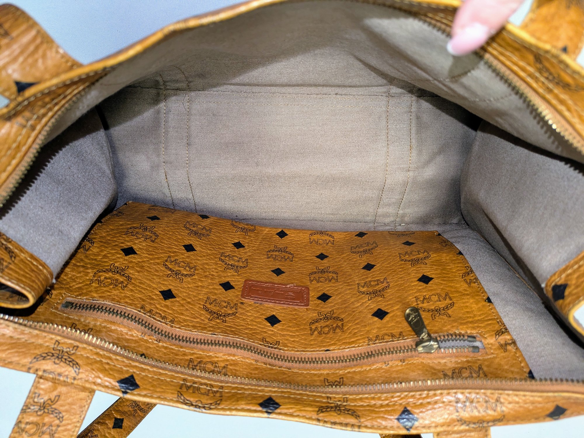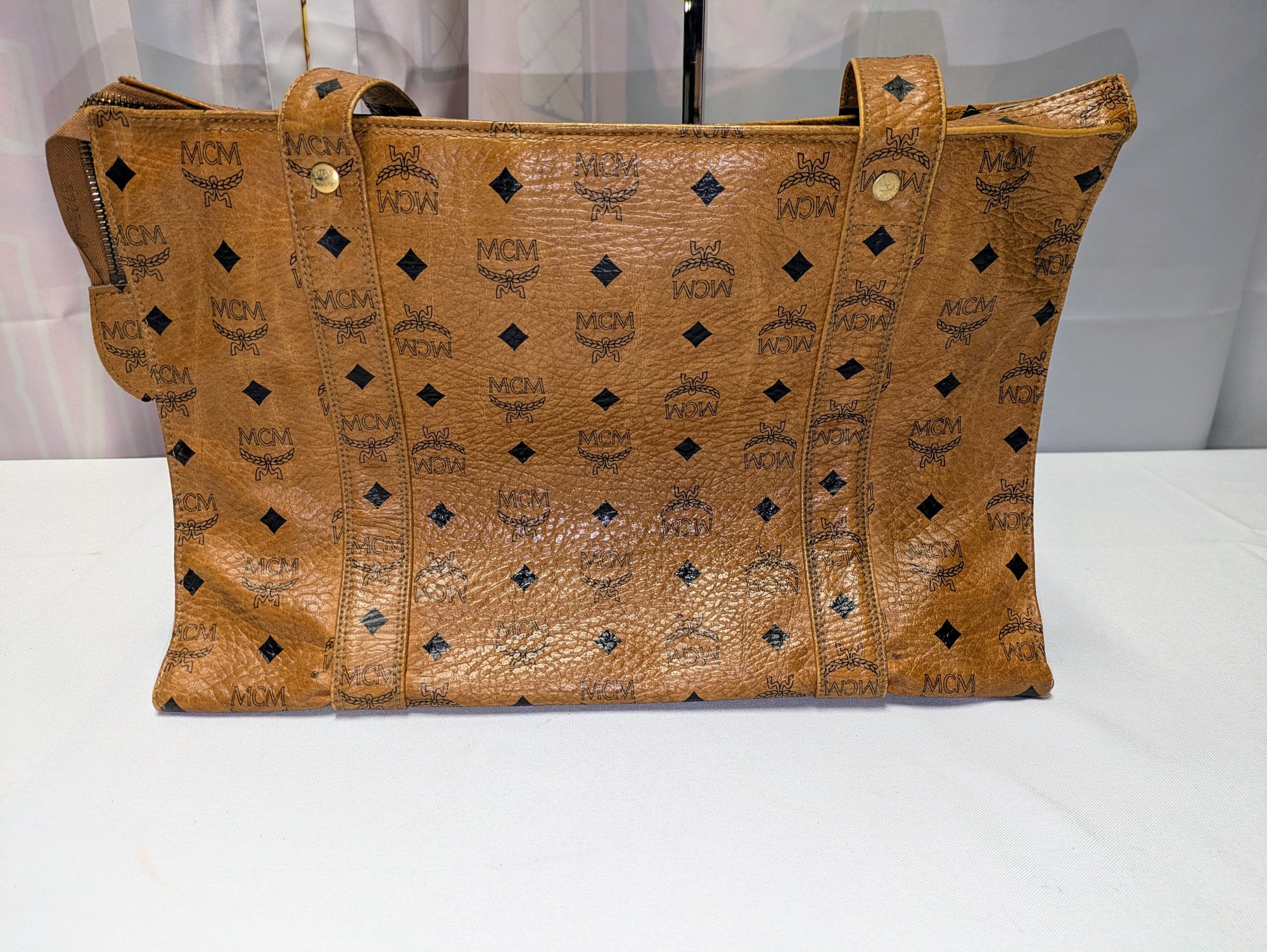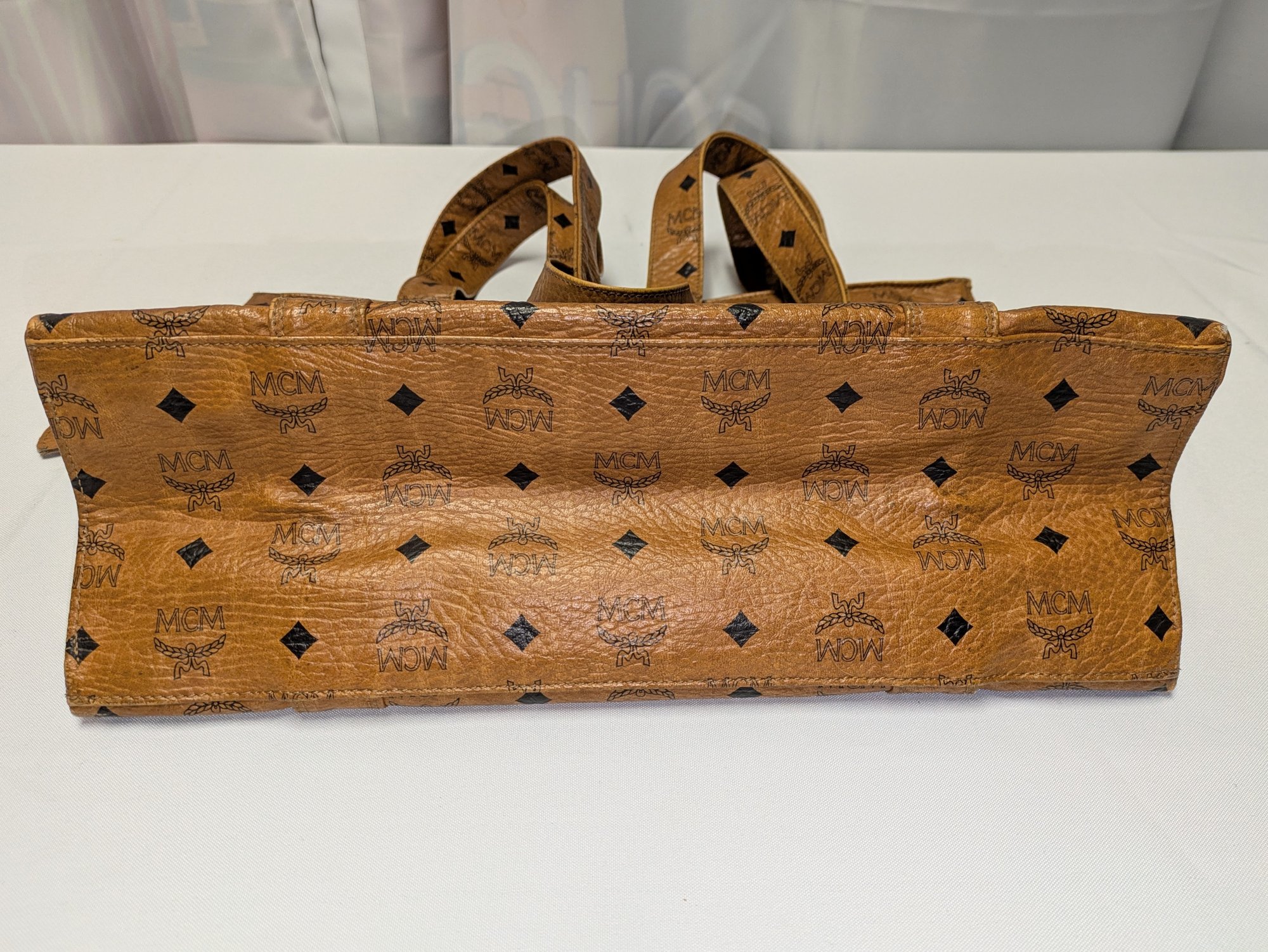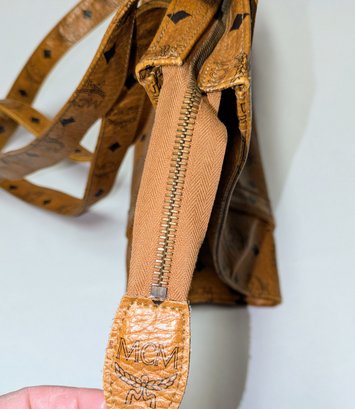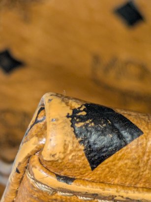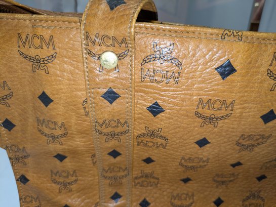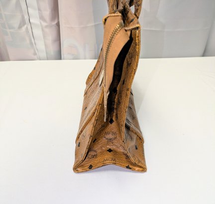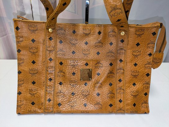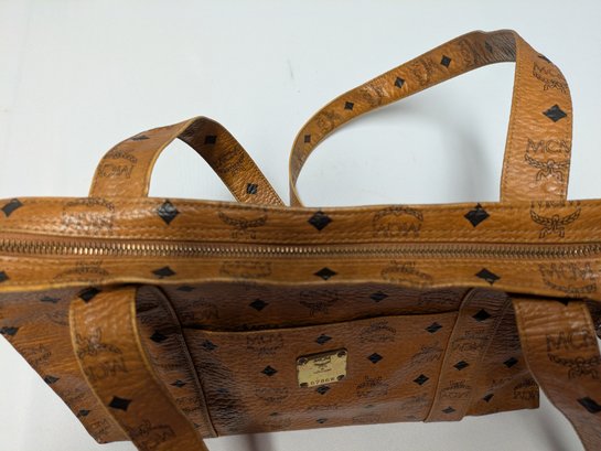 This classic MCM bag features the Signature Design Crafted from a combination of signature canvas and leather trim. A spacious tote bag, often referred to as a "shopper tote" due to its large capacity and suitability for daily use or travel. Features: leather top handles (non-adjustable), a top zipper closure, as well as interior and exterior pockets, and gold-tone hardware. Callouts: Some small rubs and wear on the bottom corners, and gold hardware consistent with age and use. Overall, Very Good Vintage Condition. Please see all photos as part of the description and condition. Drop 16" / Bag 10.5"H x 15" W x 5.5"D.