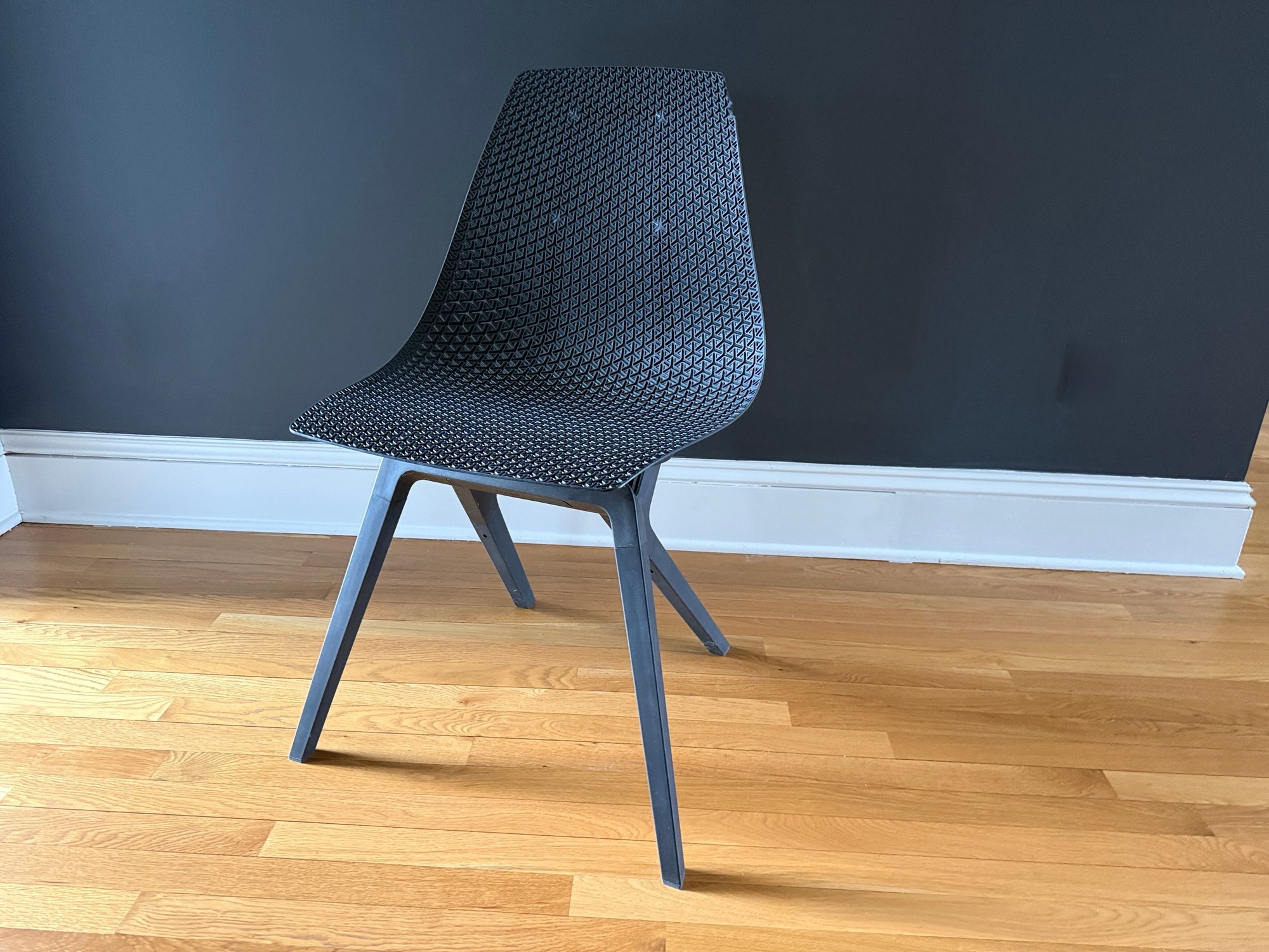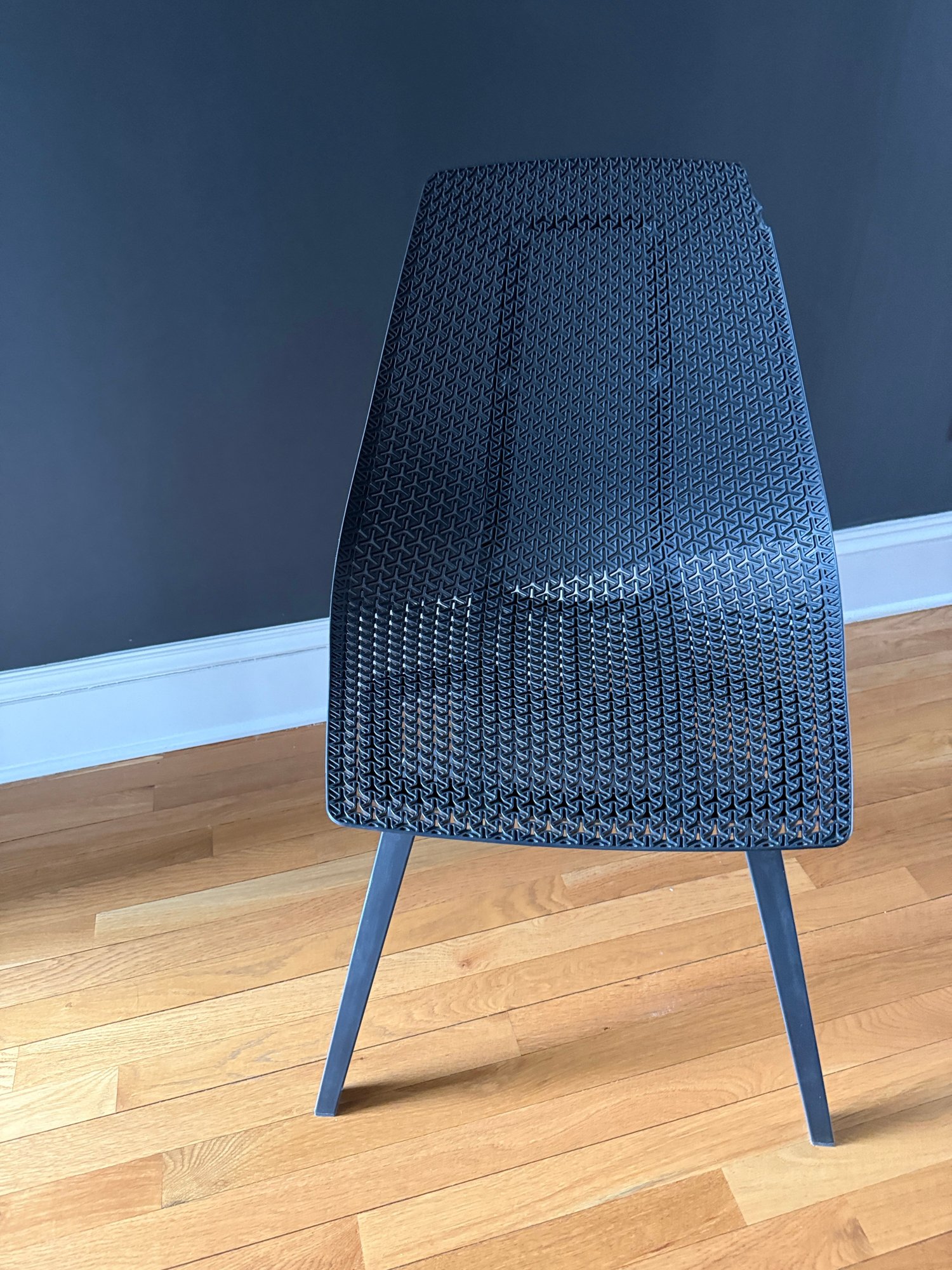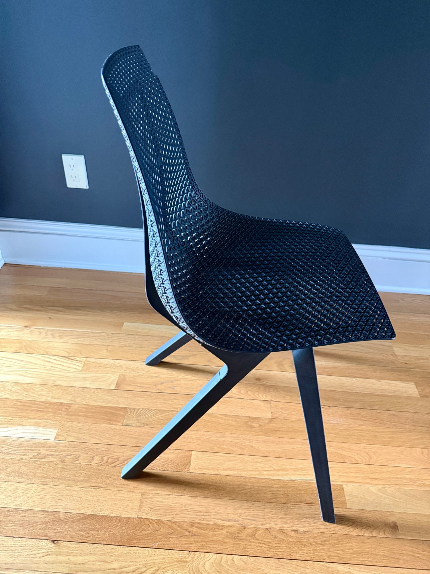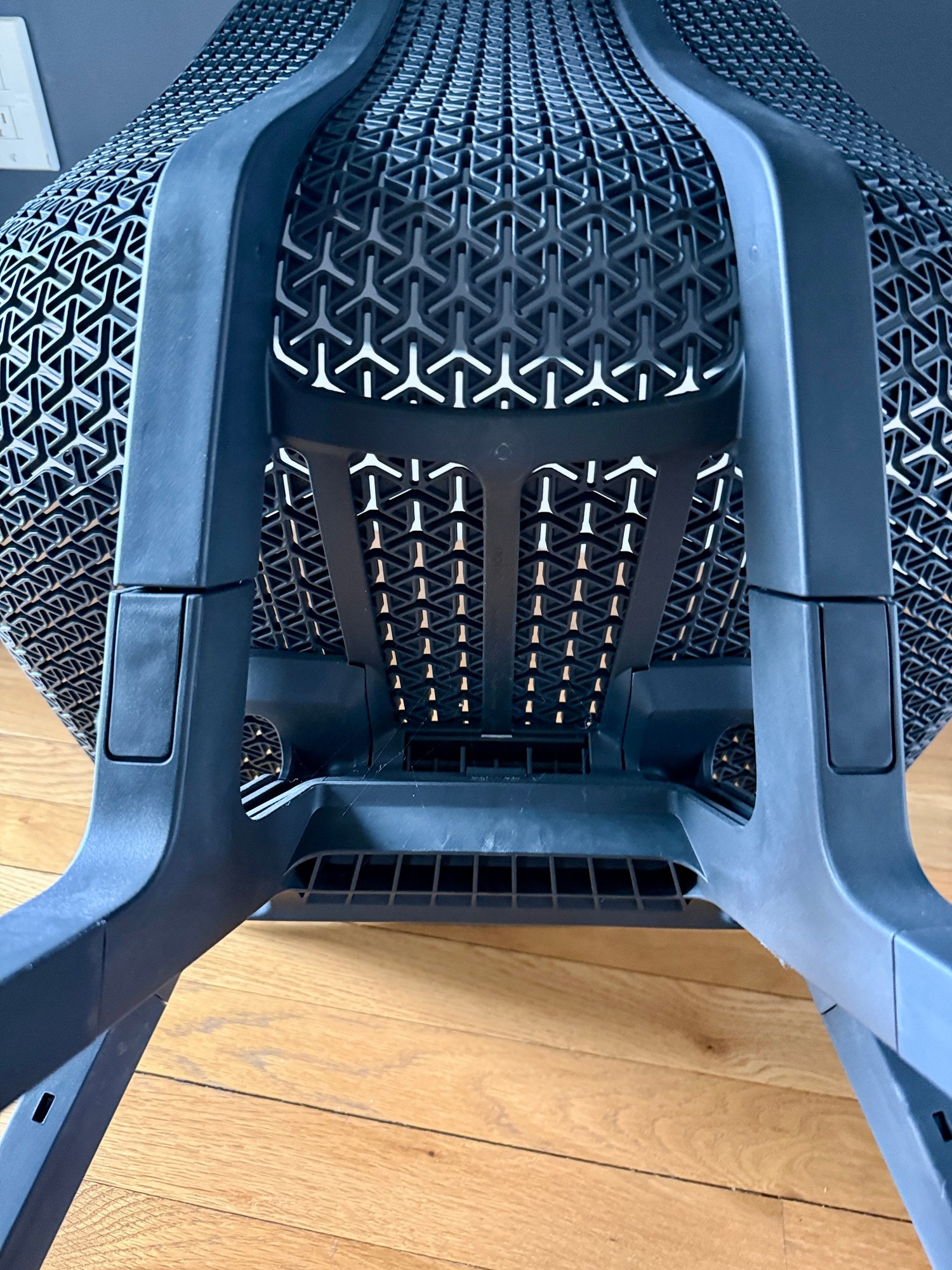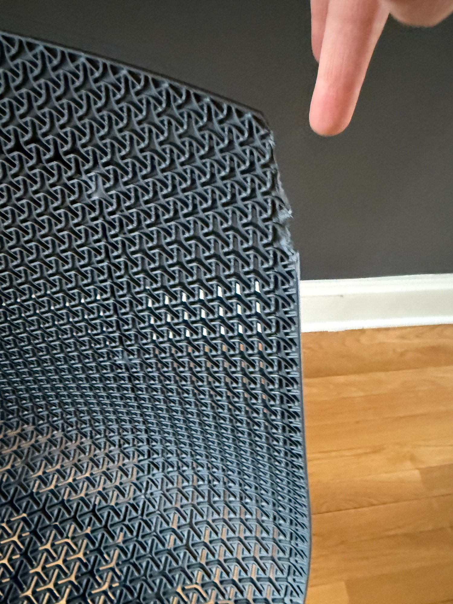 Top corner has broken edge (see photo). Chair fully functional and presents well ovrall.