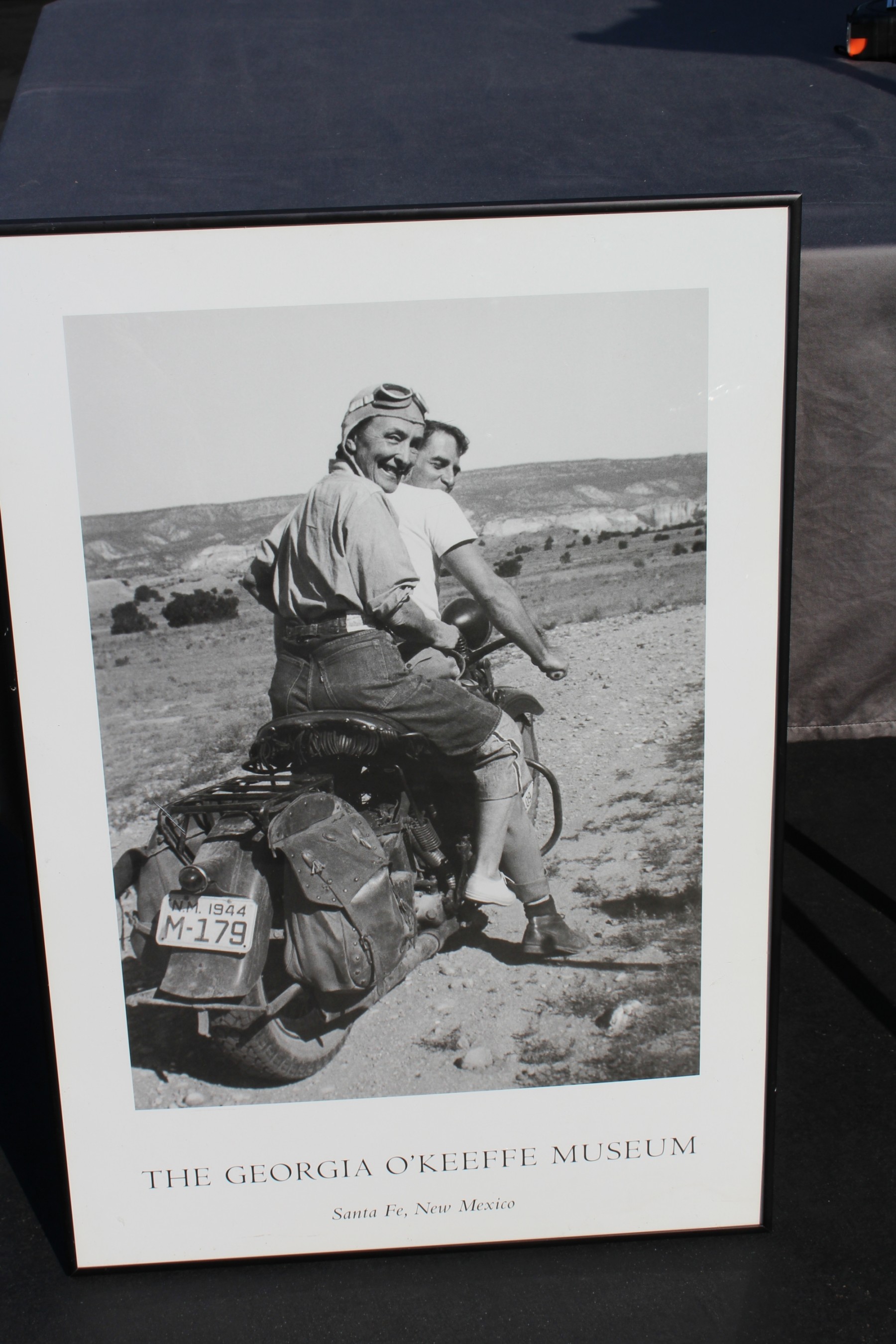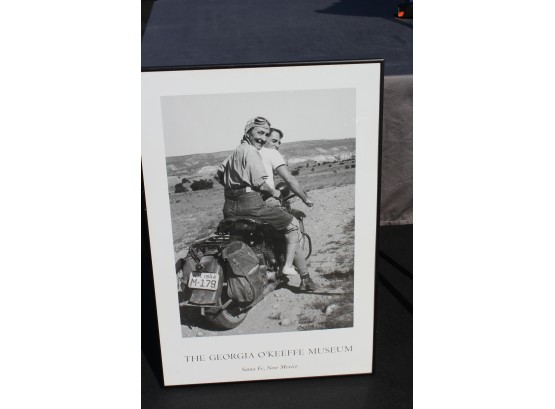 Fantastic B&W poster print of Georgia O'Keefe on a motorcycle from the Georgia O'Keefe Museum. in Santa Fe, New Mexico. 29.5 x 20 framed, a classic illustration of how she lived as an artist and a human-being, daring, and so adventurous. Frame may have scuffs and scratches ssociated with age and use.