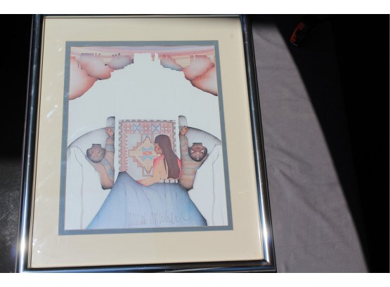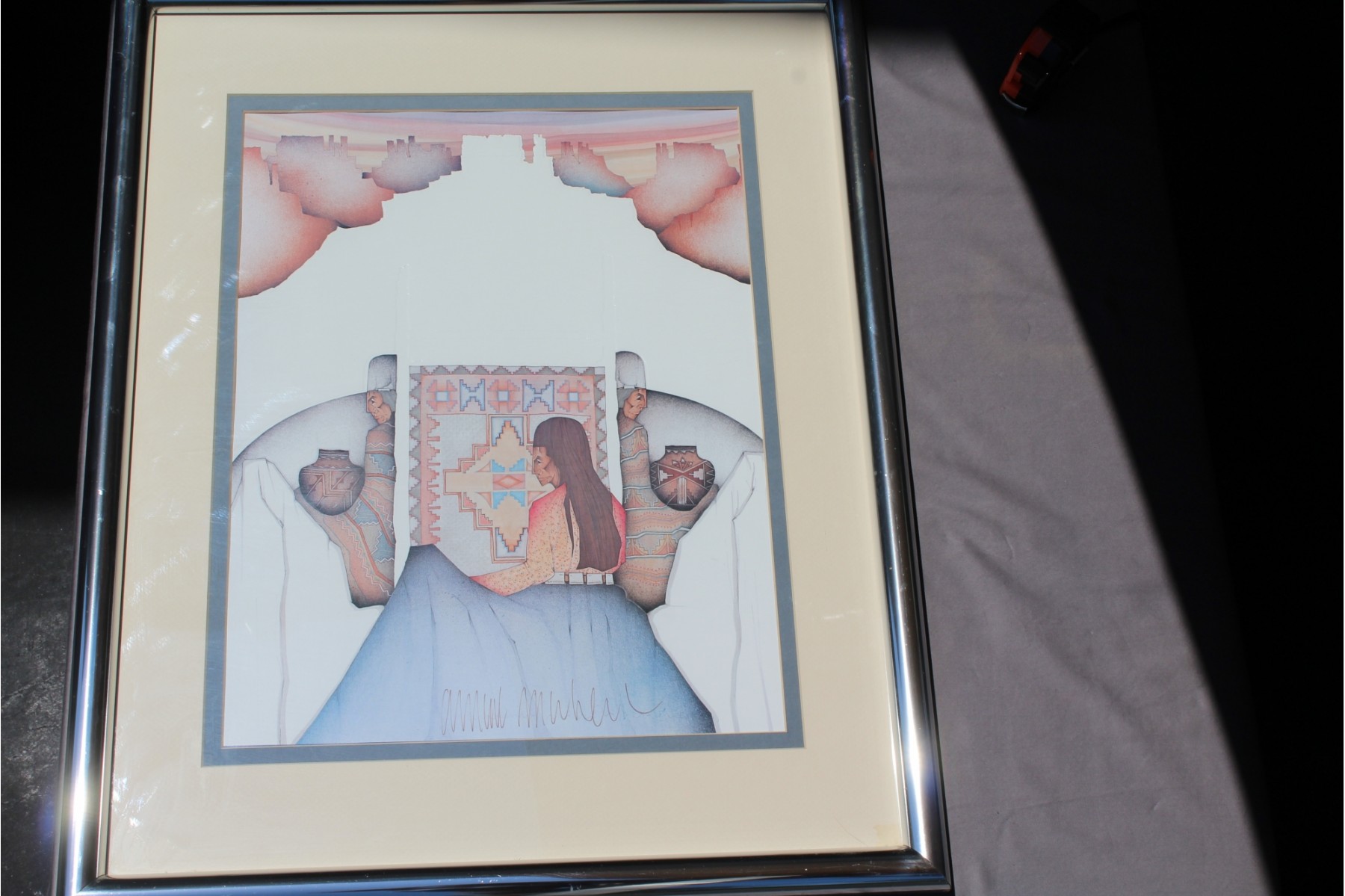 Verified by email per signature, Amado Peña is recognized as an Artisan of the Pascua Yaqui Tribe of Arizona. This is a particularly high honor and one that he cherishes. He is dedicated to furthering the public’s knowledge and interest in the Tribe, its art, its history, and its culture. Amado’s artwork is defined by its bold color and form and dynamic composition. Amado Peña's work is distinctively bold in color, form and dynamic composition. Art is his first love and he has been a successful artist for over 30 years, holding exhibitions all over the United States. This is a large piece 30 x 24" framed, (tarnish on frame), 20 x 15 visible. I have more info on Amado if requested.