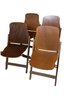 Set of 4 wooden folding chairs in very good condition. Makers labels are gone (one chair had a partial unreadable one), but these are very well made with solid construction and metal caps to protect pivot points. Minor dings and scuffs consistent with age and use. Two have small specks of paint spatter that will likely scrape off easily.
